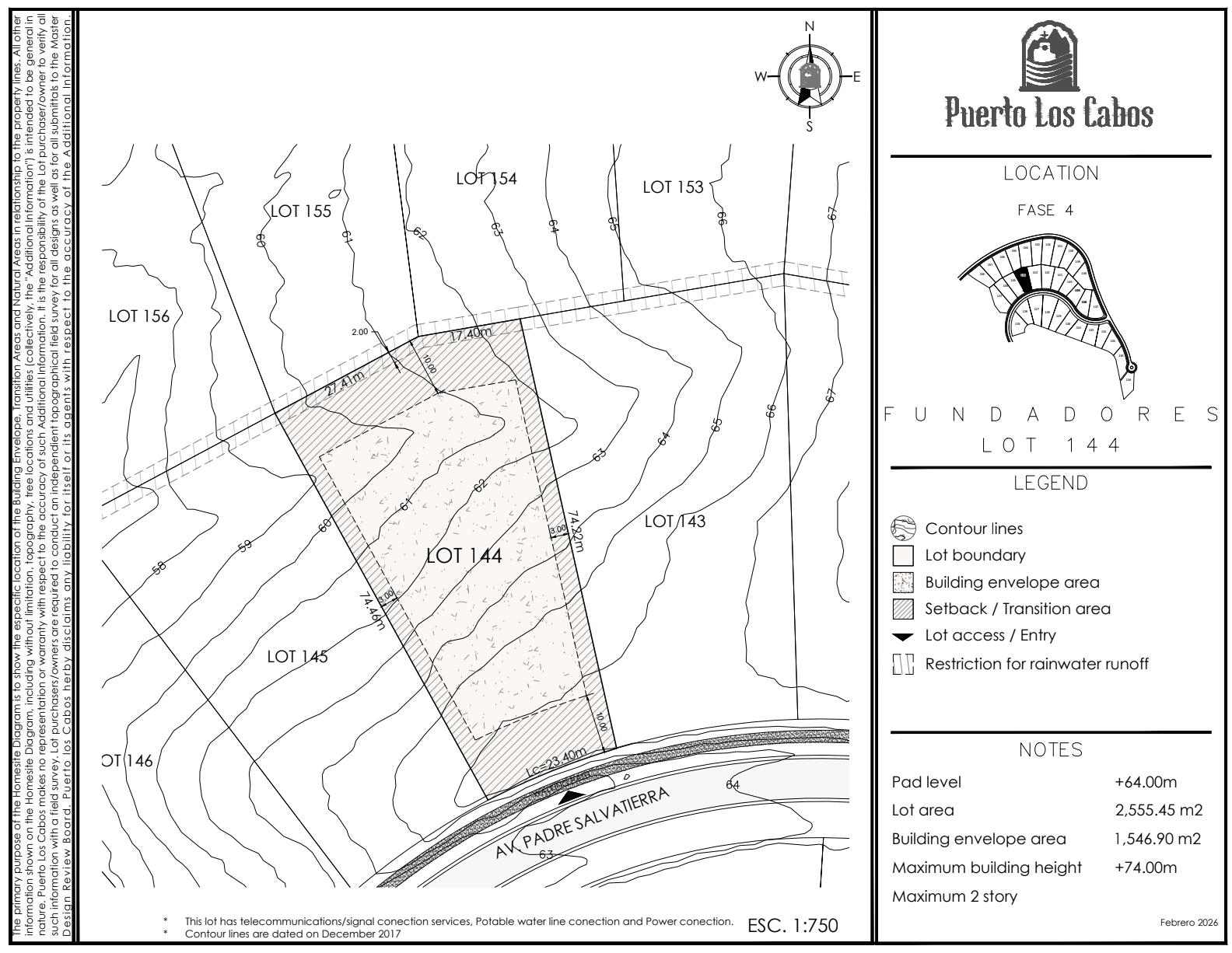 Homesite 144 is located within Fundadores, the founding community of Puerto Los Cabos. Generous in size and centrally positioned, the property offers serene views and full infrastructure within a private residential setting. Nestled between fairways and mountains, the lot is suitable for custom residential design, including the opportunity to build a two-story residence that integrates indoor and outdoor living spaces. The property is located near the Greg Norman Golf Course, the private Beach Club, Zadún, a Ritz-Carlton Reserve, and mountain trails within the Puerto Los Cabos community.