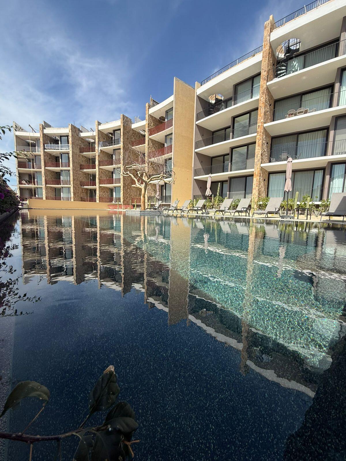 SPACIOUS CORNER UNIT with refined finishes, featuring marble flooring, quartz kitchen countertops, and custom pine cabinetry with Parota veneer. The property stands out for its double-height ceilings, creating exceptional natural light and a spacious, open feel, along with additional corner space that enhances privacy and livability. Located in Balmar, a low-density boutique community in El Tezal, Cabo San Lucas, offering privacy, comfort, and modern living. Amenities include a heated semi-Olympic pool, fully equipped gym, yoga area, spa and wellness zone, pickleball court, and ludoteca. The price is in pesos and is converted to dollars at the exchange rate on the day the offer is signed. $8,312,500 MXN. INCLUDES 2 STORAGES