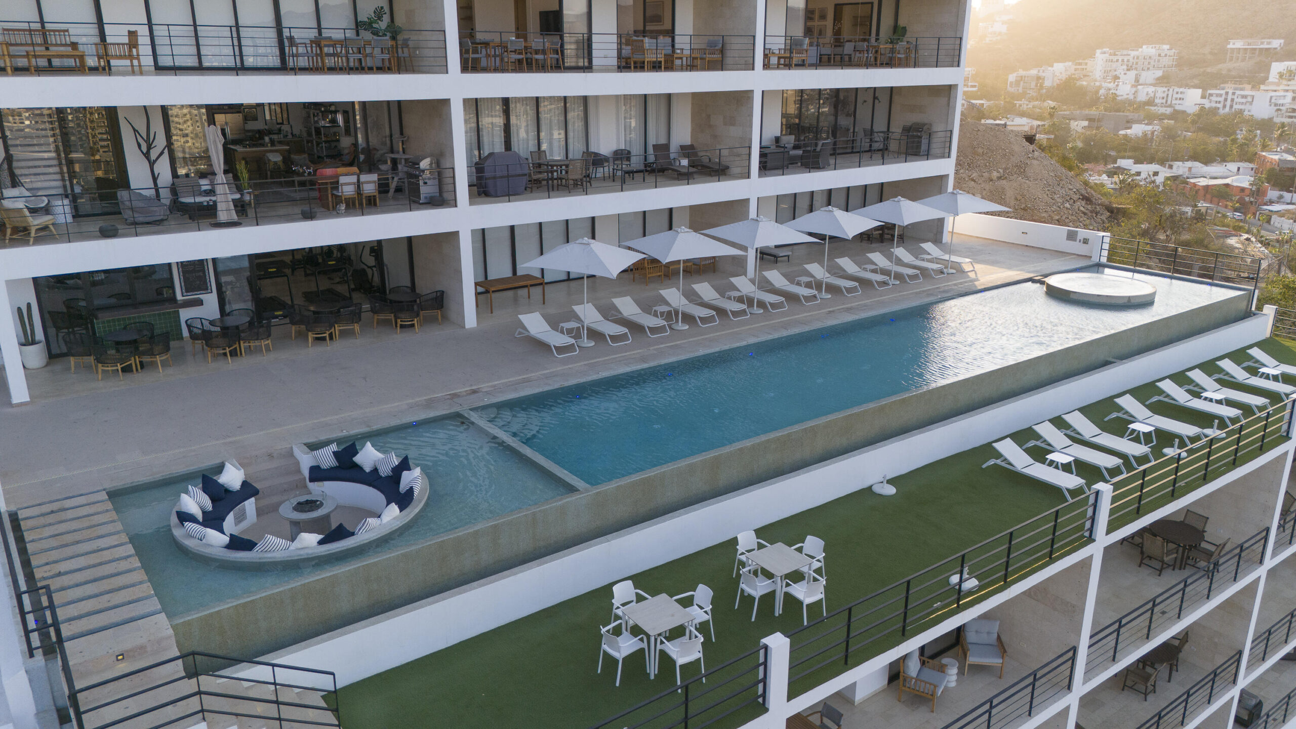 Wake up to captivating ocean and marina views every morning in this modern, fully furnished 2-bedroom, 2-bathroom condo. The condo boasts a sleek, minimalist design and a private terrace, perfect for indoor-outdoor living. Enjoy stunning views of the mountains and vibrant downtown scene, all within walking distance of restaurants, bars, and the marina. Unwind after a day of exploring at the building's pool, jacuzzi, or firepits, or get fit in the gym. This condo also includes one convenient parking spot and a storage unit for added convenience and hurricane shutters for your safety and peace of mind. Located in the prestigious El Pedregal neighborhood of Cabo San Lucas, this condo offers a unique blend of luxury and accessibility. El Pedregal is renowned for its secure, gated community