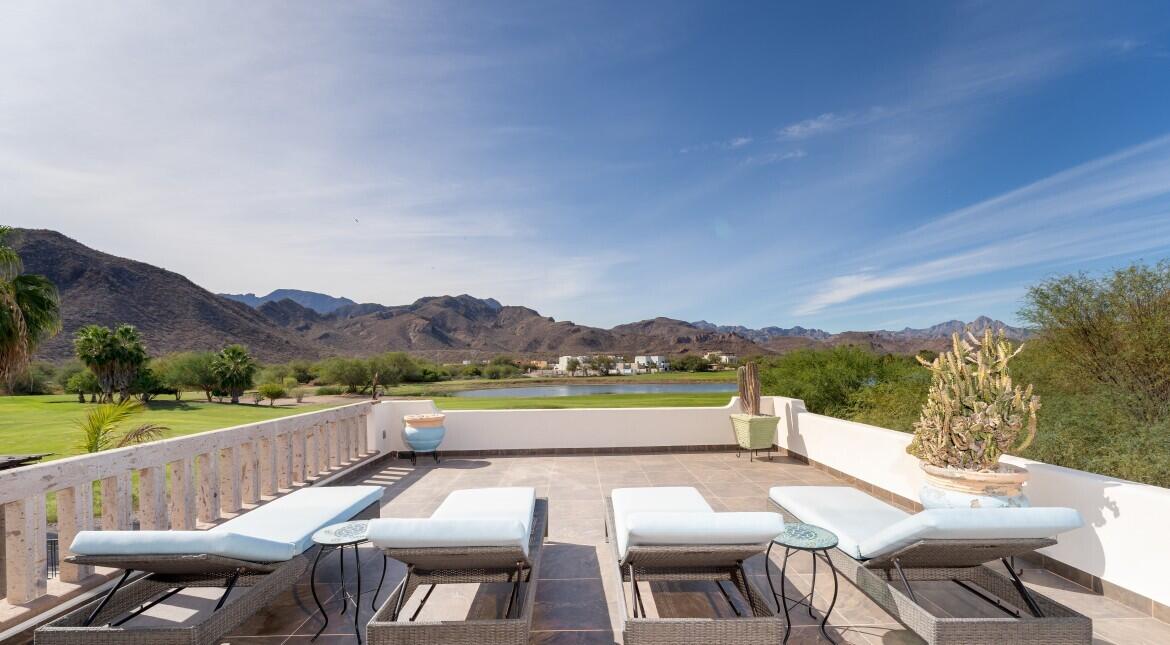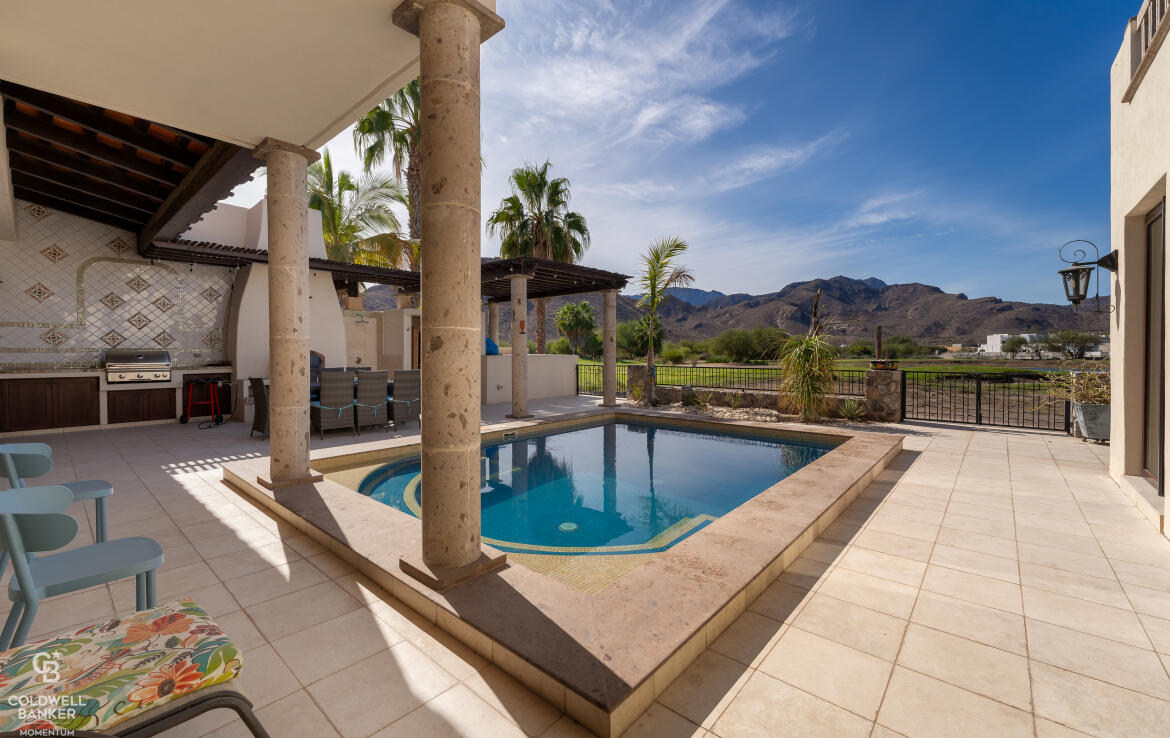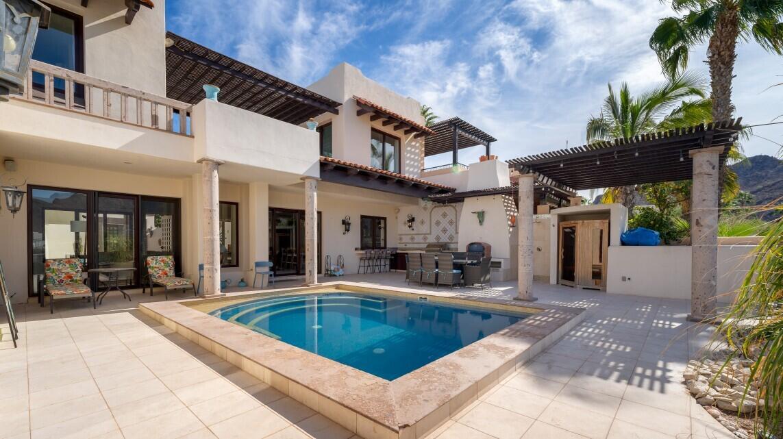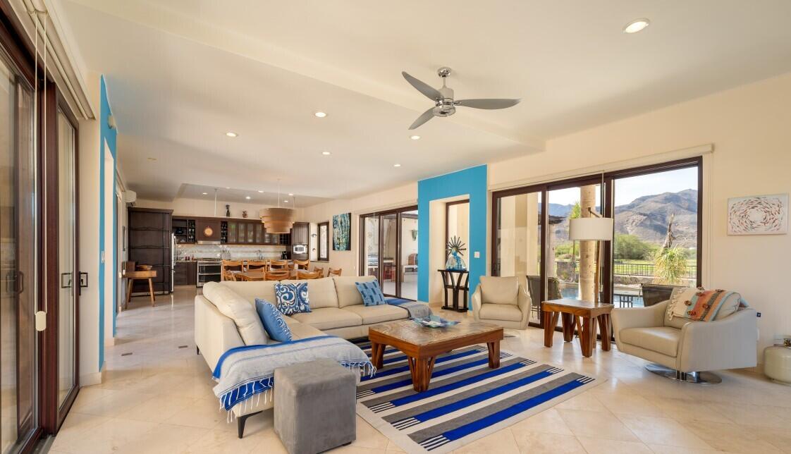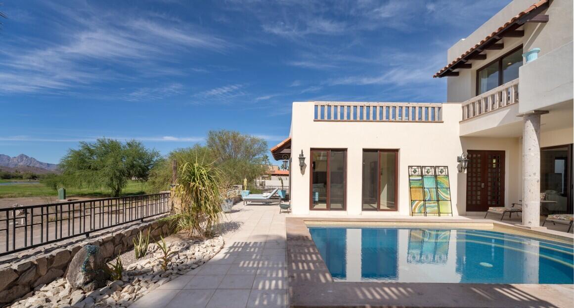 Nestled on the scenic 10th hole of the Loreto Bay Golf Course, this meticulously crafted 4-bedroom, 6-bathroom custom home offers the perfect blend of luxury, comfort, and breathtaking views. From the moment you step into the expansive entryway courtyard, you'll be captivated by the home's open, airy design and seamless indoor-outdoor flow. The heart of this home is its spacious living area, which features a bright and welcoming layout with easy access to both the master suite and a guest room, ensuring privacy and convenience without needing to step outside. Adjacent to the living space, a charming exterior courtyard with a tranquil water fountain offers a peaceful retreat for relaxation or entertainment.