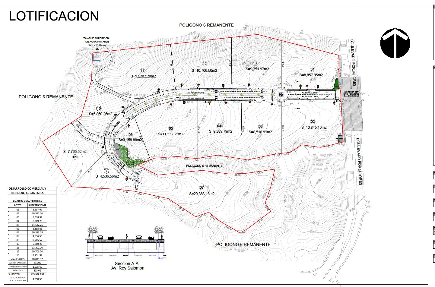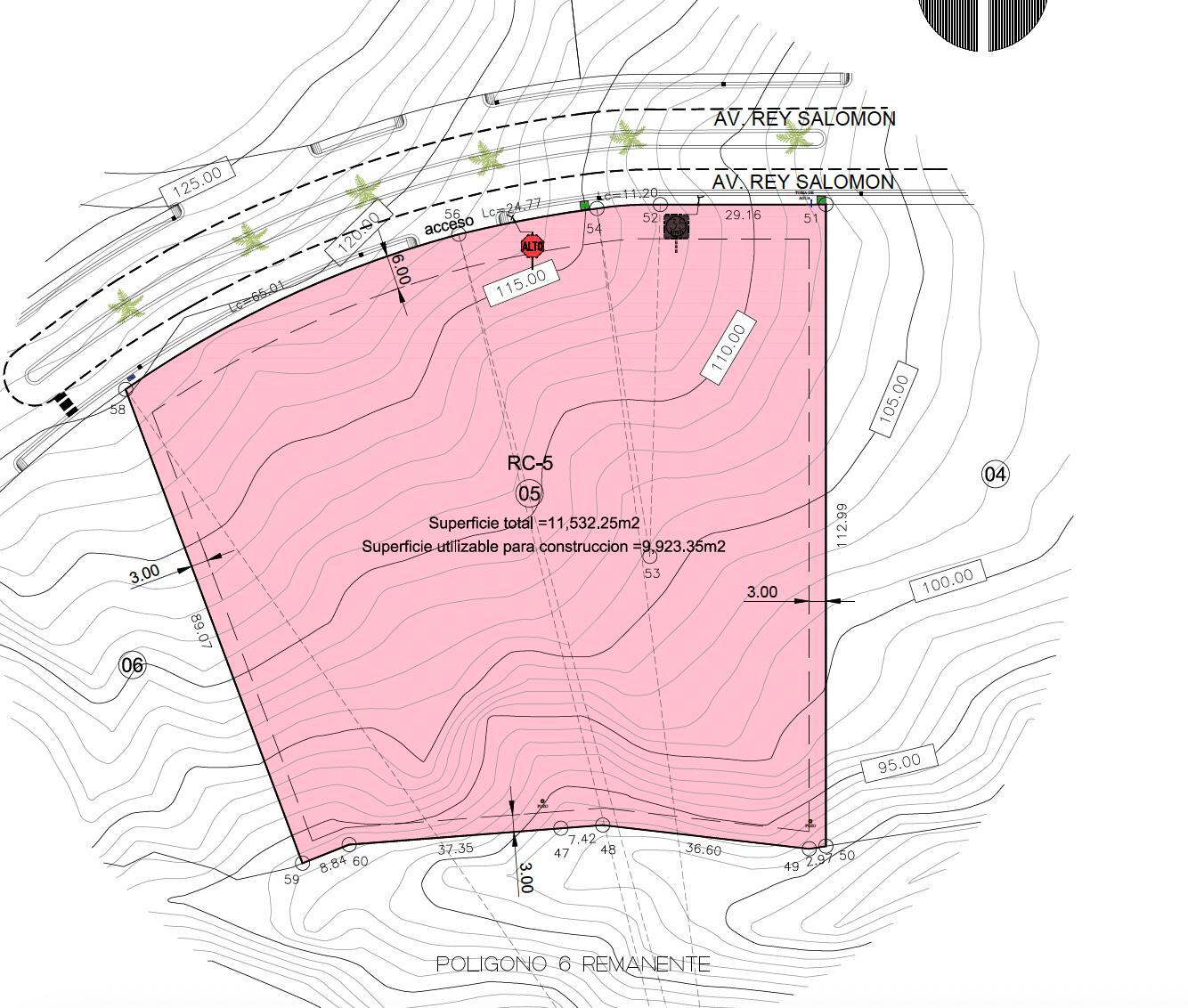 Lote 05 del Desarrollo Cantares, ubicado sobre Av. Rey Salomón con acceso desde Blvd. Forjadores, superficie 11,532.25 m², uso de suelo RC-5. COS 0.40 y CUS 1.6 permiten hasta 18,451 m² de construcción y altura de 4 niveles (14 m). Restricciones: frontal 6 m, laterales y posterior 3 m. Factible para 130 viviendas de interés medio combinando casas y departamentos. Cuenta con factibilidad hidráulica de 2 LPS y convenios con OOMSAPAS. Trámites vigentes: autorización de uso de suelo, MIAs ingresadas, factibilidades de agua, convenios Lote 4 y 5, VoBo de ecología, licencia de urbanización, autorización CONAGUA, VoBo de no afectación ambiental SEMARNAT y levantamiento topográfico. Terreno listo para desarrollar.