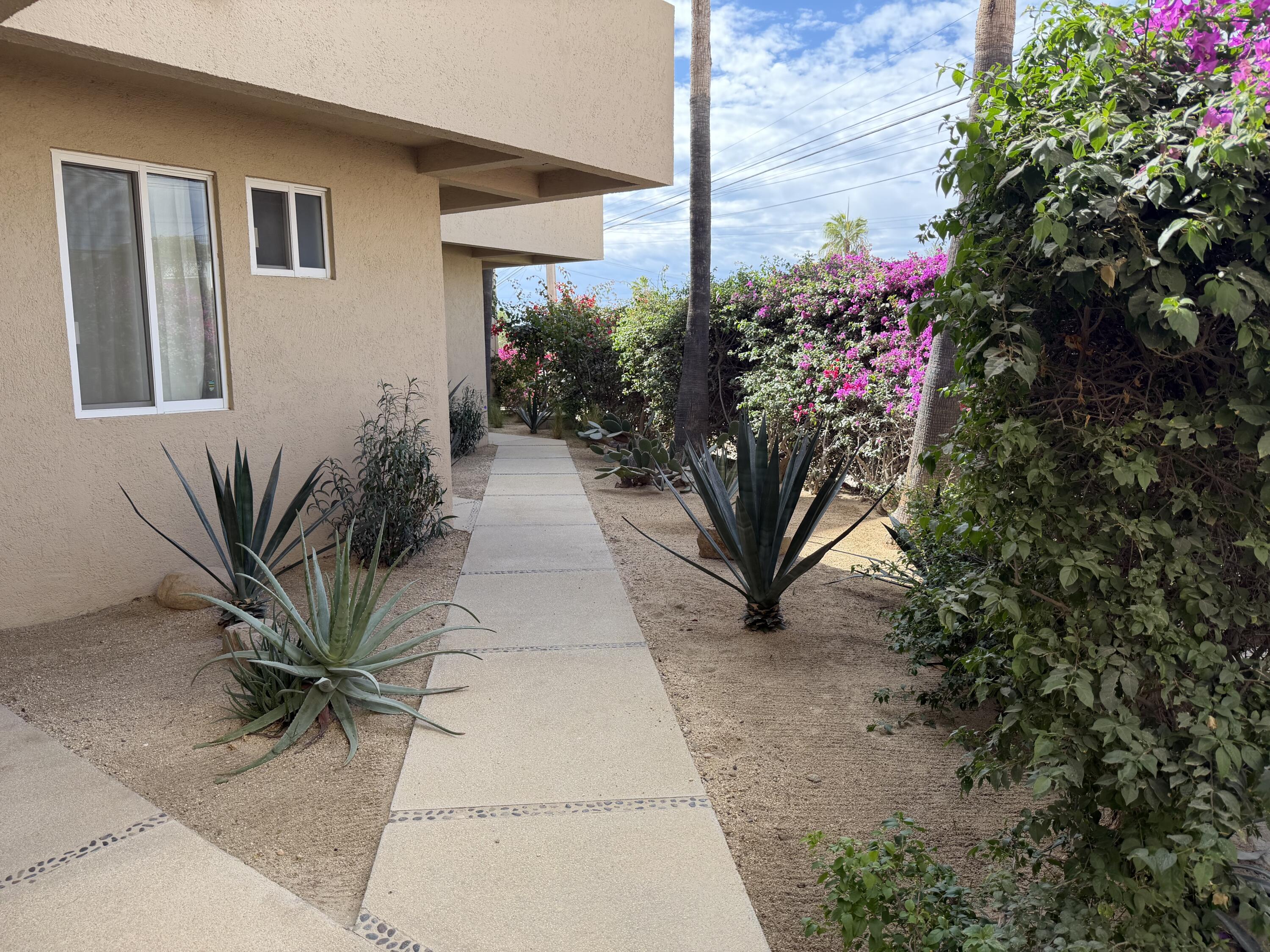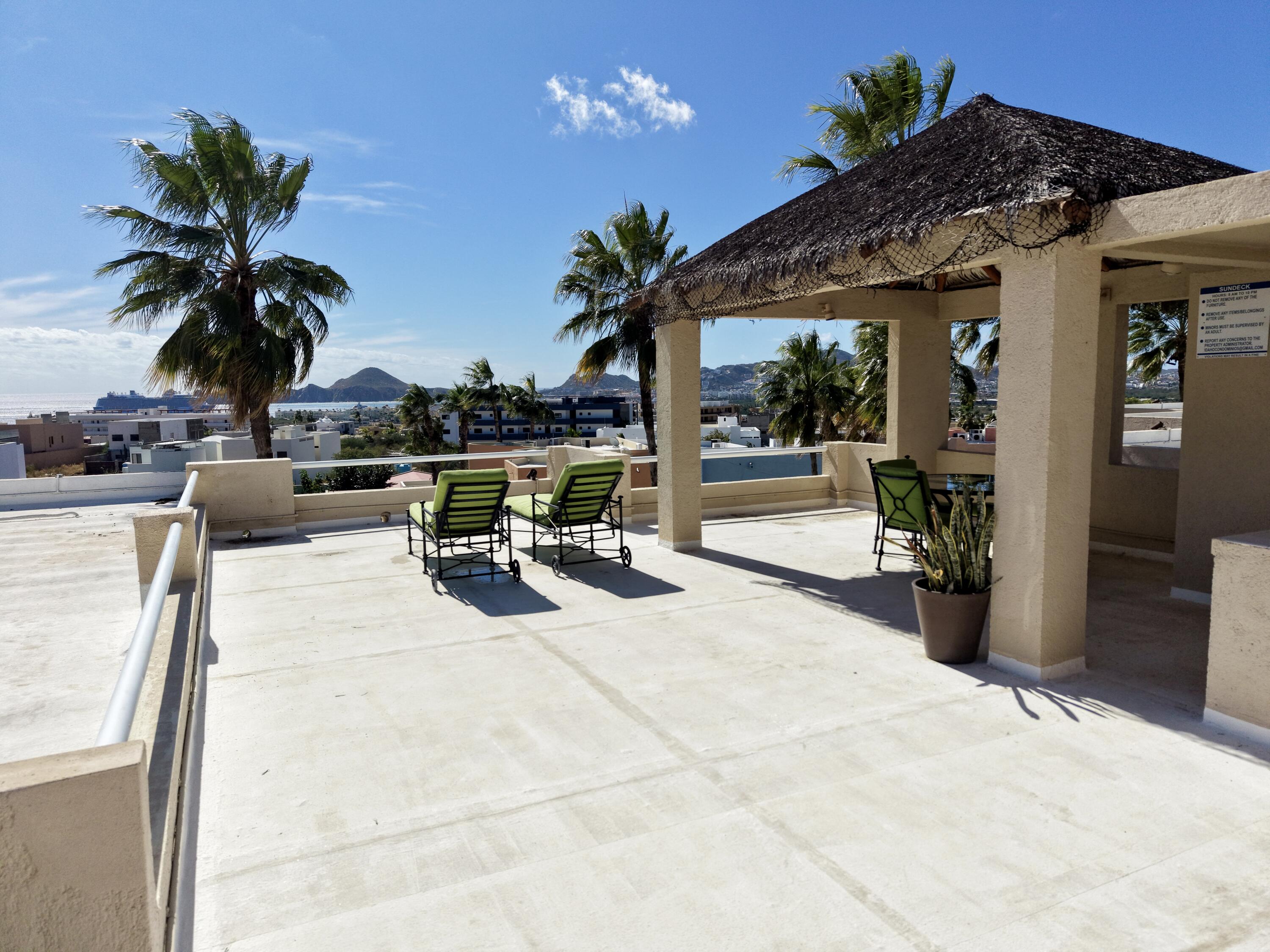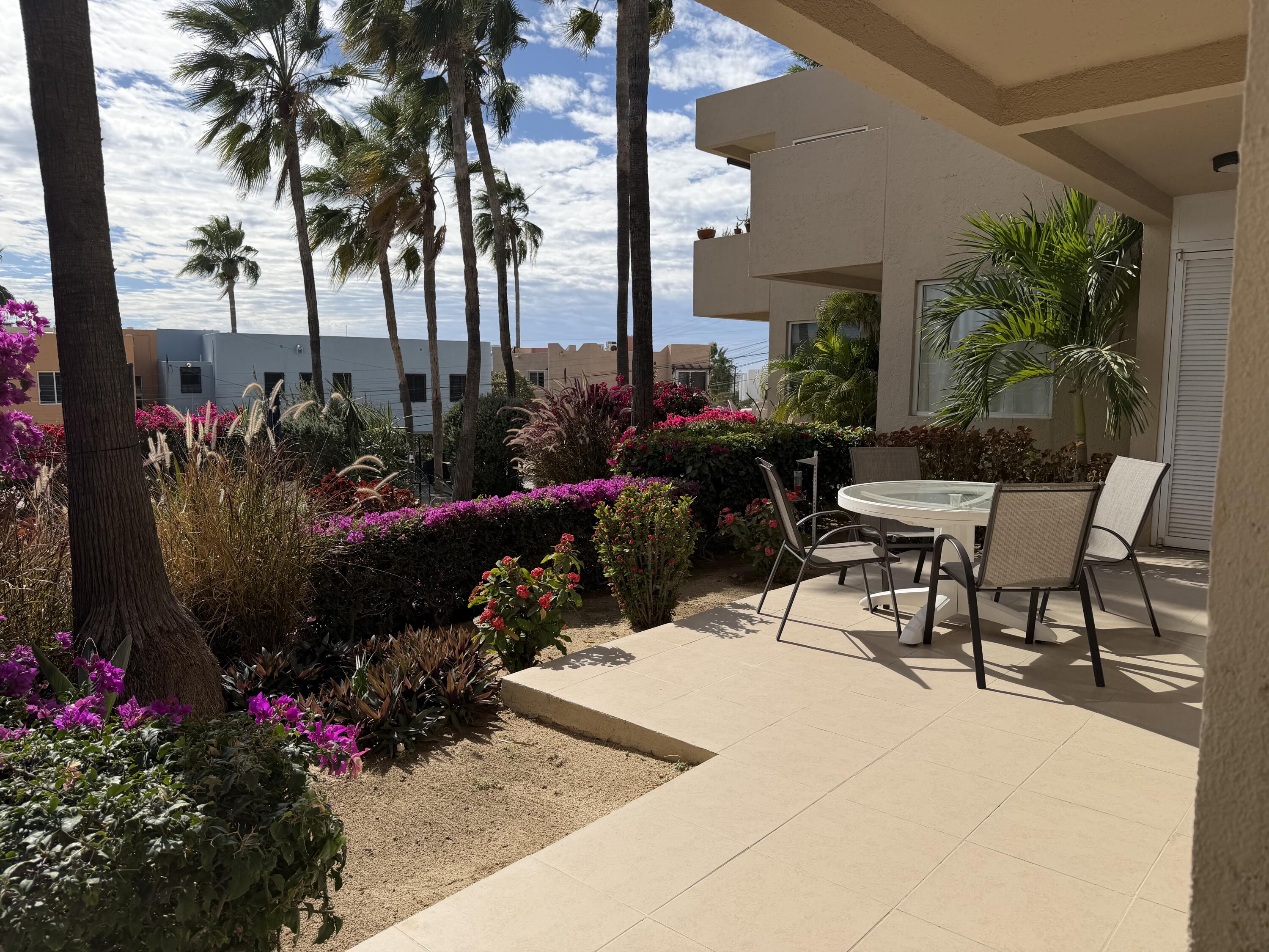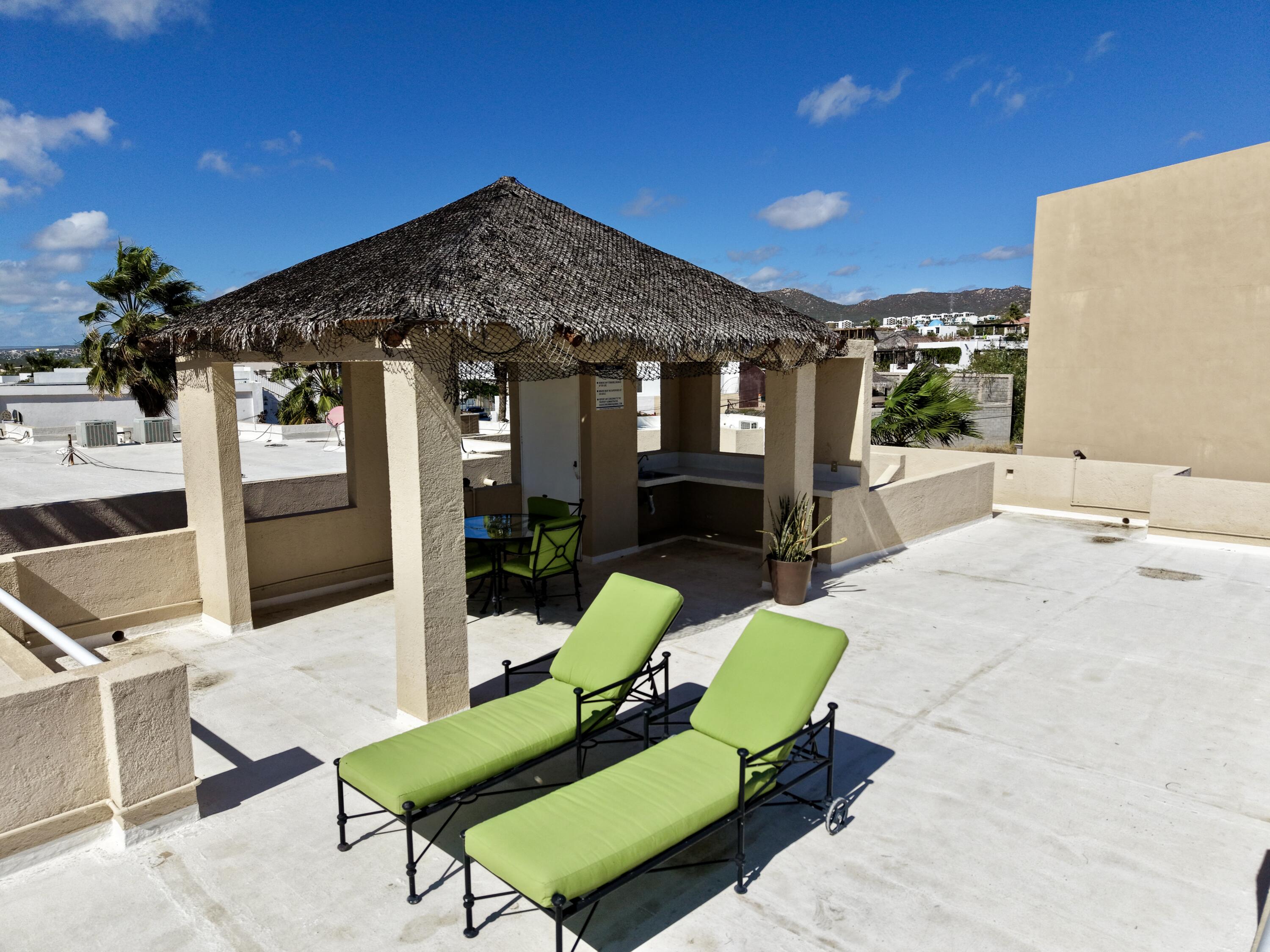 Bright, spacious 2-bed, 2-bath condo, freshly updated with paint, updated cabinets, and quartz countertops. This stylish, move-in-ready home features a private patio just steps from a beautifully landscaped pool, plus access to the shared rooftop terrace with sweeping ocean views. Located in a gated, secure, low-density complex just a six-minute ride to downtown Cabo, it blends comfort, convenience, and a touch of North American style. Ideal as a personal retreat or Airbnb-ready, offering the ultimate Cabo lifestyle