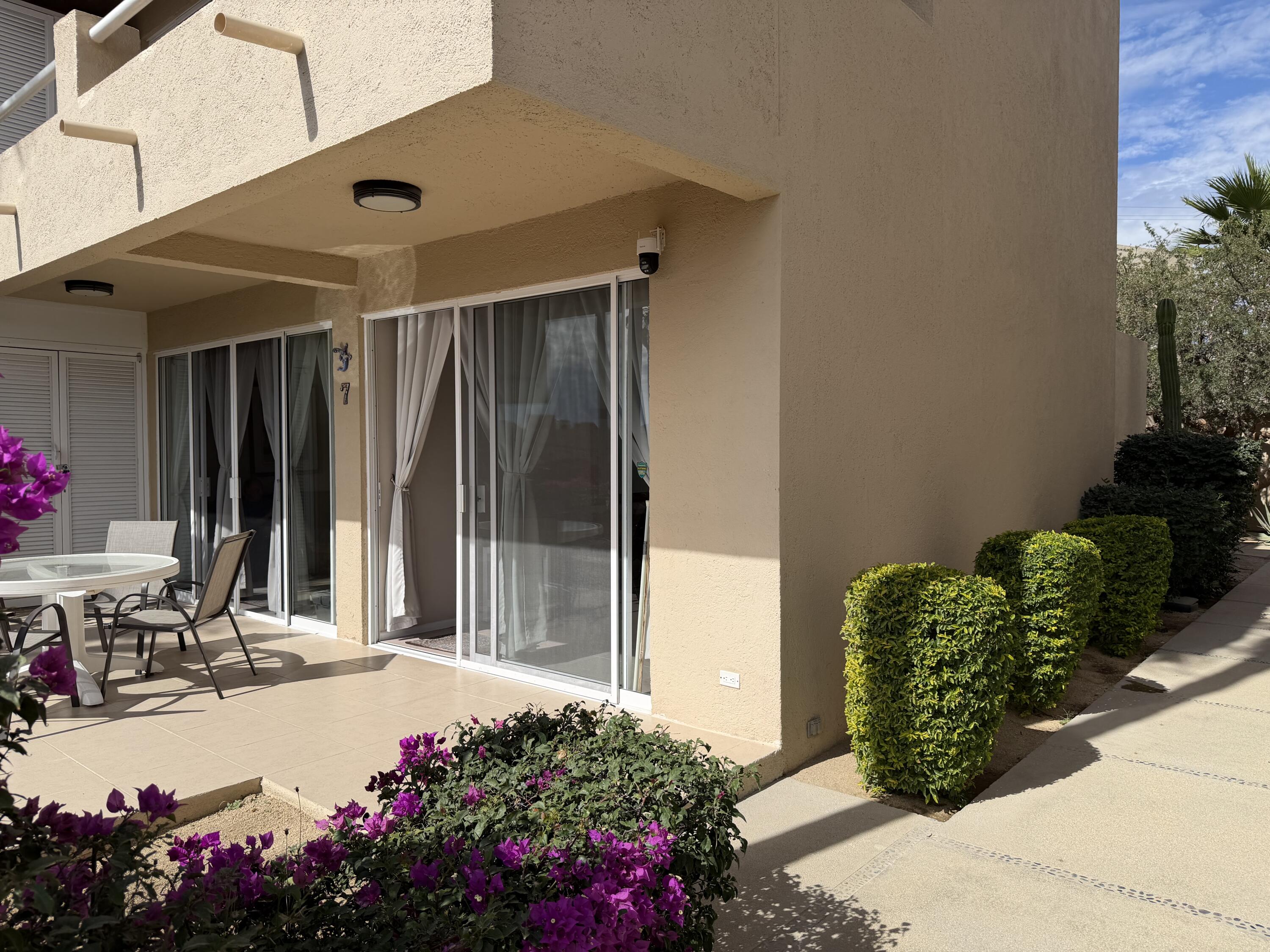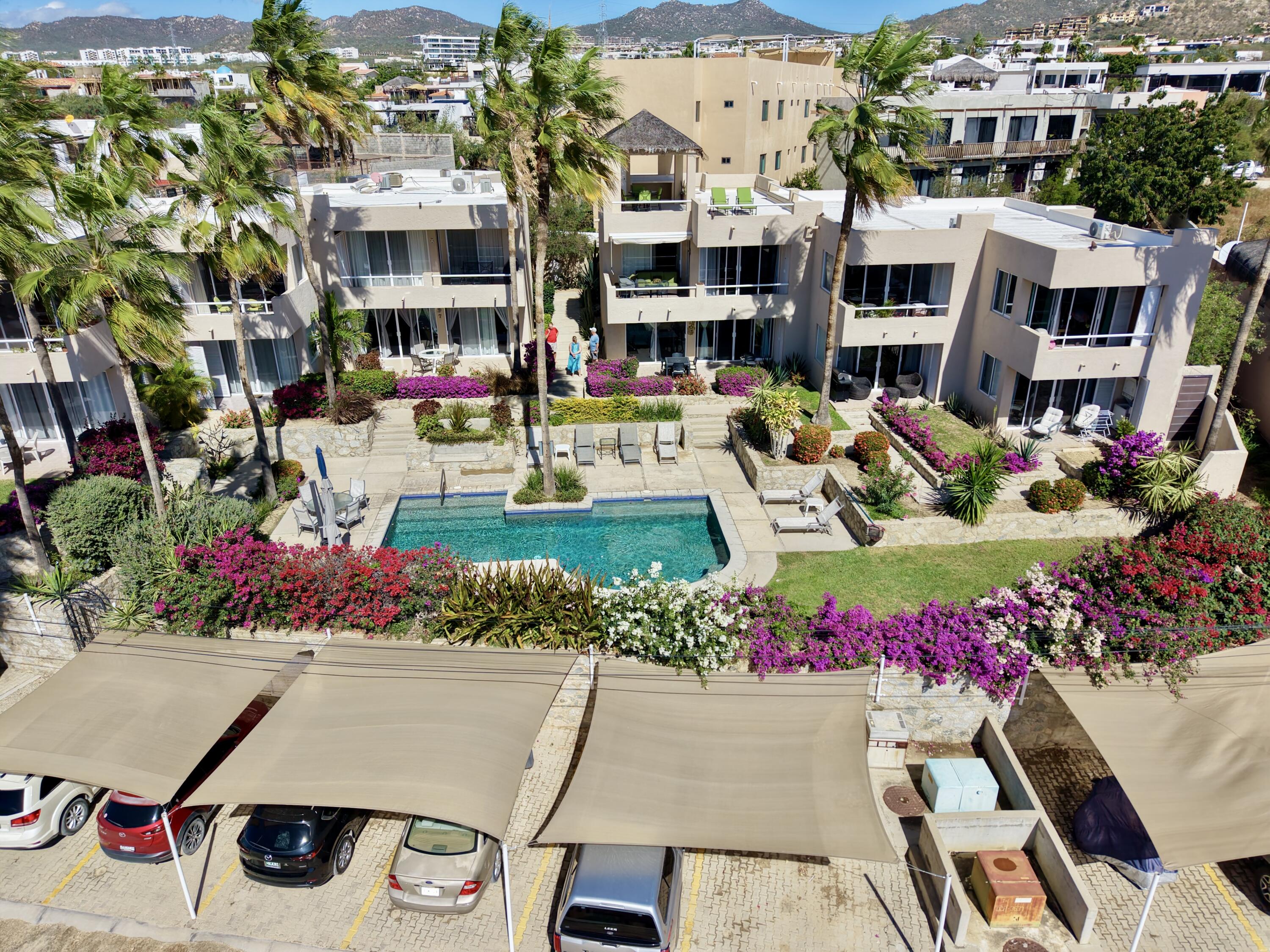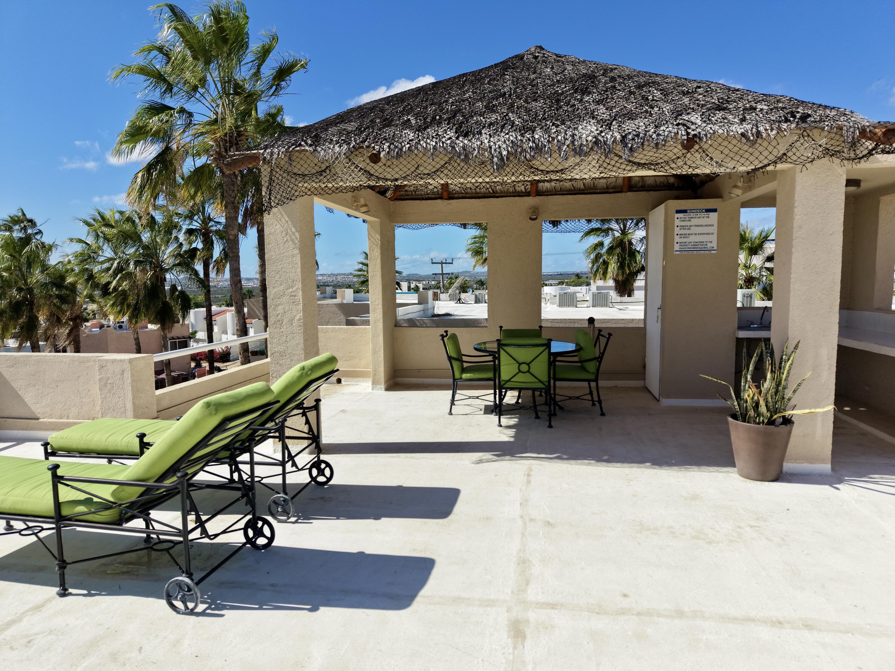 Bright, spacious 2-bed, 2-bath condo, freshly updated with paint, updated cabinets, and quartz countertops. This stylish, move-in-ready home features a private patio just steps from a beautifully landscaped pool, plus access to the shared rooftop terrace with sweeping ocean views. Located in a gated, secure, low-density complex just a six-minute ride to downtown Cabo, it blends comfort, convenience, and a touch of North American style. Ideal as a personal retreat or Airbnb-ready, offering the ultimate Cabo lifestyle