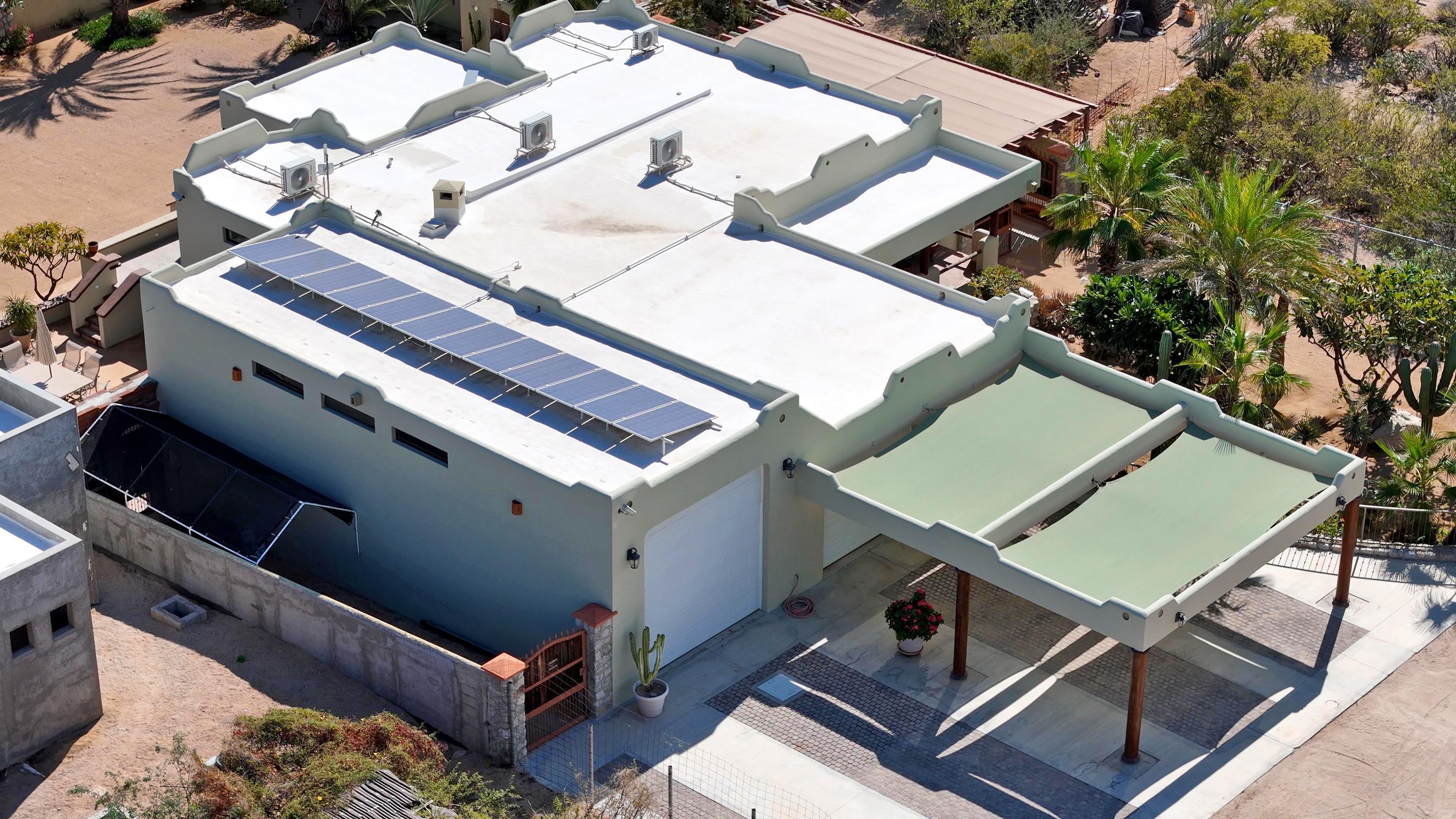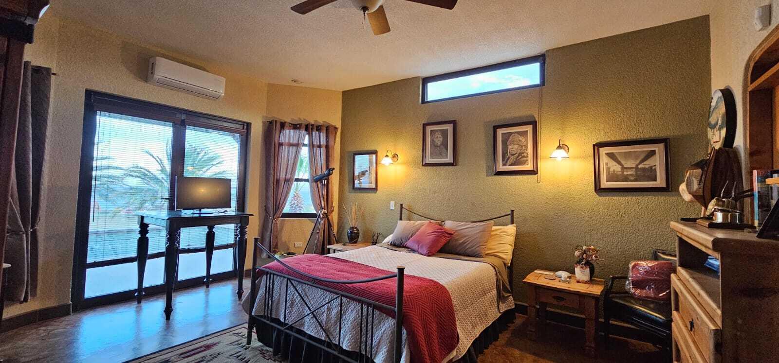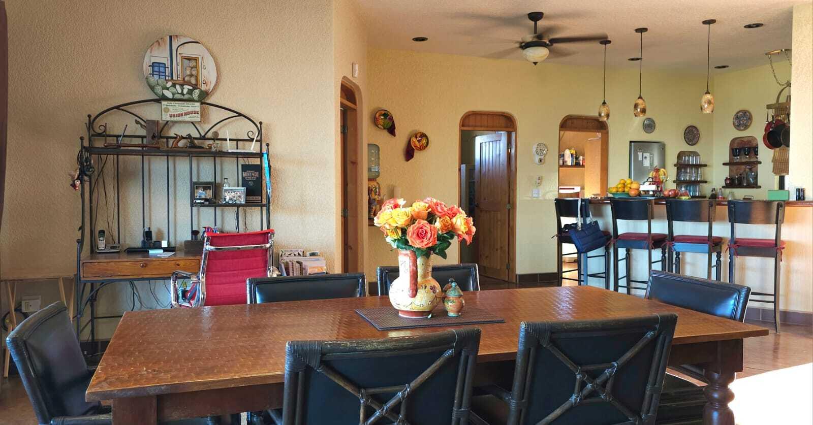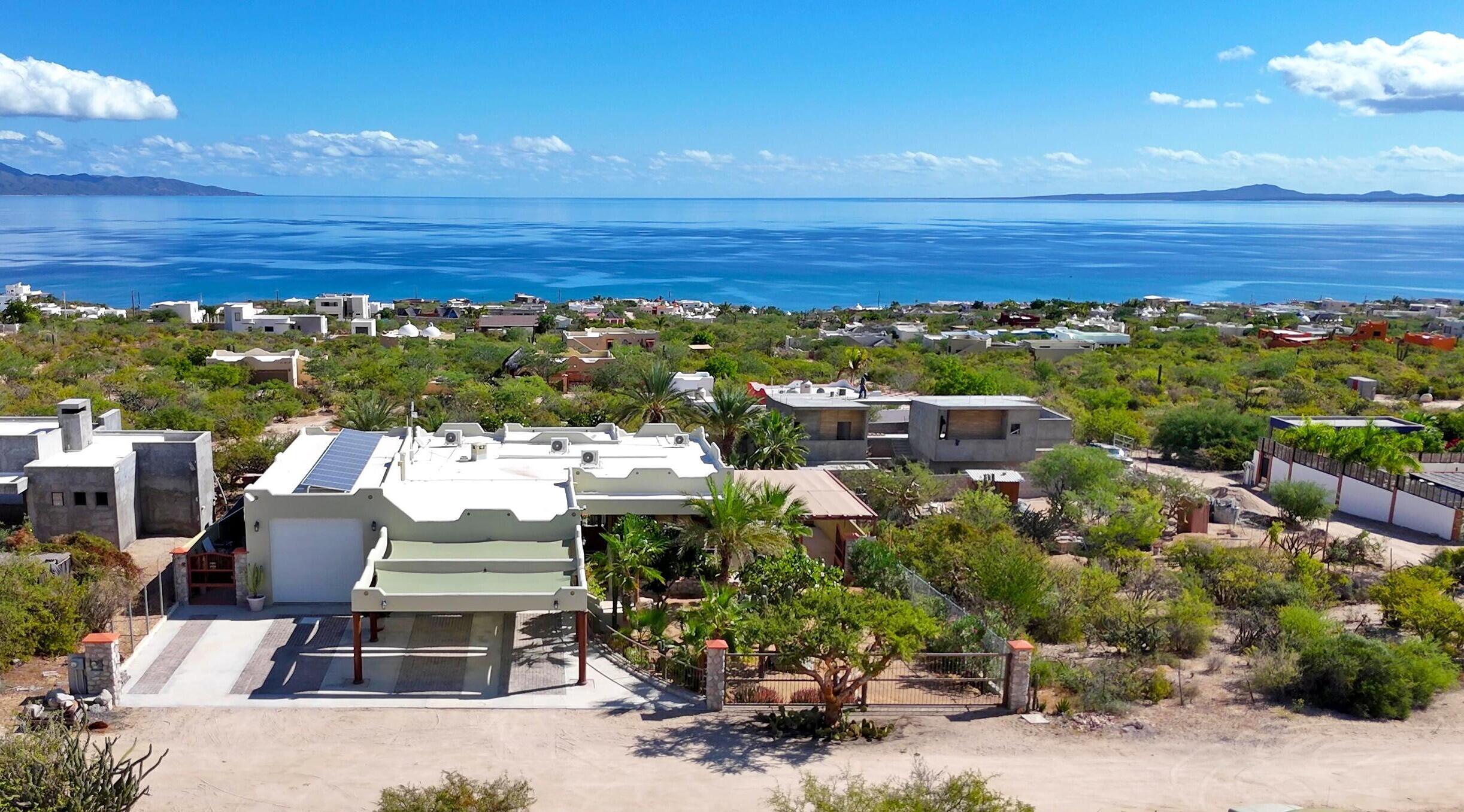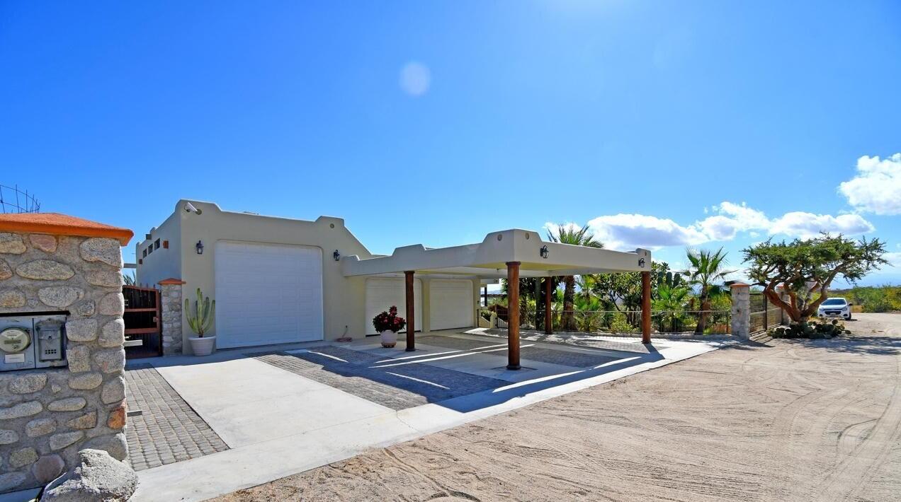 Traditional Mexican design house in the northern of El Sargento, with 2 big bedrooms, 2.5 bathrooms, huge living room with USA satellital TV, surround sound system, chimene works with propane or wood. 2 internet system Starlink and Infinitum. Completely furnished home, polished concrete finishes, offerings 180° spectacular unblocked views to Cerralvo Island and the sea of Cortes, also designed with great outdoor living spaces, and BBQ area. 2 terrazas with spectacular views of the island and the Sea of Cortes, with a lot size of 1,548 M2, On the north side of the house has a RV parking with complete hookup. 3 large car garages with one being a large RV garage with electric garage door openers. A large 2 car carpot in front of the garage. This house is power by CFE, complete Solar System.