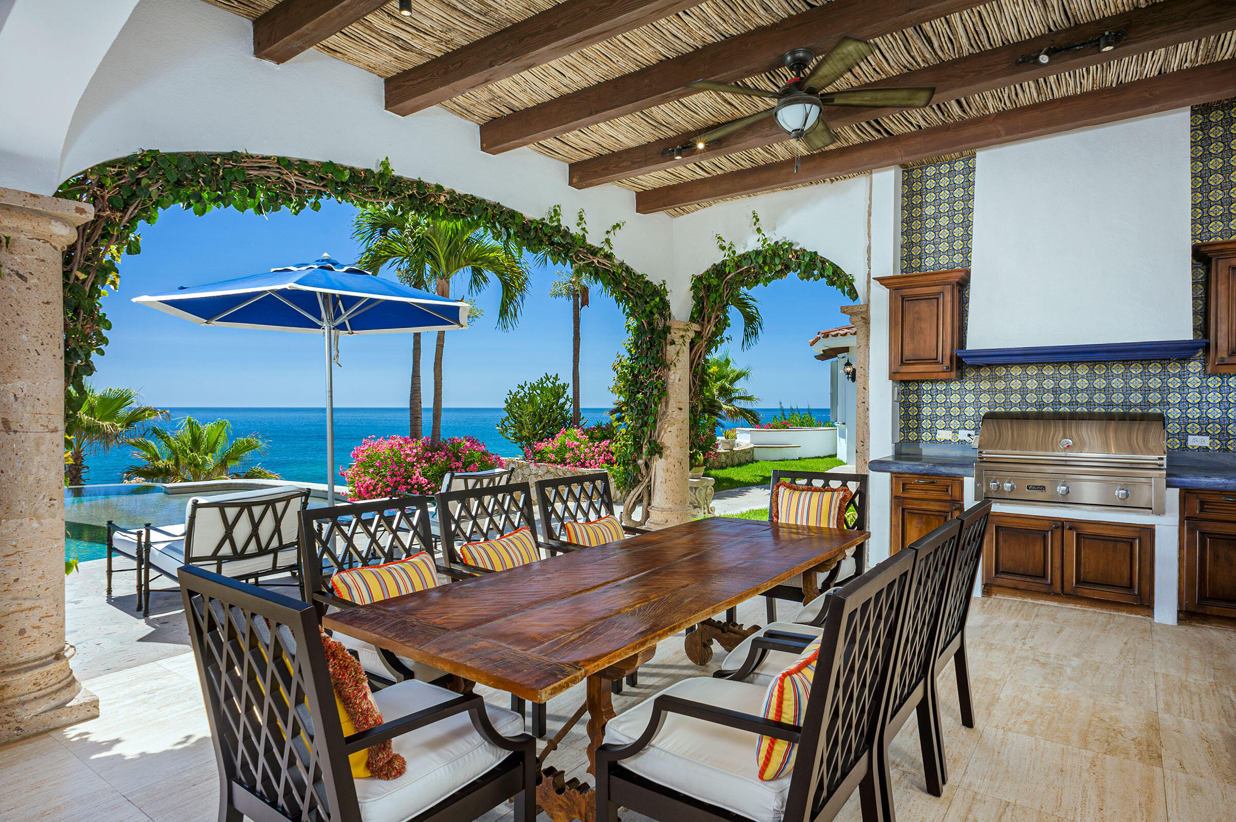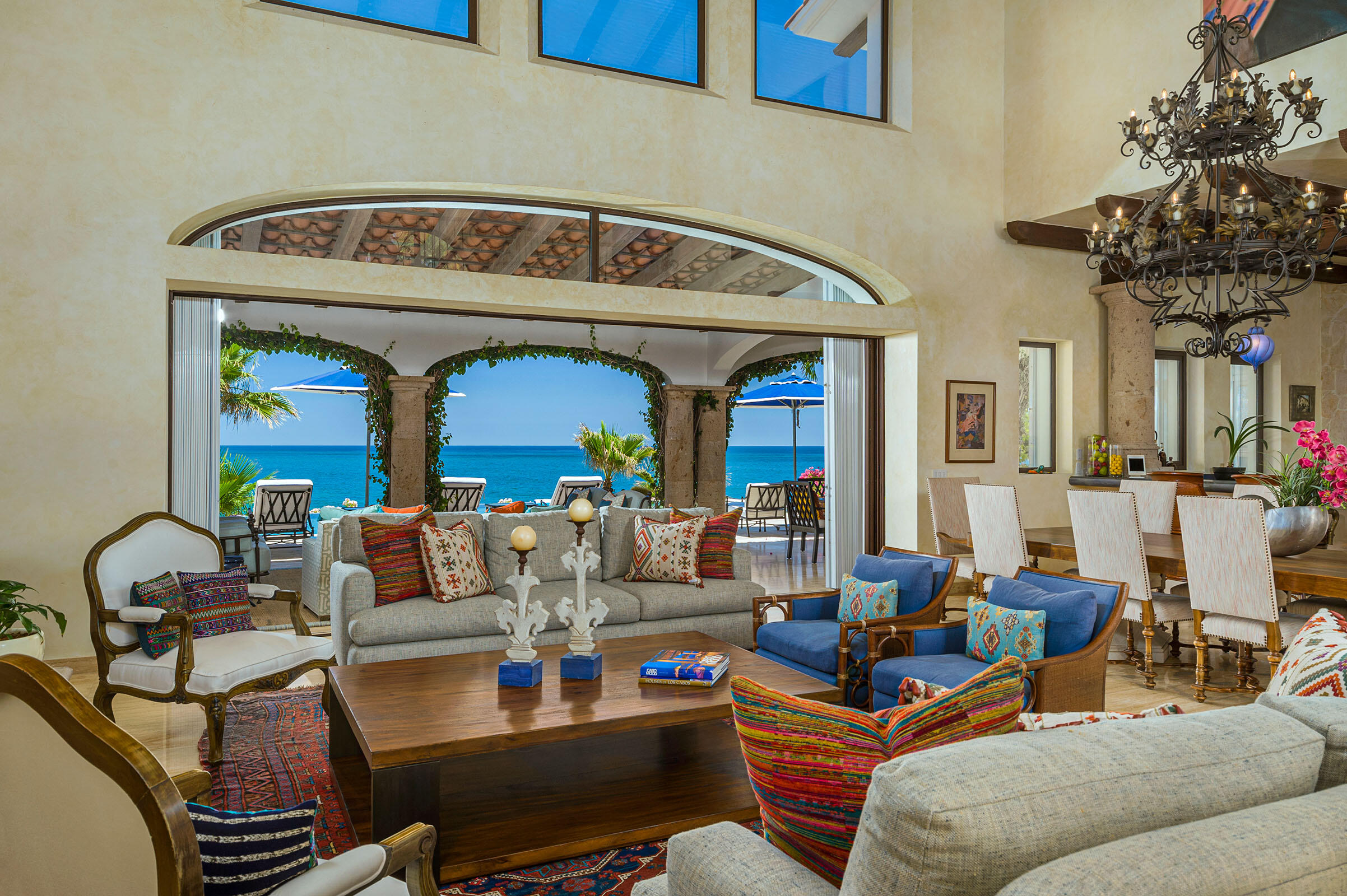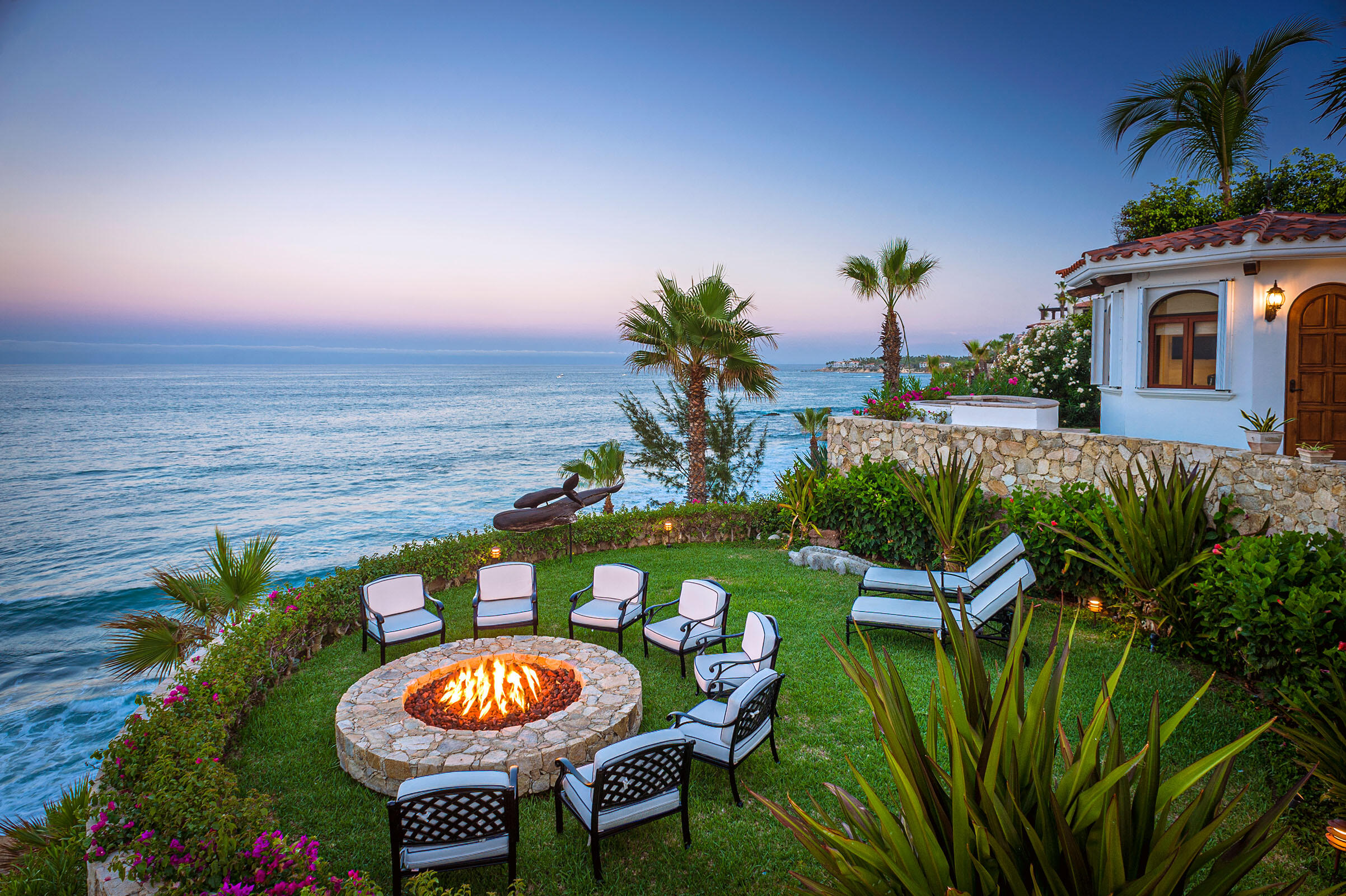Along the bluffside in La Caleta—Palmilla's original and most exclusive beachfront enclave—Casa Estrella delivers oceanfront living with unapologetic style. Set above the waves at Old Man's surf break, this five-bedroom estate pairs bold architectural design with laid-back Baja luxury. A gated entry leads to a courtyard with cascading fountain, lantern-lit doors, and a dramatic two-story living room with floor-to-ceiling stone fireplace and sweeping Sea of Cortez views. Seamless indoor-outdoor flow brings you to an expansive terrace featuring a covered dining area, BBQ station, palapa with fireplace and TV, grassy firepit lounge, detached oceanview office, sun-drenched loungers, and a private stone staircase to the surf below.