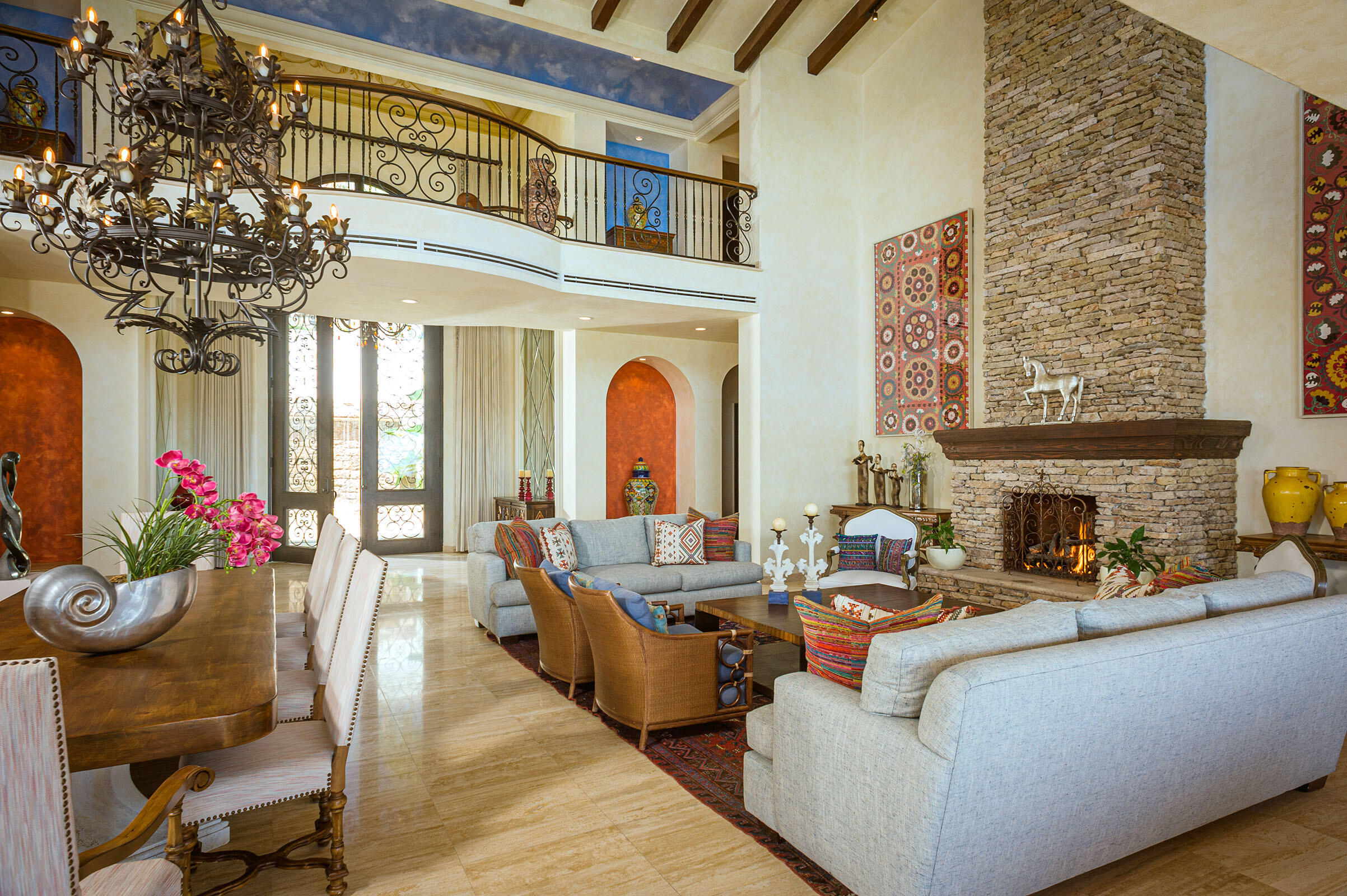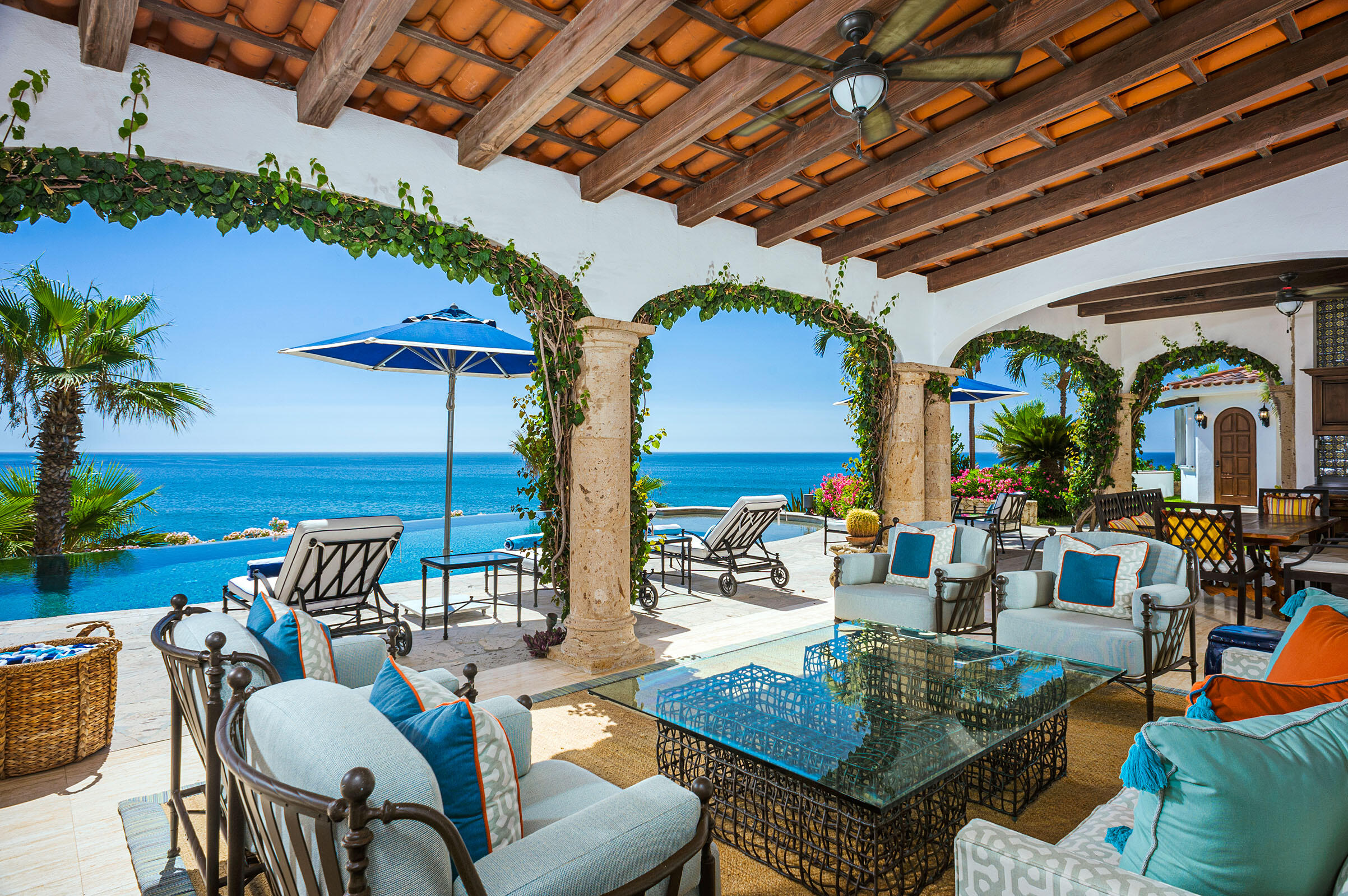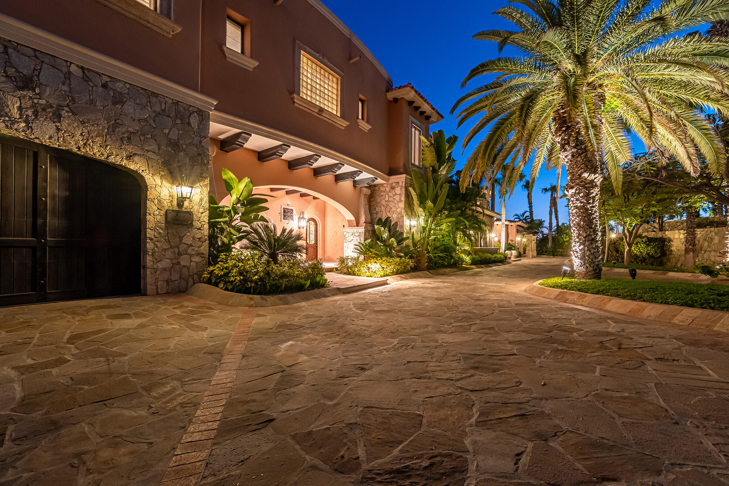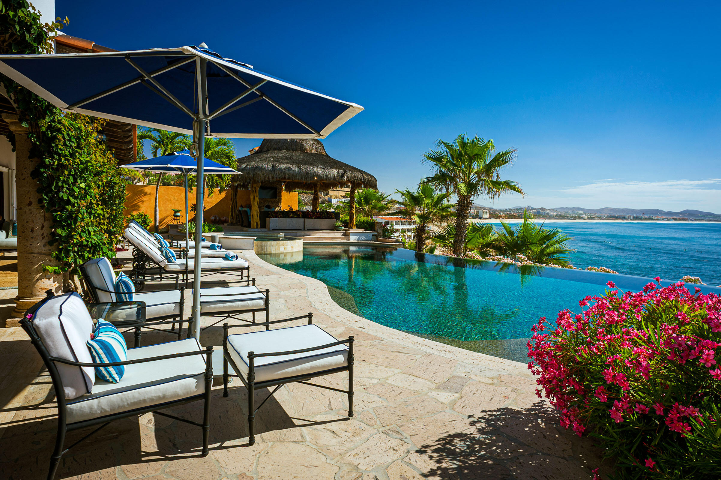 Along the bluffside in La Caleta—Palmilla's original and most exclusive beachfront enclave—Casa Estrella delivers oceanfront living with unapologetic style. Set above the waves at Old Man's surf break, this five-bedroom estate pairs bold architectural design with laid-back Baja luxury. A gated entry leads to a courtyard with cascading fountain, lantern-lit doors, and a dramatic two-story living room with floor-to-ceiling stone fireplace and sweeping Sea of Cortez views. Seamless indoor-outdoor flow brings you to an expansive terrace featuring a covered dining area, BBQ station, palapa with fireplace and TV, grassy firepit lounge, detached oceanview office, sun-drenched loungers, and a private stone staircase to the surf below.