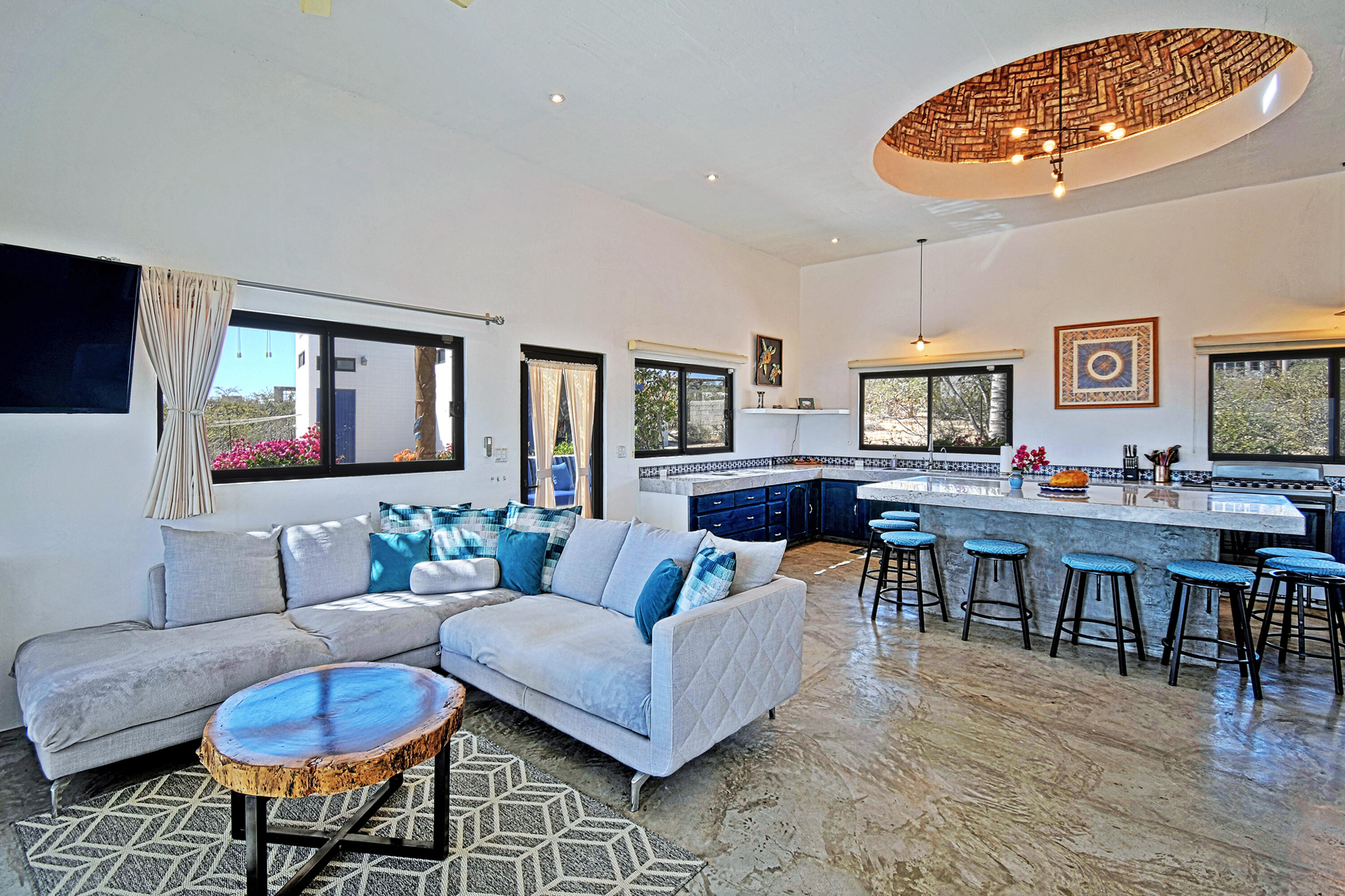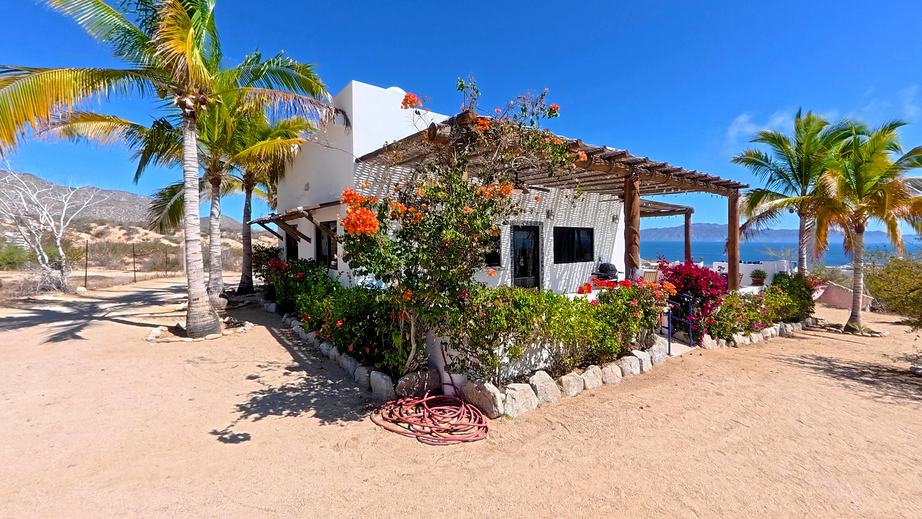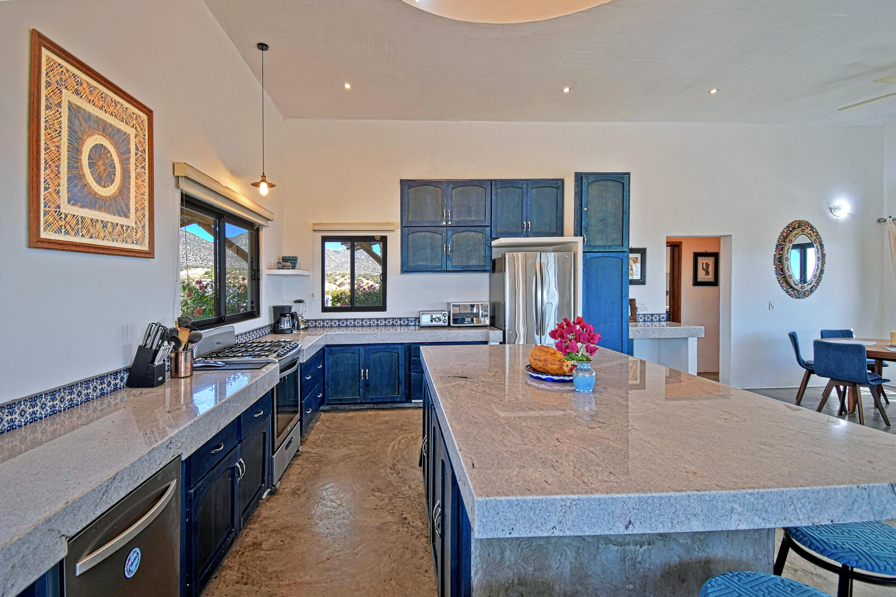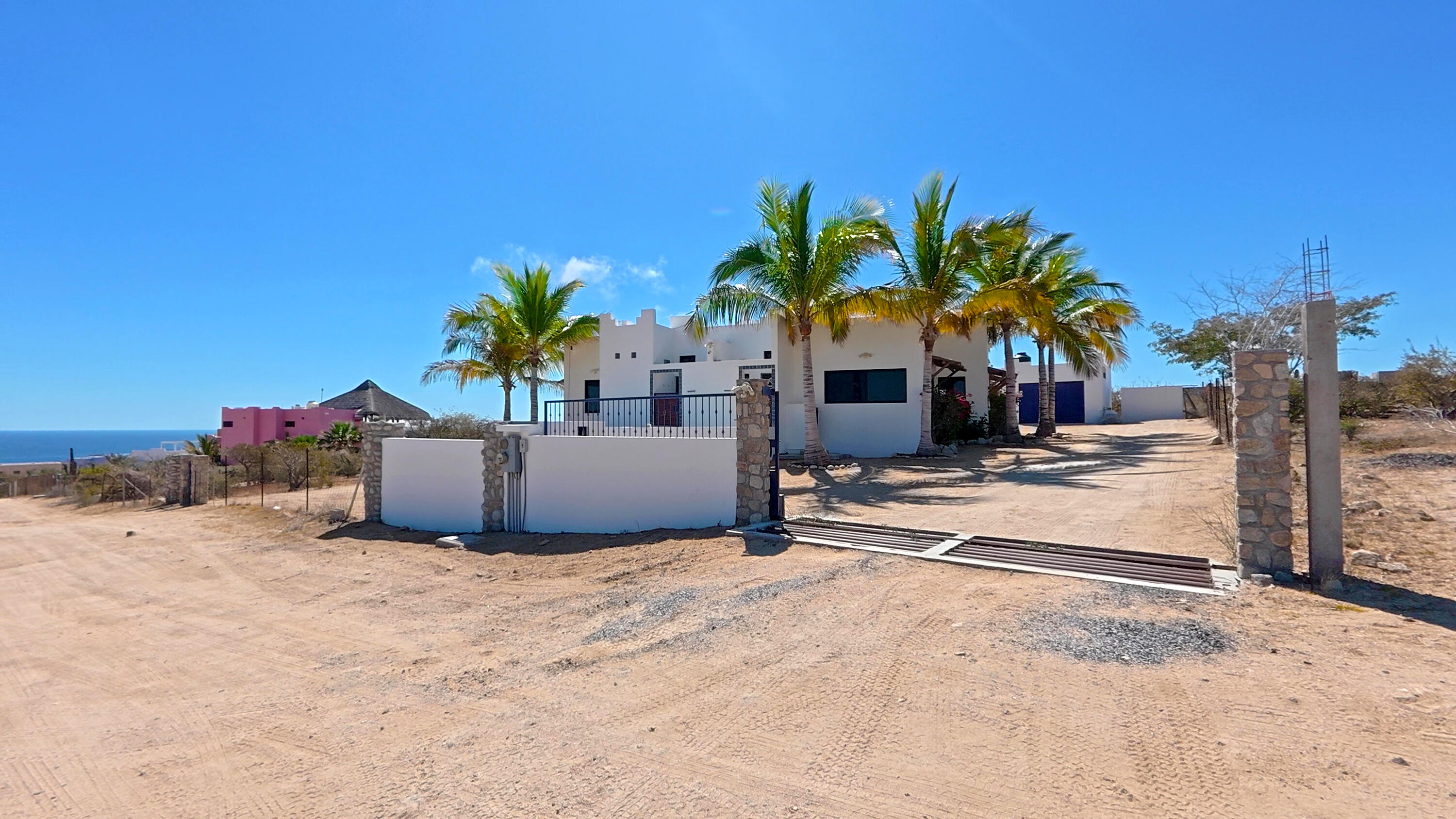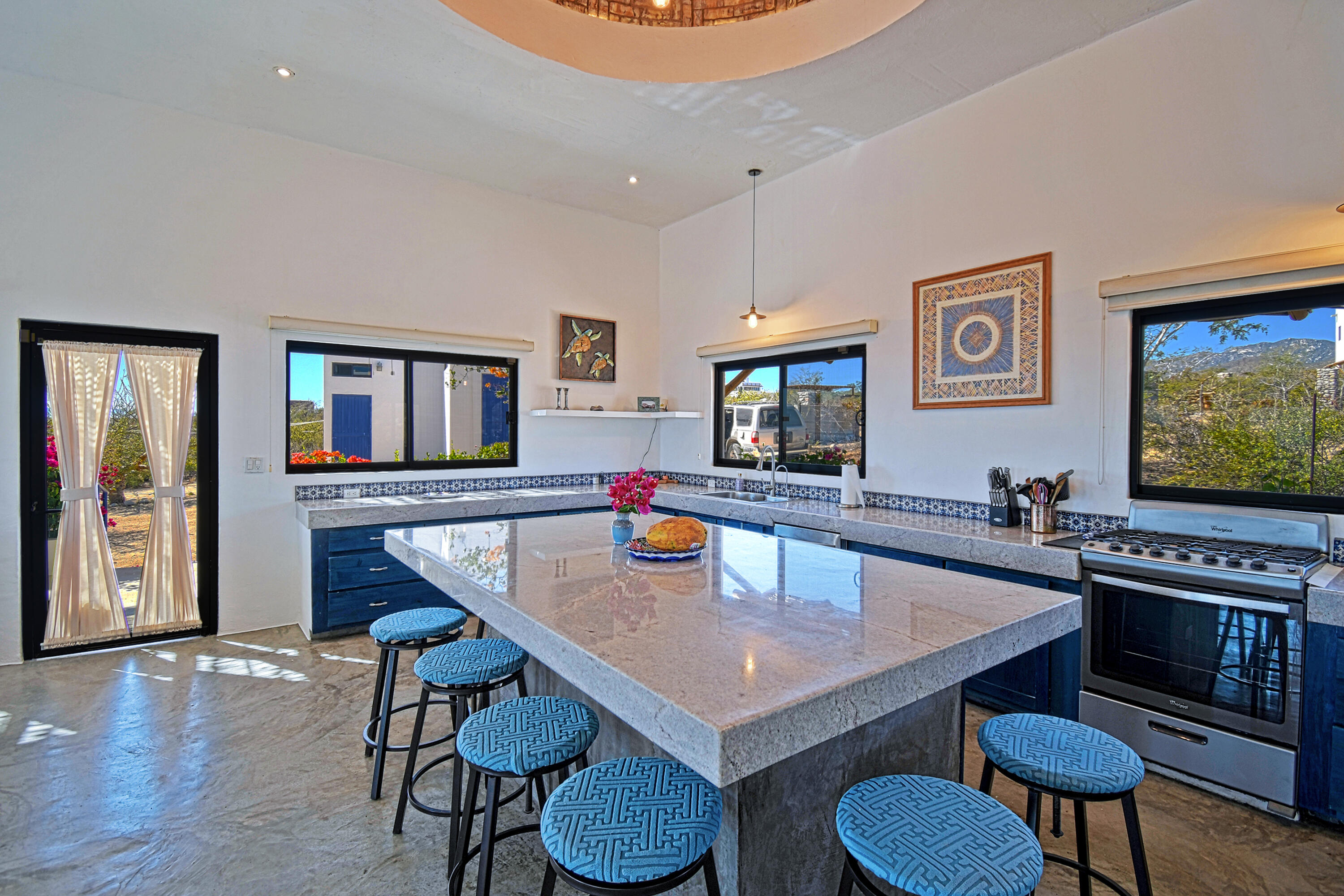 Bright, breezy, and full of Baja charm, this stunning 2-bedroom, 2-bath home offers effortless indoor-outdoor living. The open-concept great room centers around a spacious kitchen island beneath a striking brick cupula, with bold blue cabinetry set against crisp white walls for a fresh coastal feel. Large windows flood the home with natural light and showcase sweeping desert and Sea of Cortes views. Enjoy the outdoors from a pergola-shaded patio with multiple lounge areas, surrounded by lush bougainvillea and mature palms. Includes adjacent lot for protected views, plus a one car garage and dedicated laundry room. Located just minutes from sandy beaches and world class mountain bike/hiking trails.