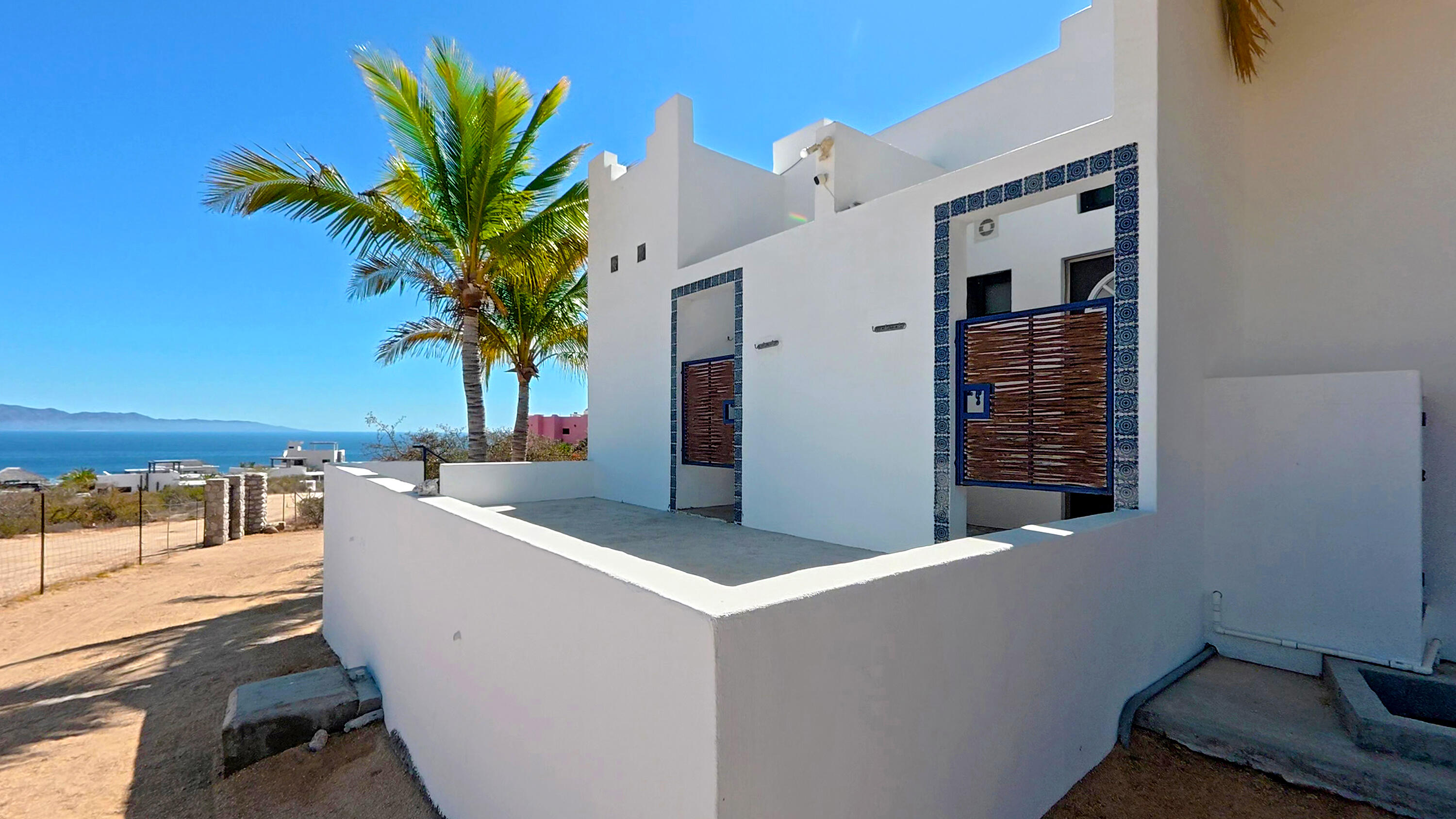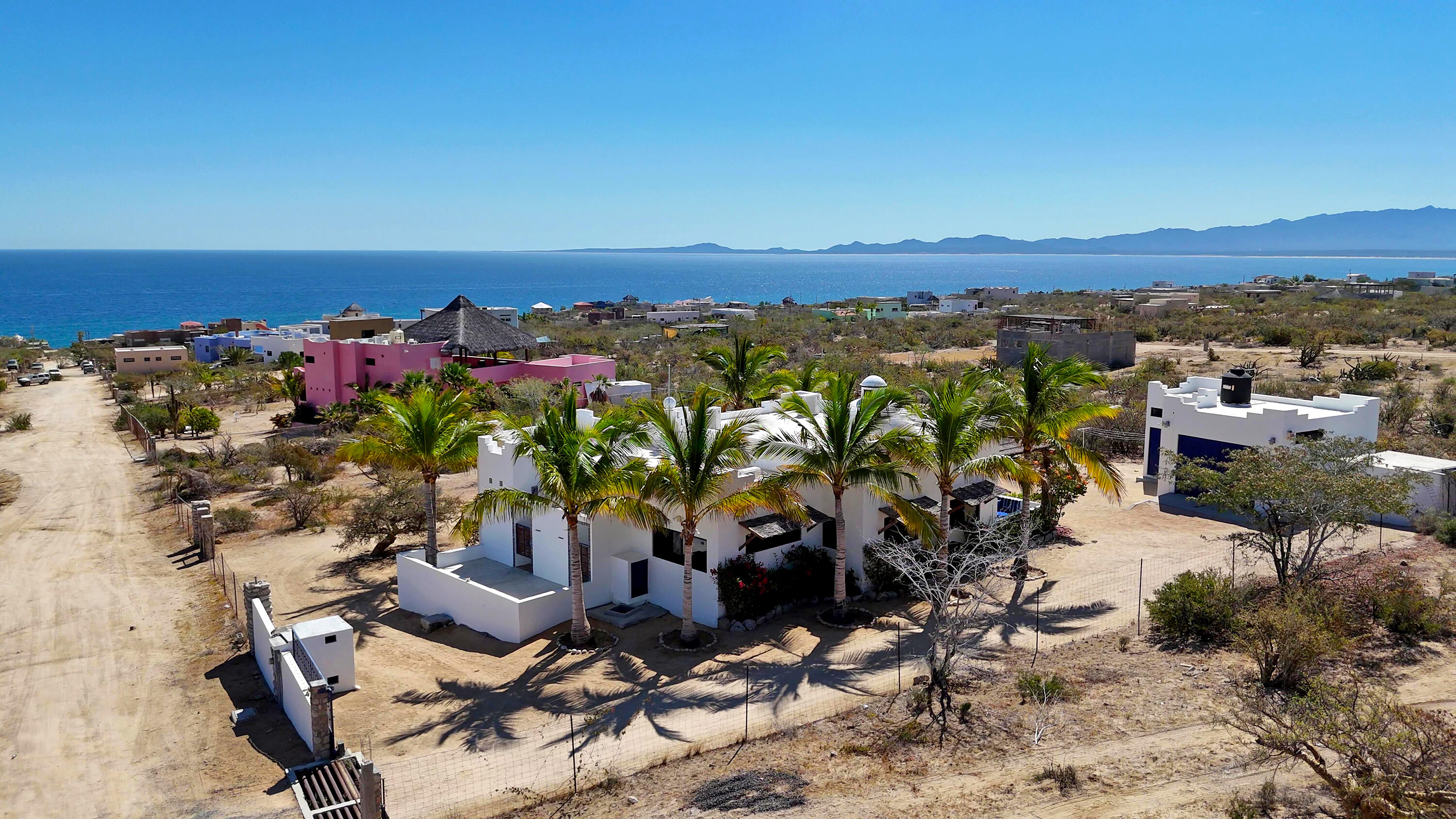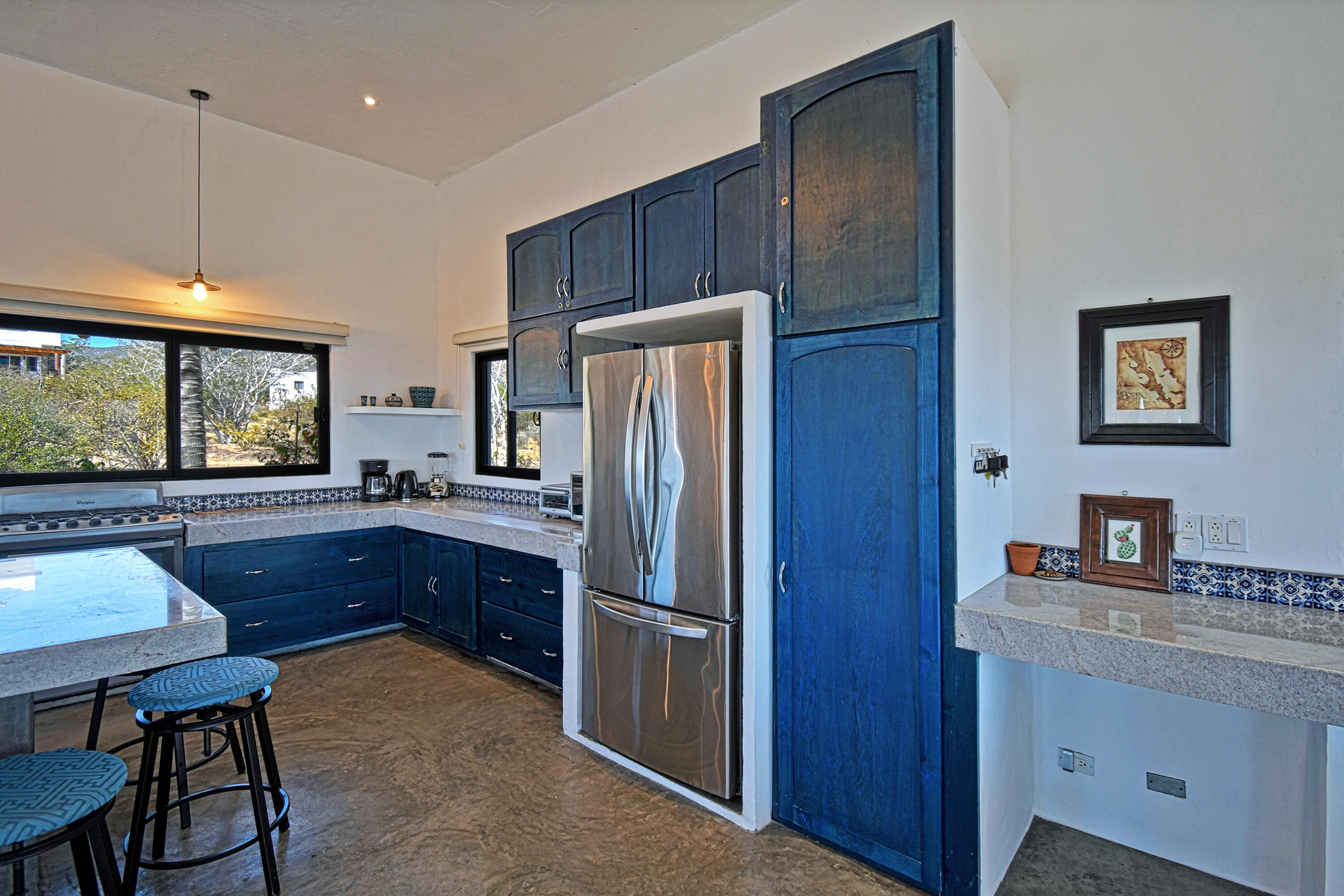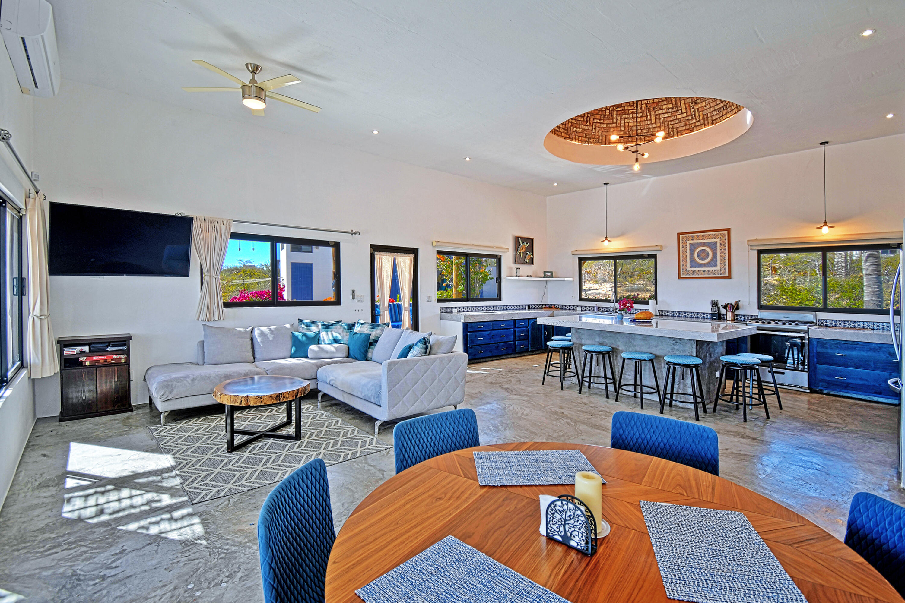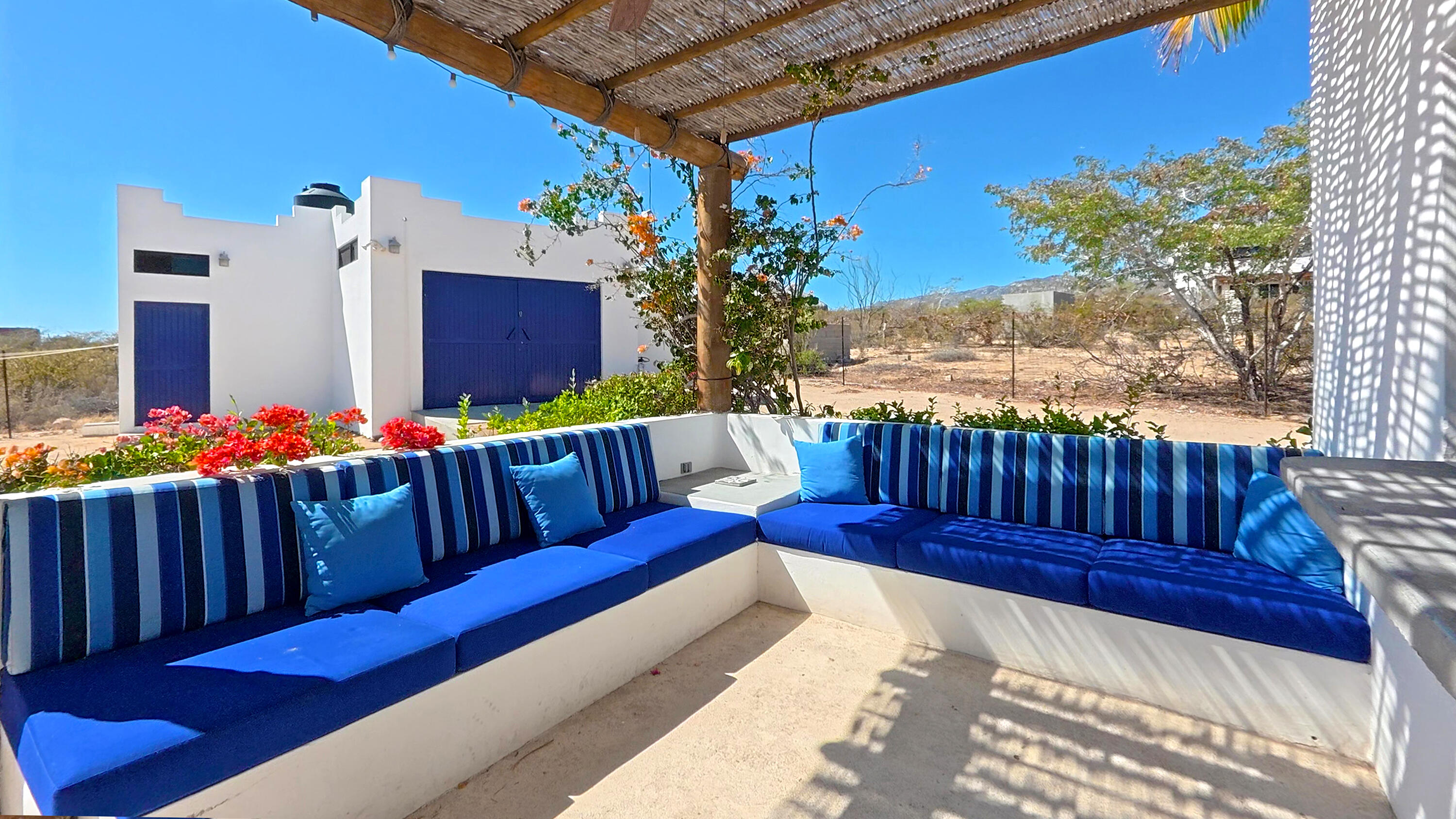 Bright, breezy, and full of Baja charm, this stunning 2-bedroom, 2-bath home offers effortless indoor-outdoor living. The open-concept great room centers around a spacious kitchen island beneath a striking brick cupula, with bold blue cabinetry set against crisp white walls for a fresh coastal feel. Large windows flood the home with natural light and showcase sweeping desert and Sea of Cortes views. Enjoy the outdoors from a pergola-shaded patio with multiple lounge areas, surrounded by lush bougainvillea and mature palms. Includes adjacent lot for protected views, plus a one car garage and dedicated laundry room. Located just minutes from sandy beaches and world class mountain bike/hiking trails.
