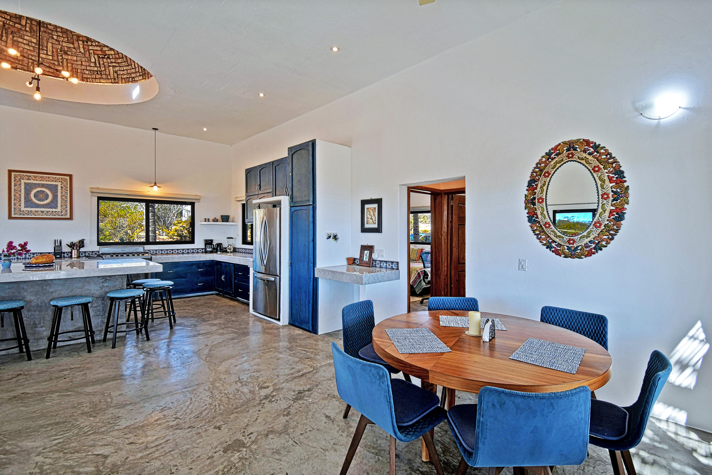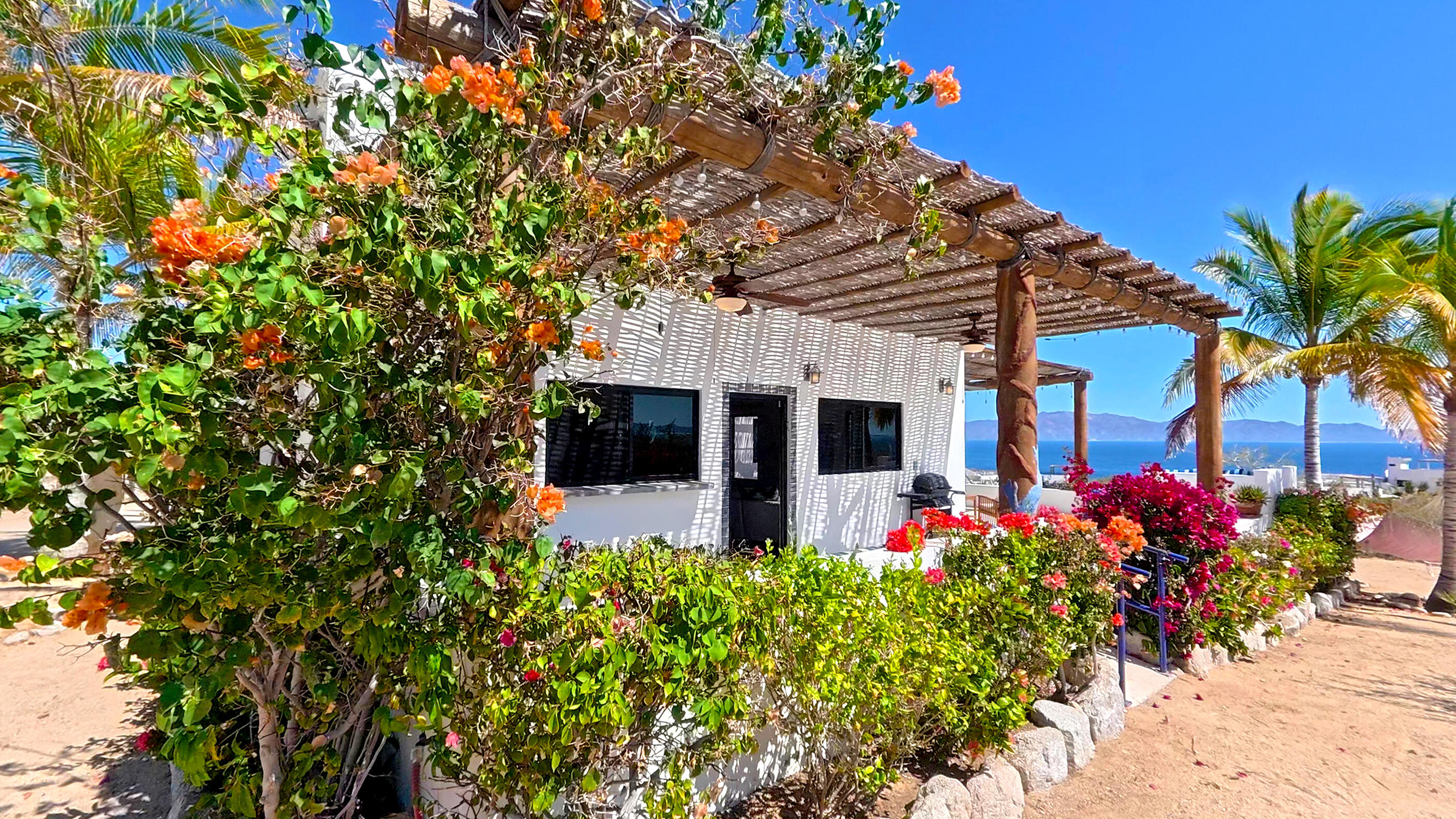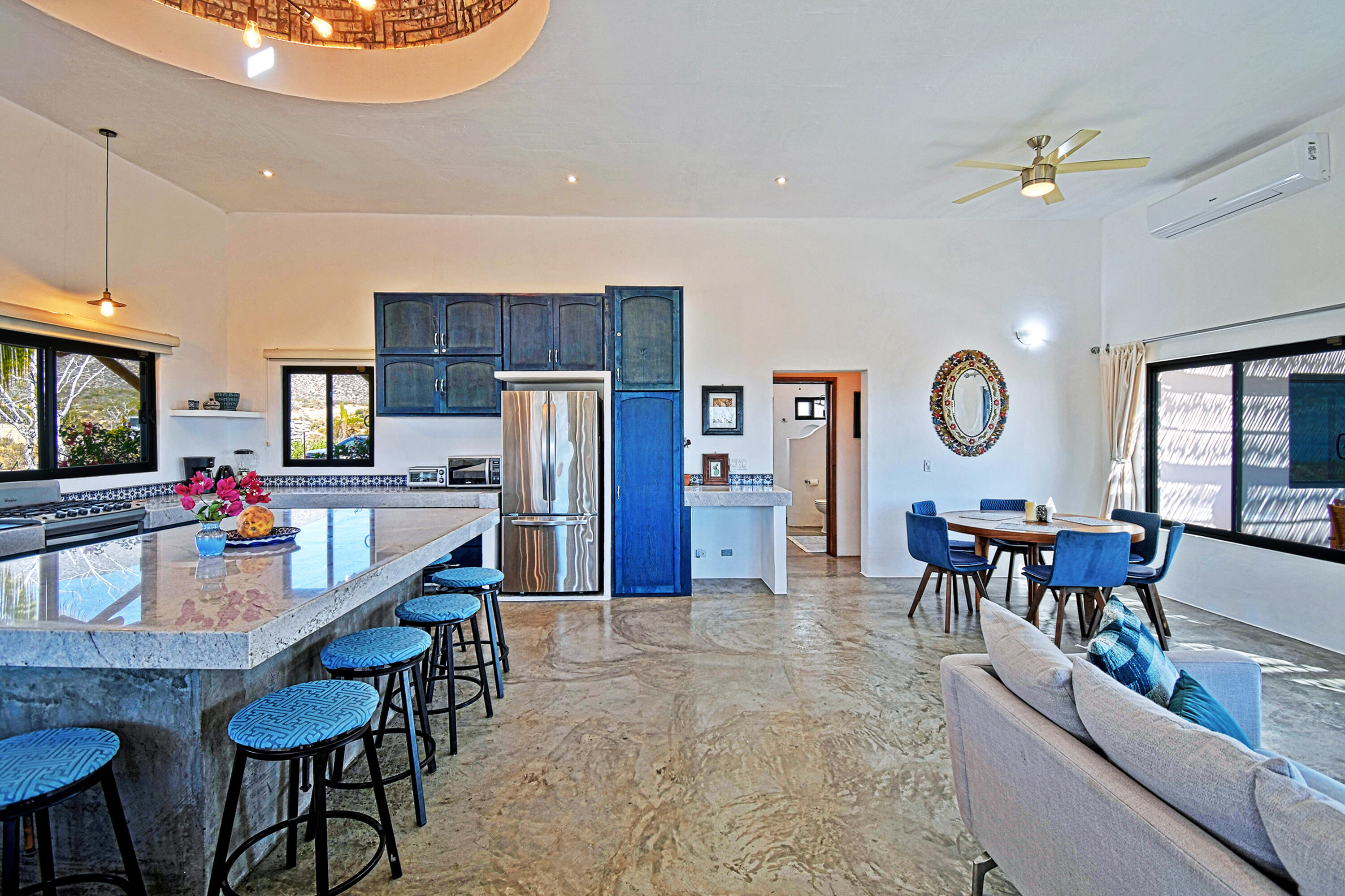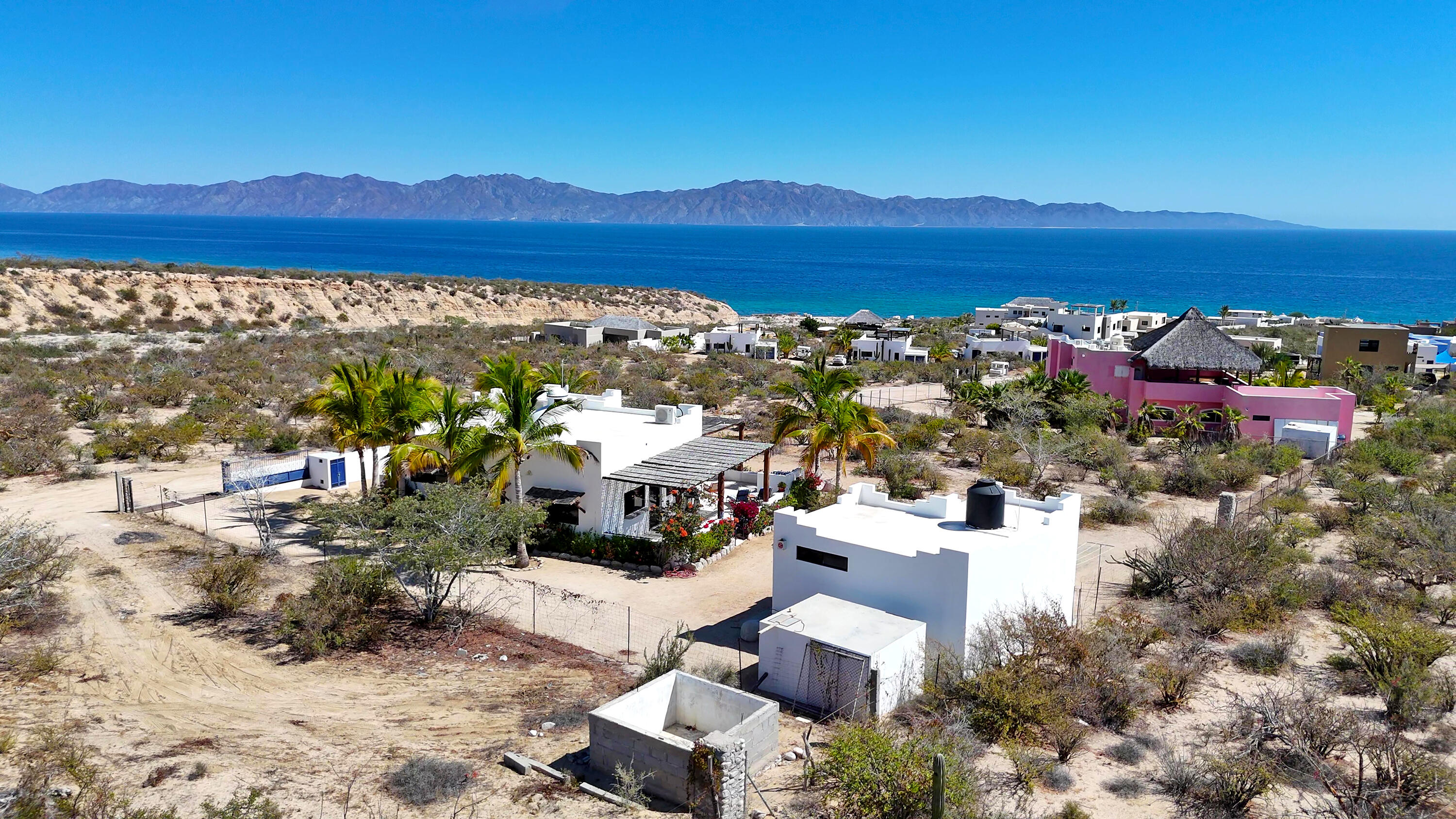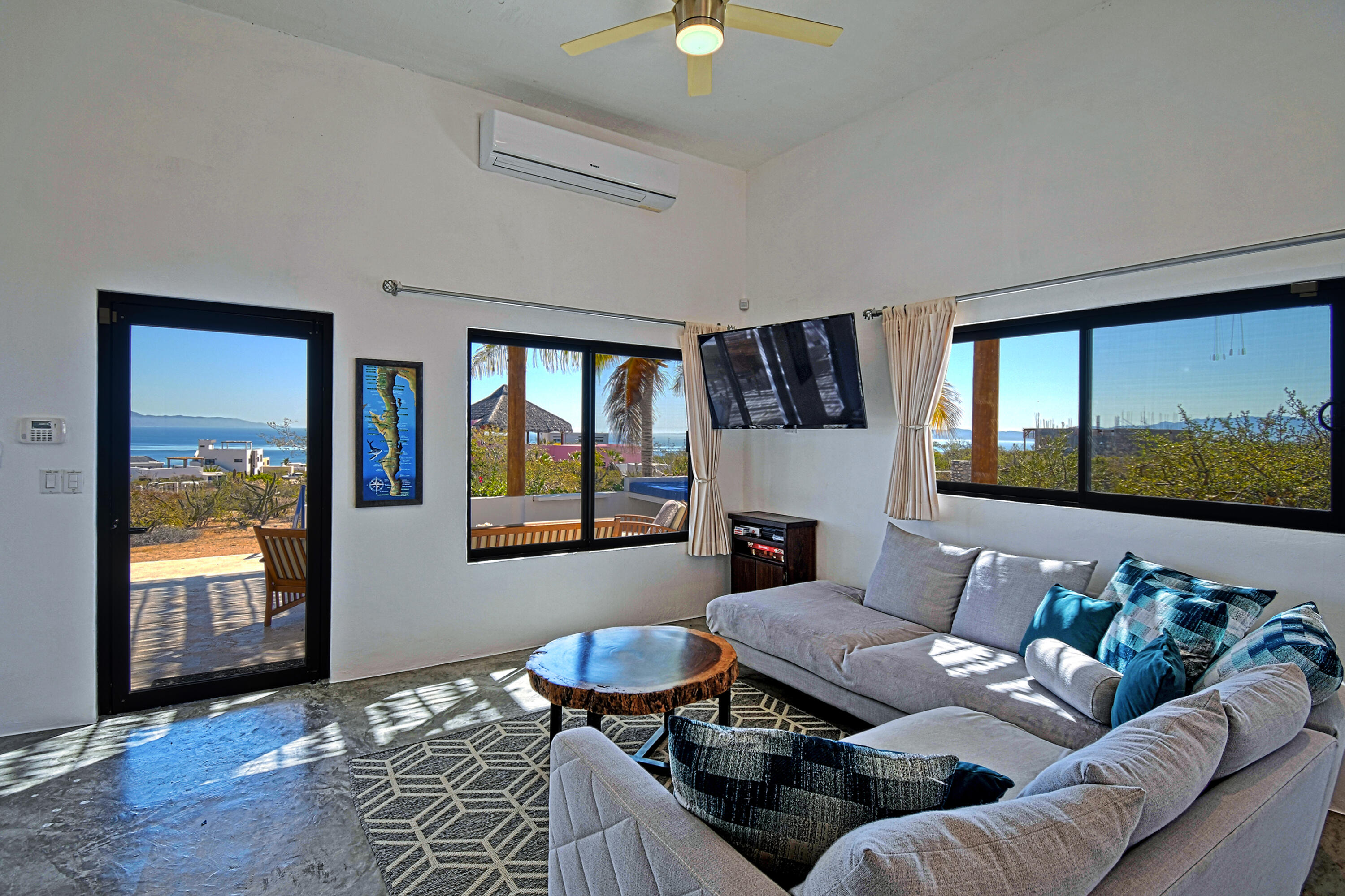 Bright, breezy, and full of Baja charm, this stunning 2-bedroom, 2-bath home offers effortless indoor-outdoor living. The open-concept great room centers around a spacious kitchen island beneath a striking brick cupula, with bold blue cabinetry set against crisp white walls for a fresh coastal feel. Large windows flood the home with natural light and showcase sweeping desert and Sea of Cortes views. Enjoy the outdoors from a pergola-shaded patio with multiple lounge areas, surrounded by lush bougainvillea and mature palms. Includes adjacent lot for protected views, plus a one car garage and dedicated laundry room. Located just minutes from sandy beaches and world class mountain bike/hiking trails.