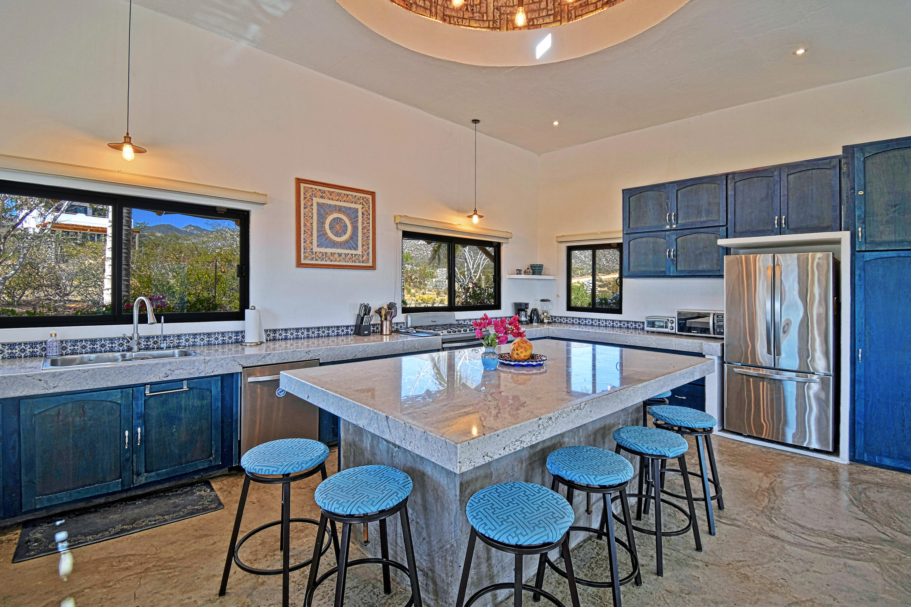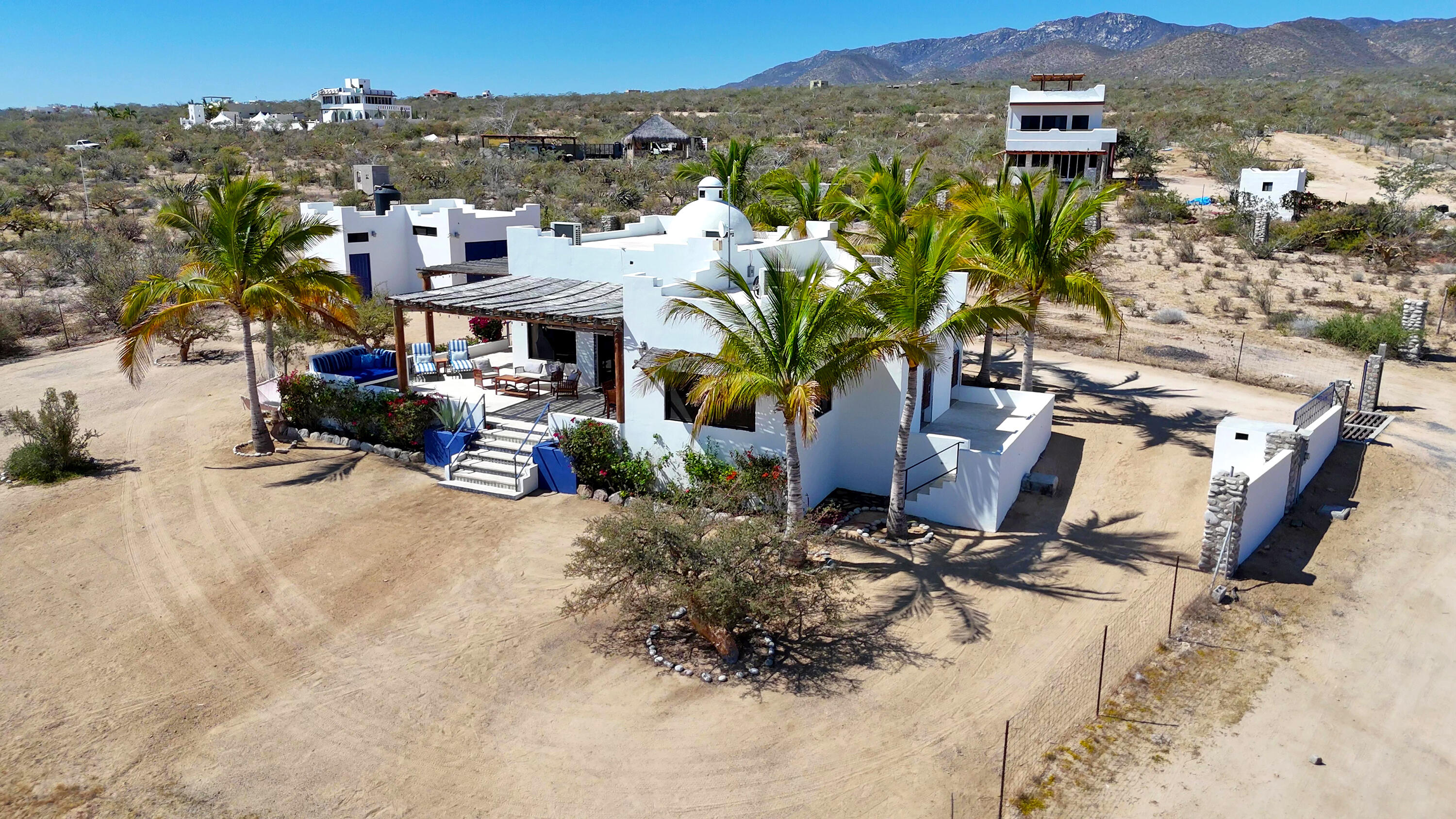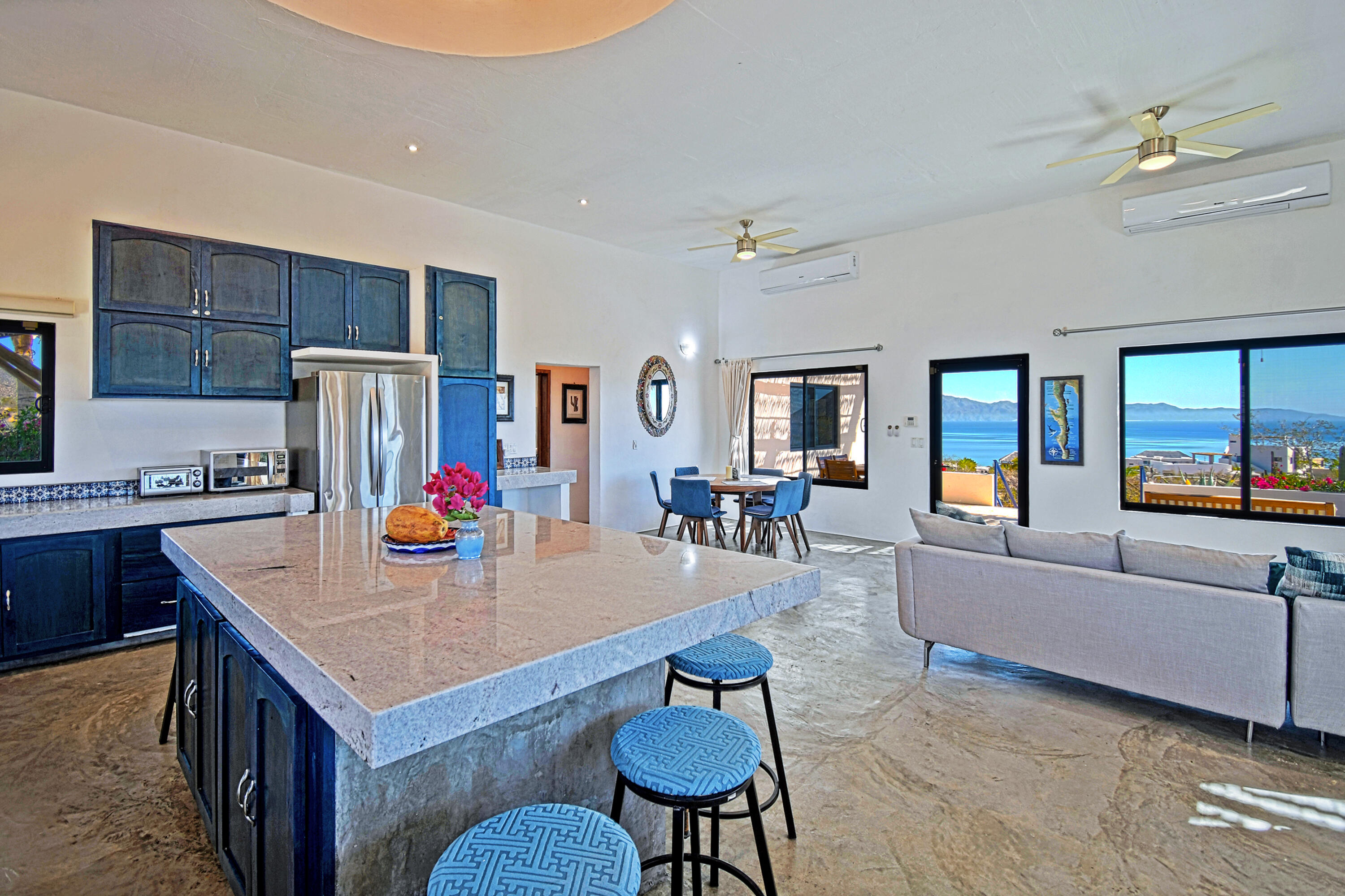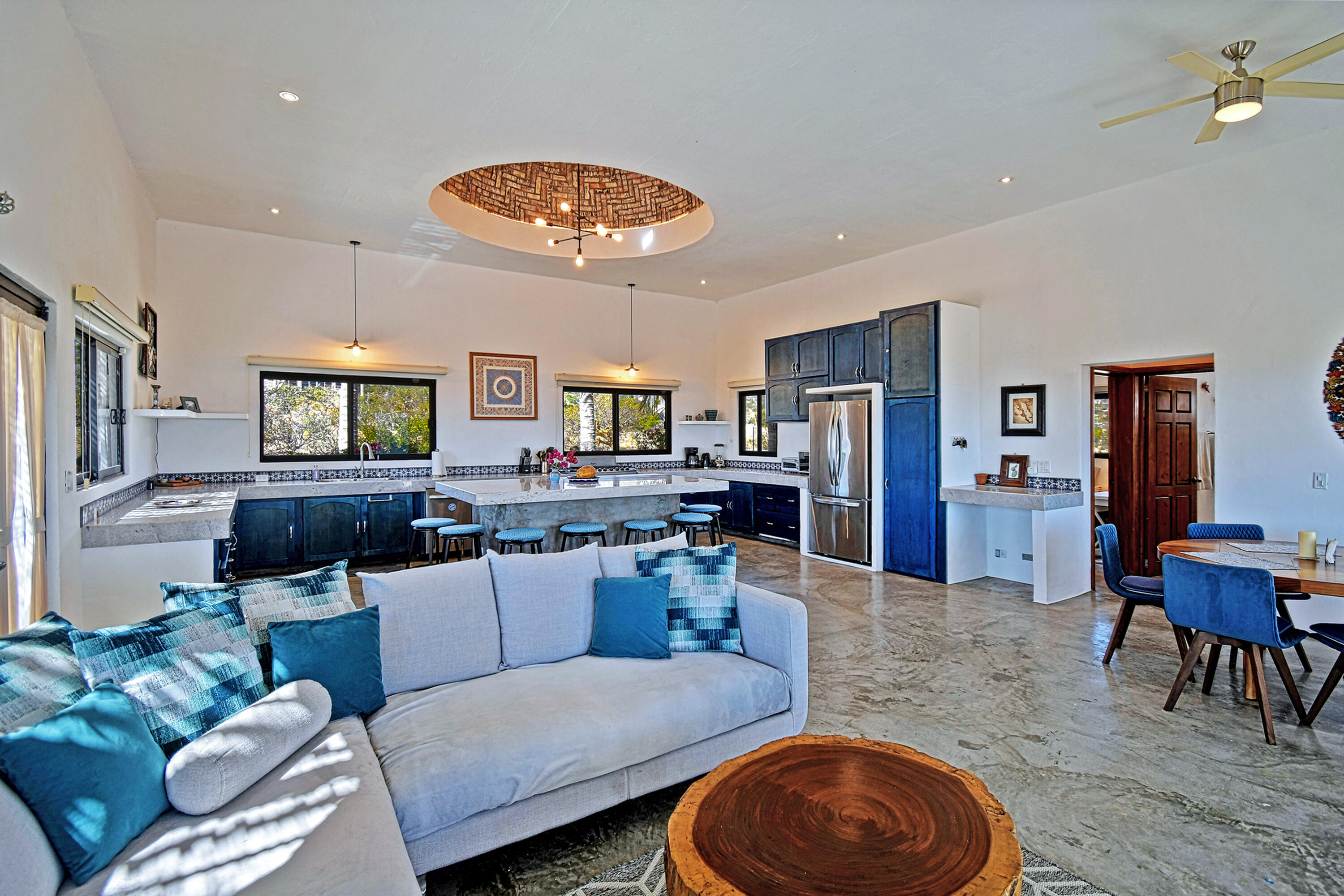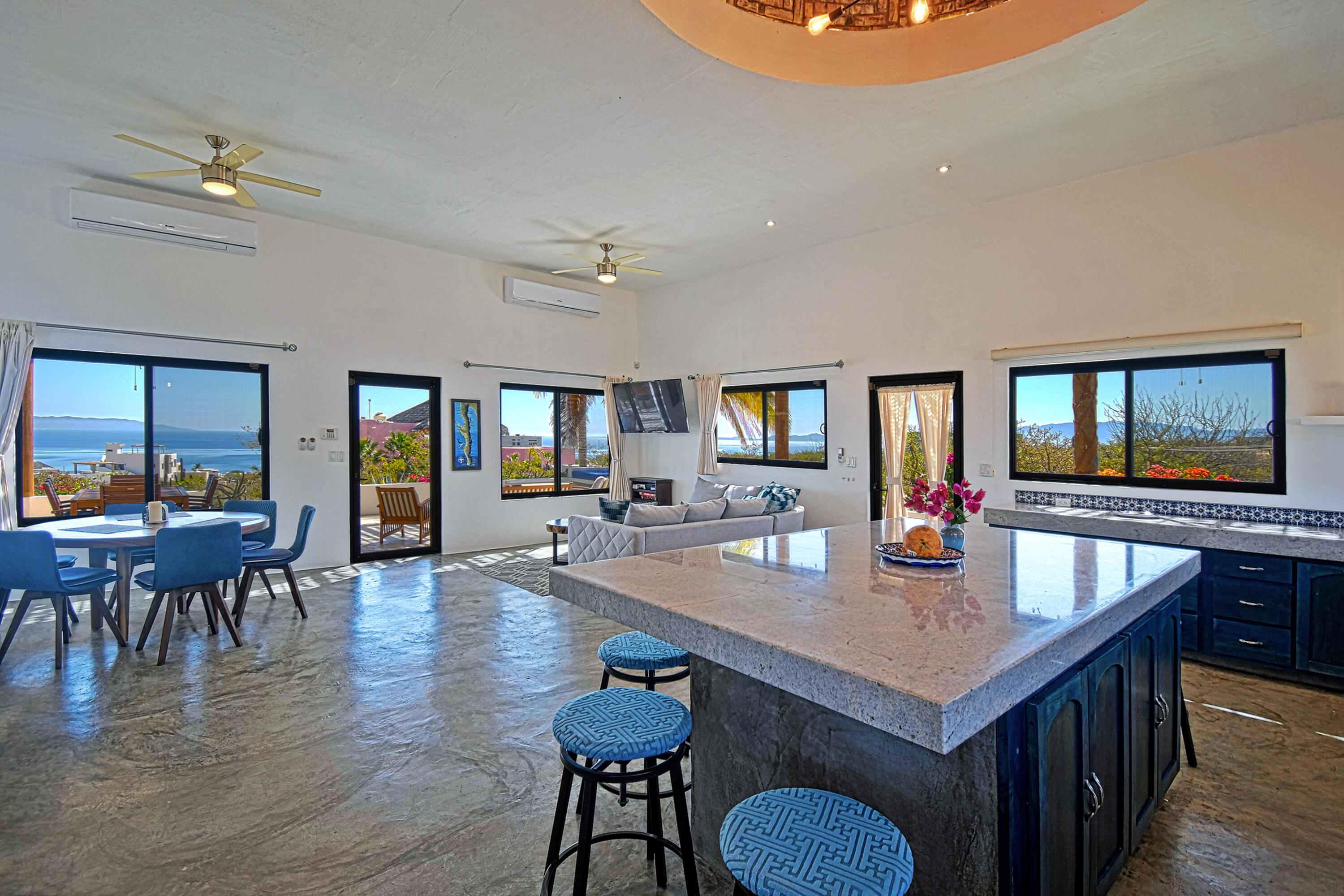 Bright, breezy, and full of Baja charm, this stunning 2-bedroom, 2-bath home offers effortless indoor-outdoor living. The open-concept great room centers around a spacious kitchen island beneath a striking brick cupula, with bold blue cabinetry set against crisp white walls for a fresh coastal feel. Large windows flood the home with natural light and showcase sweeping desert and Sea of Cortes views. Enjoy the outdoors from a pergola-shaded patio with multiple lounge areas, surrounded by lush bougainvillea and mature palms. Includes adjacent lot for protected views, plus a one car garage and dedicated laundry room. Located just minutes from sandy beaches and world class mountain bike/hiking trails.