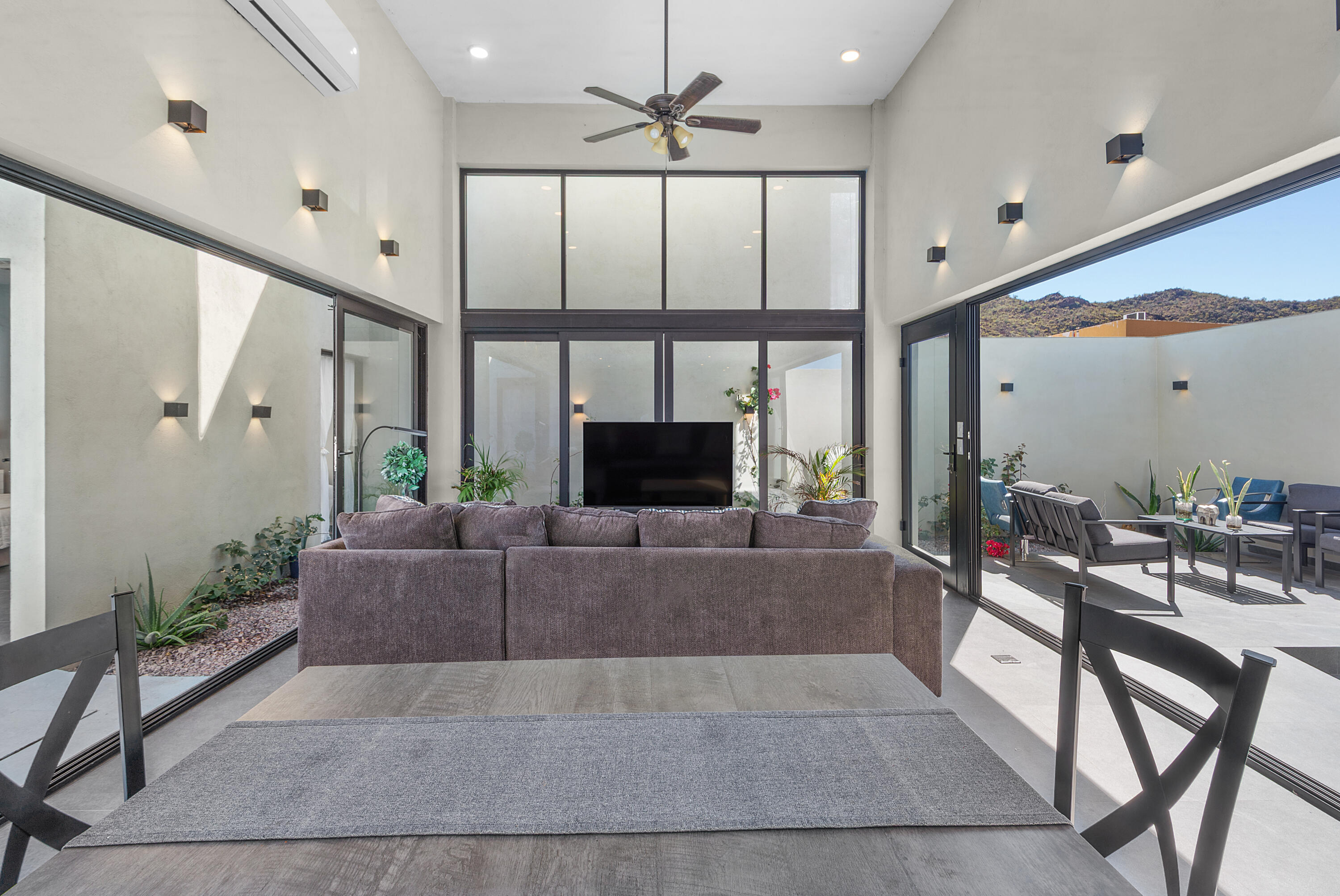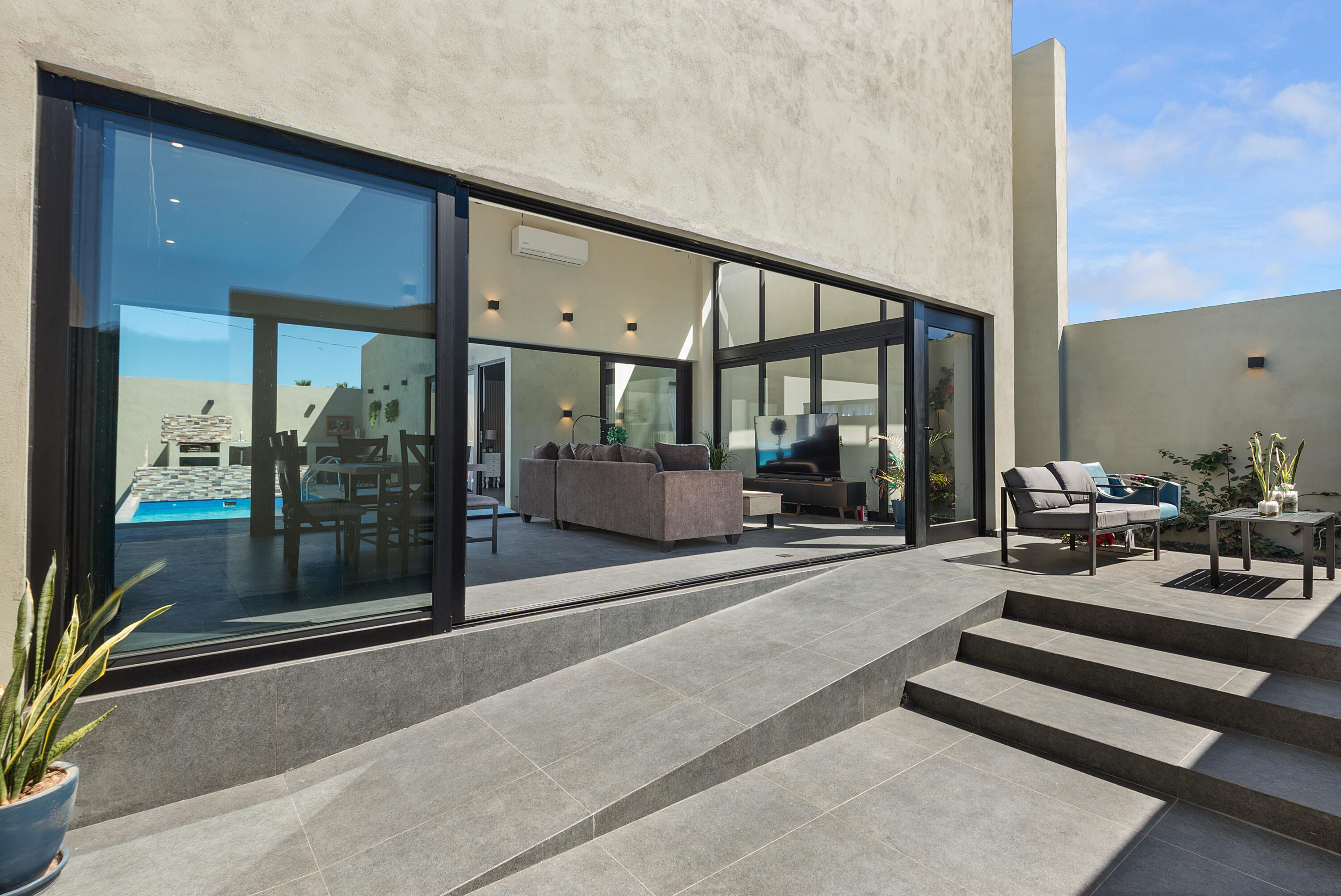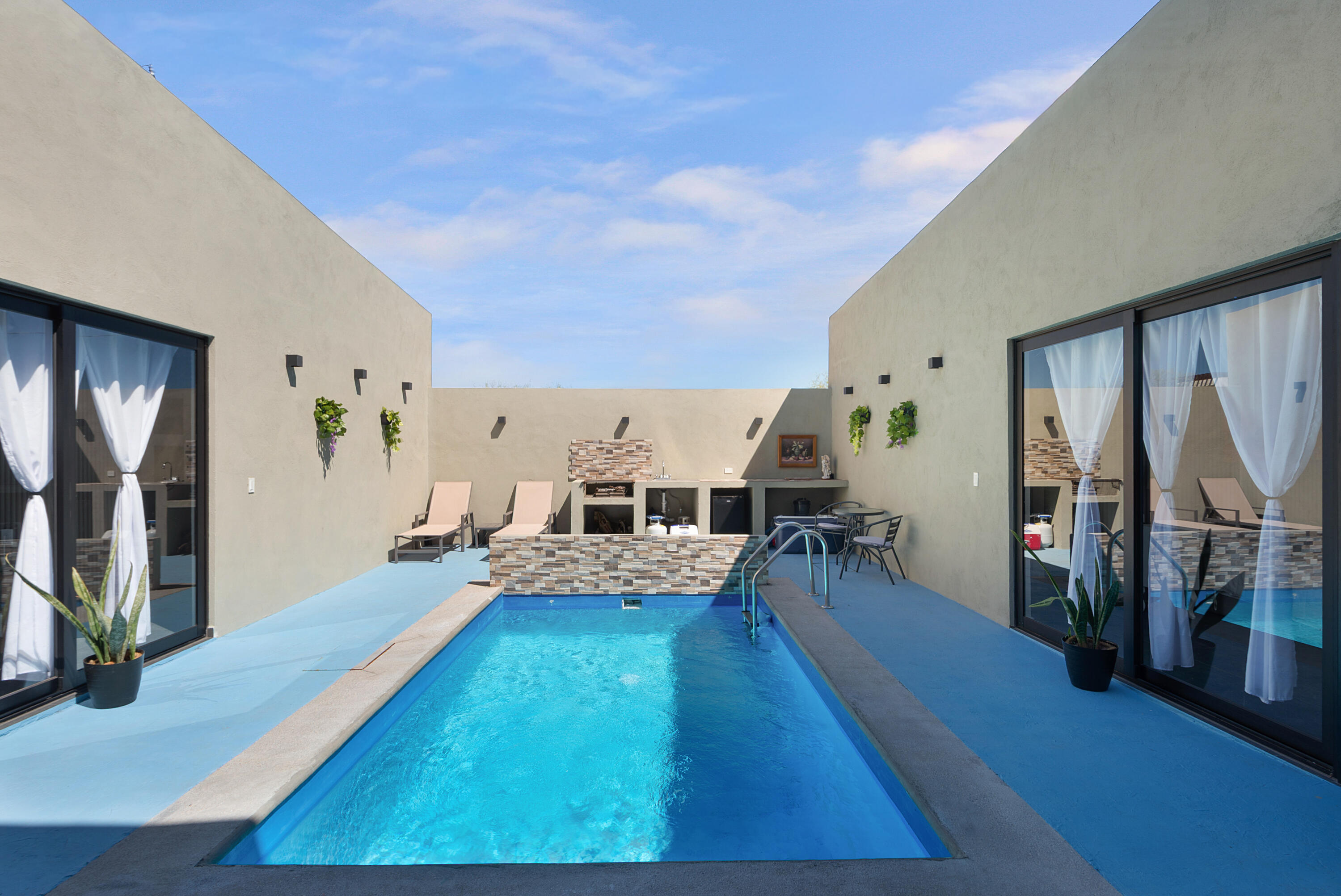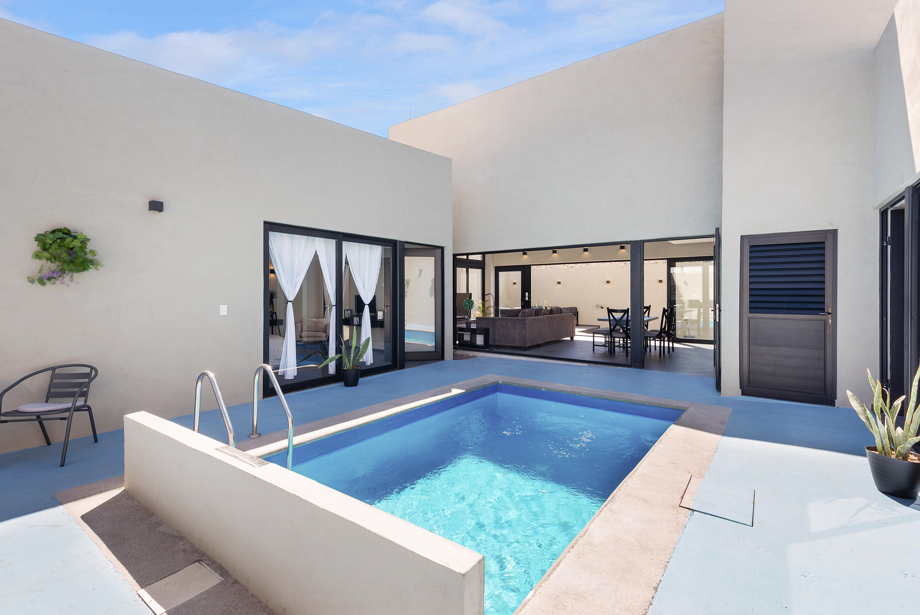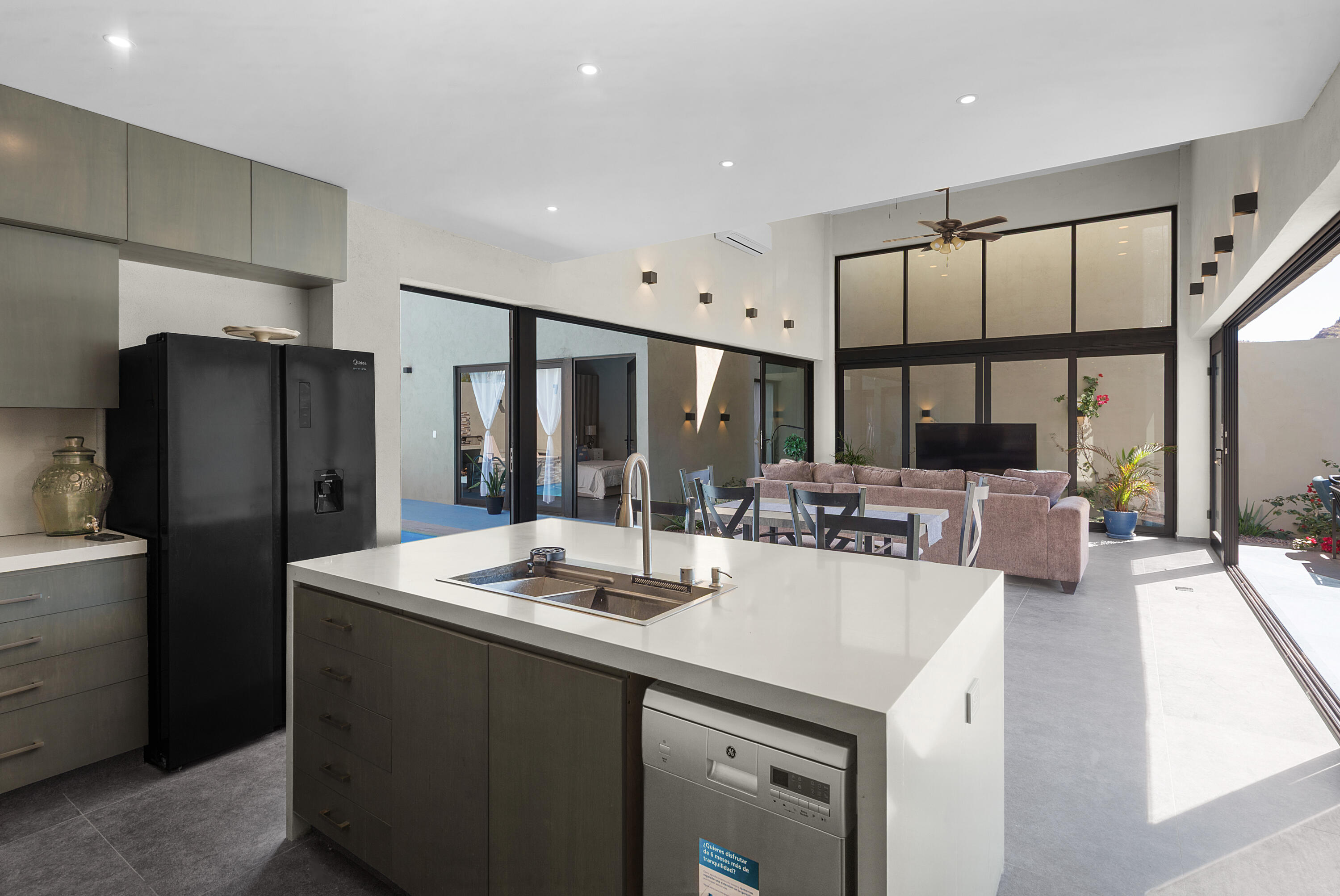 Casa San Antonio - Contemporary Comfort in a Private Setting - Casa San Antonio is a beautifully designed single-story residence that blends clean contemporary architecture with the tranquility of Baja living. Centered around a light-filled interior patio, the home creates a seamless connection between indoor and outdoor spaces while offering privacy and comfort throughout. The layout features two spacious primary suites, each with its own ensuite bath, plus a convenient half bath for guests. The open-concept living and dining areas flow effortlessly toward the outdoor terrace and private swimming pool -- ideal for relaxing, entertaining, or simply enjoying the peaceful surroundings.