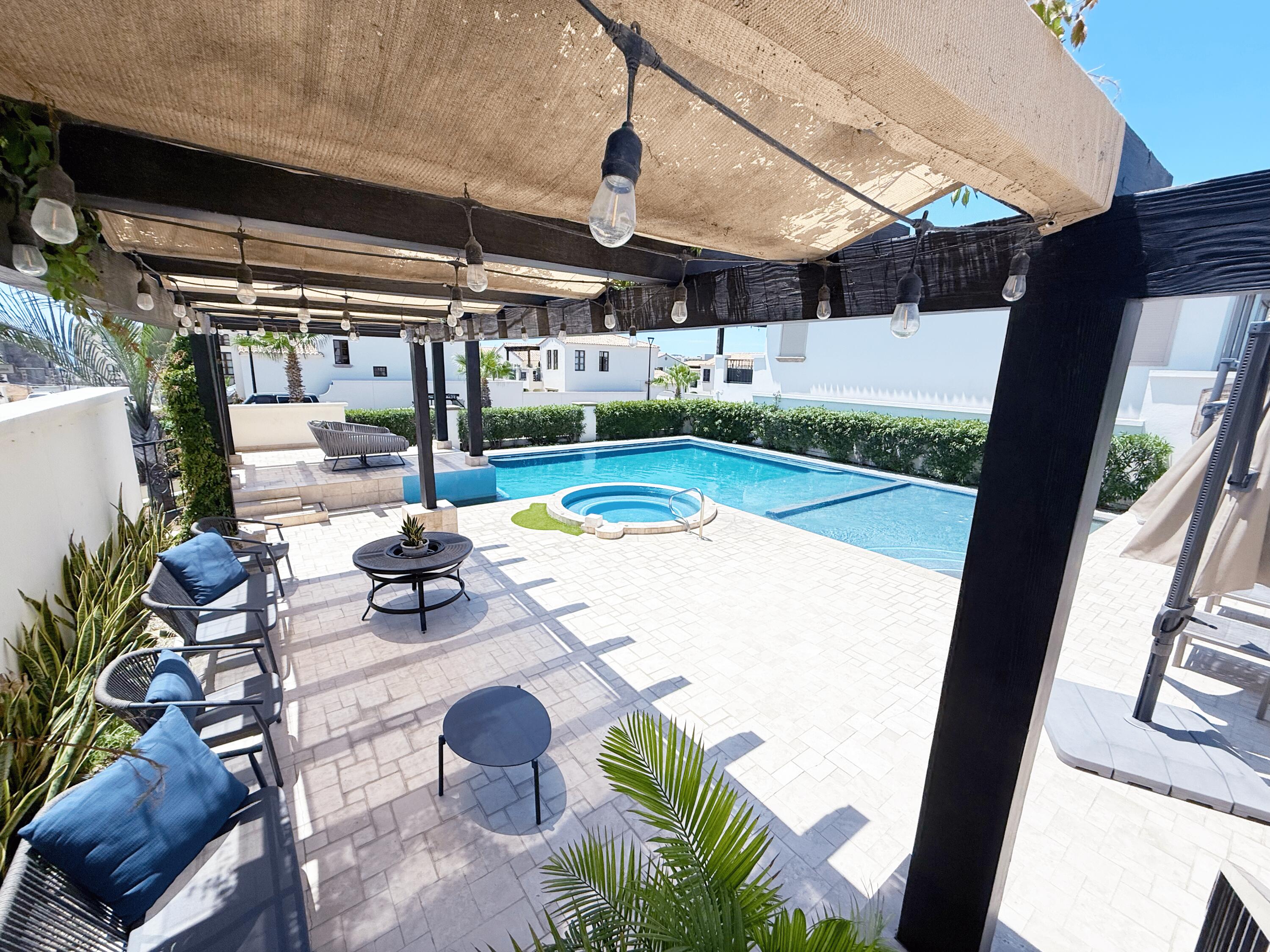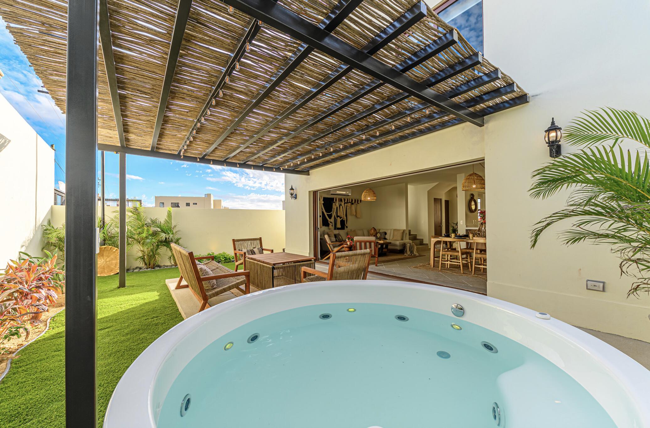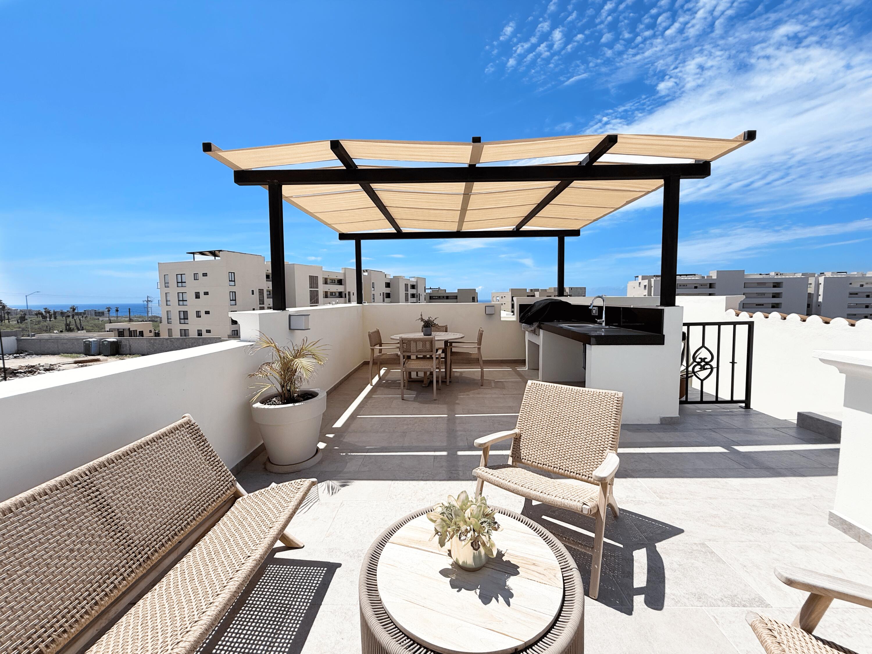 Exclusive community in El Tezal, just minutes from the beach, the Cabo Marina, and Cosco. Phase II offers only 39 homes and a clubhouse with pool, jacuzzi, gym, and social areas. The San Bernardino model features 2 levels plus a rooftop deck: open living/dining, quartz kitchen with appliances, half bath, and spacious patio. Upstairs: 3 bedrooms, 2 baths, laundry. The primary suite includes a front terrace overlooking the community. Rooftop deck is ideal for sunsets and gatherings. Covered parking for 2, high-end finishes, closets, marble vanities, and AC mini splits included. Select homes ready for immediate delivery.