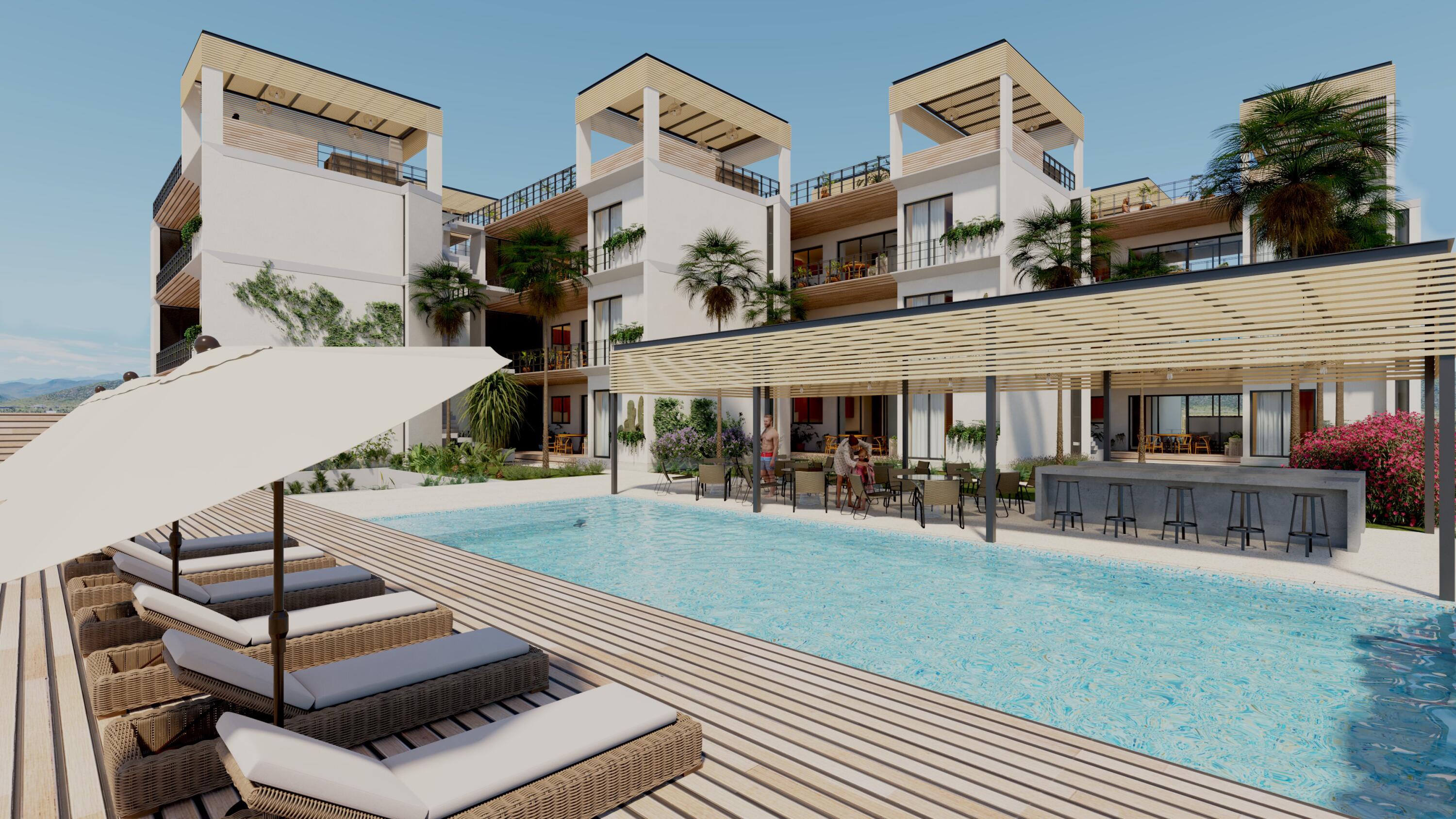 COMPLETION A FEW MONTHS AWAY! Unit 401 is a ground-floor corner sunrise suite offering seamless walk-in, walk-out access and exceptional indoor-outdoor living. Enjoy breathtaking ocean sunrises each morning from your private, fully enclosed covered patio that functions as a second living space, ideal for entertaining, families, and pets. This 2-bed, 2-bath split-layout unit comes complete with appliances, with custom furniture package available. There is still time to personalize finishes and add features like a hot tub or outdoor kitchen, you dream it, we will build it. Ciudad offers resort-style amenities including a lounge pool, on-site bar, and restaurant. Construction is nearing completion, and pre-sale pricing remains available for a limited time. Only two ground-floor units remain