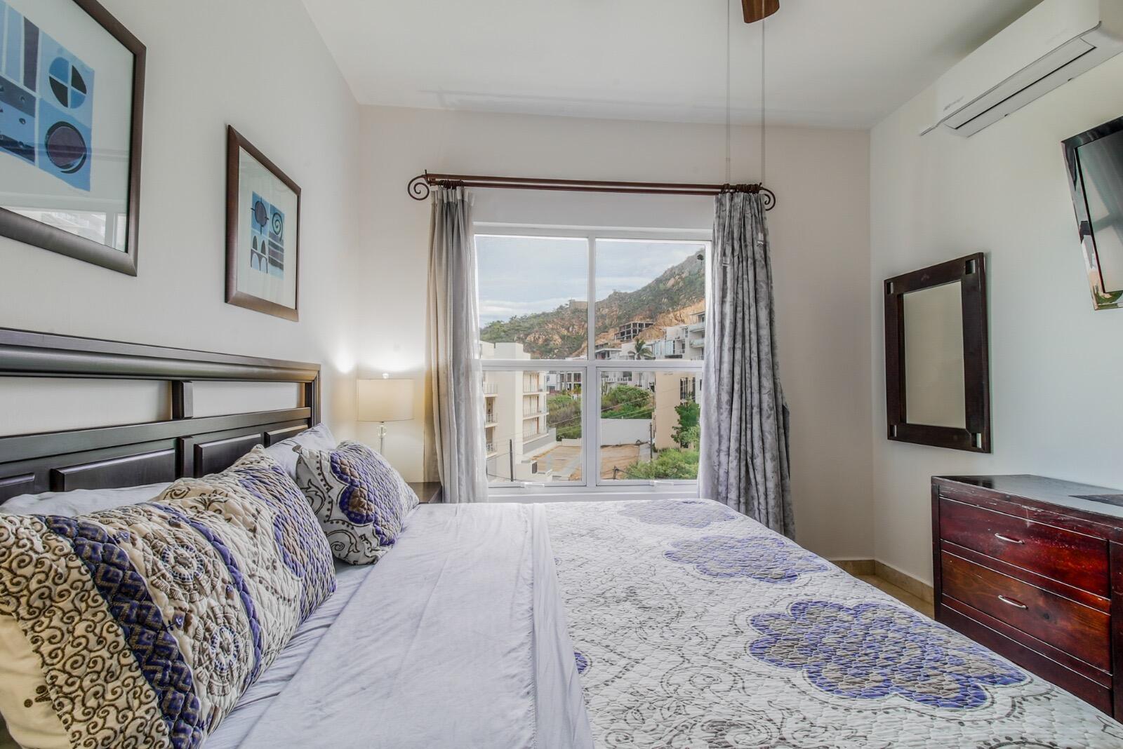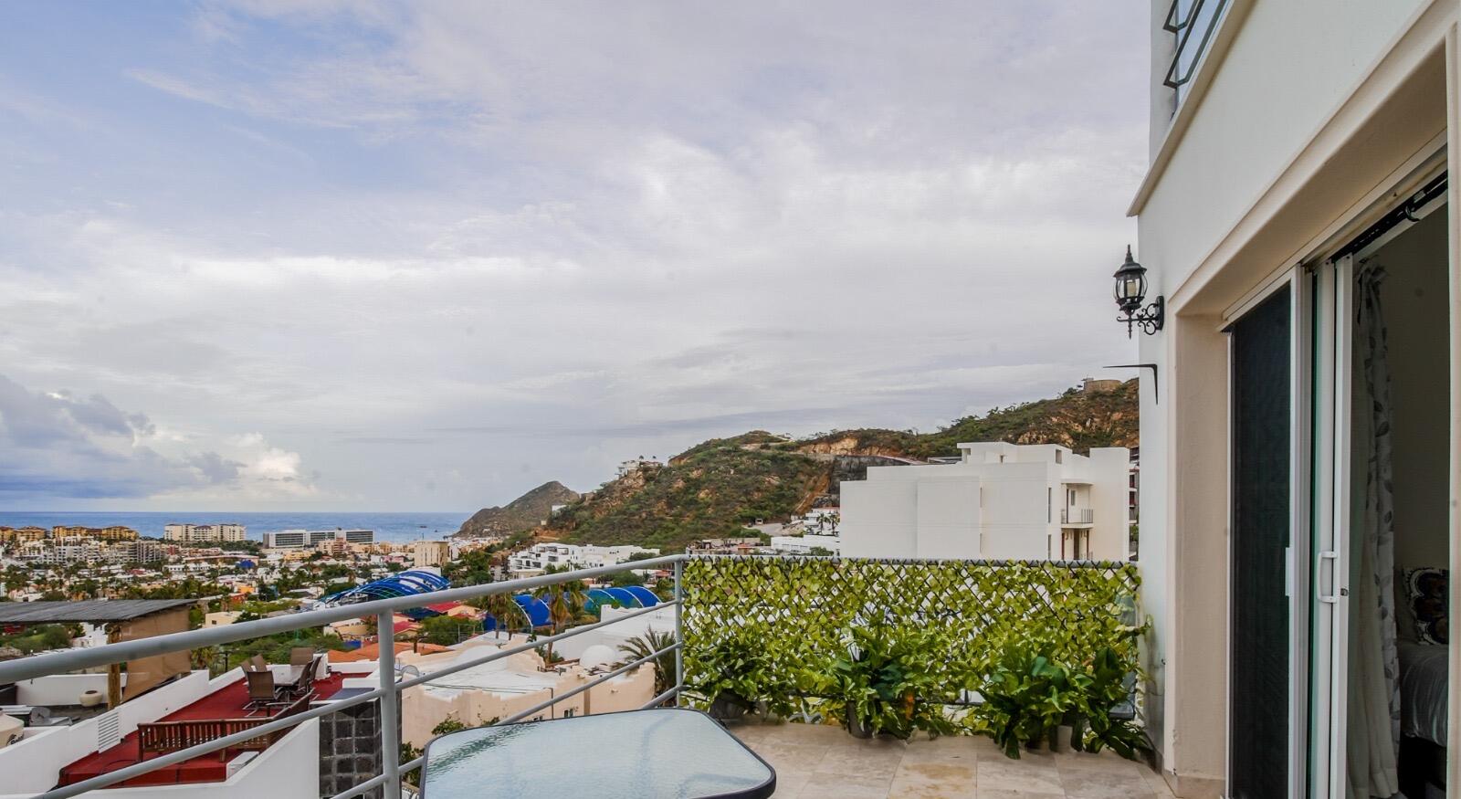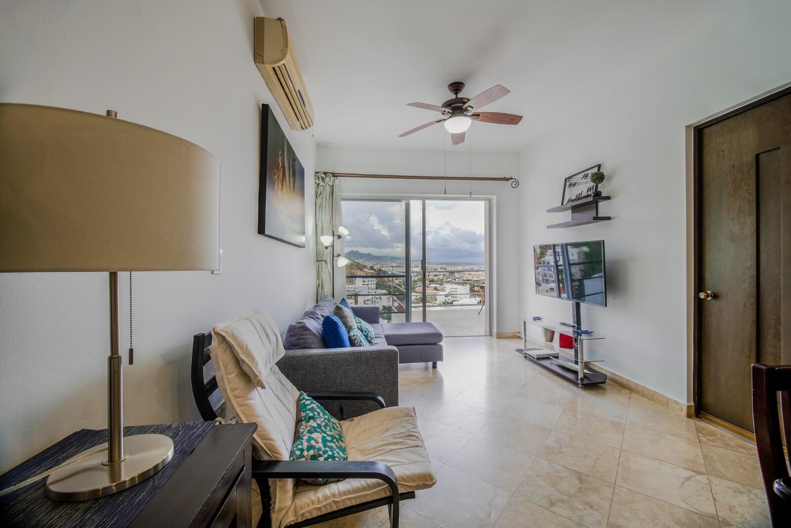 Priced to sell fast!!! Oceanview two bedroom two bathroom condo at San Charbel Cabo San Lucas. The condo is located on the second floor of the complex southern building, giving great panoramic ocean and city views from both bedrooms and from the ample terrace. The condo has beautiful marble floors throughout the condo, wooden cabinets, closets and doors, AC mini splits and fans in each room. Primary bedroom with direct access to terrace, king size bed, tv, enclosed bathroom with closet and marble tiles finishes; the spacious living/kitchen area with access to terrace through sliding window doors, living with tv and couch, the L shape kitchen is equipped with granite countertops, marble splash tiles, 4 seat dine table, buffet with mirror plus, fridge, range, hood, microwave...