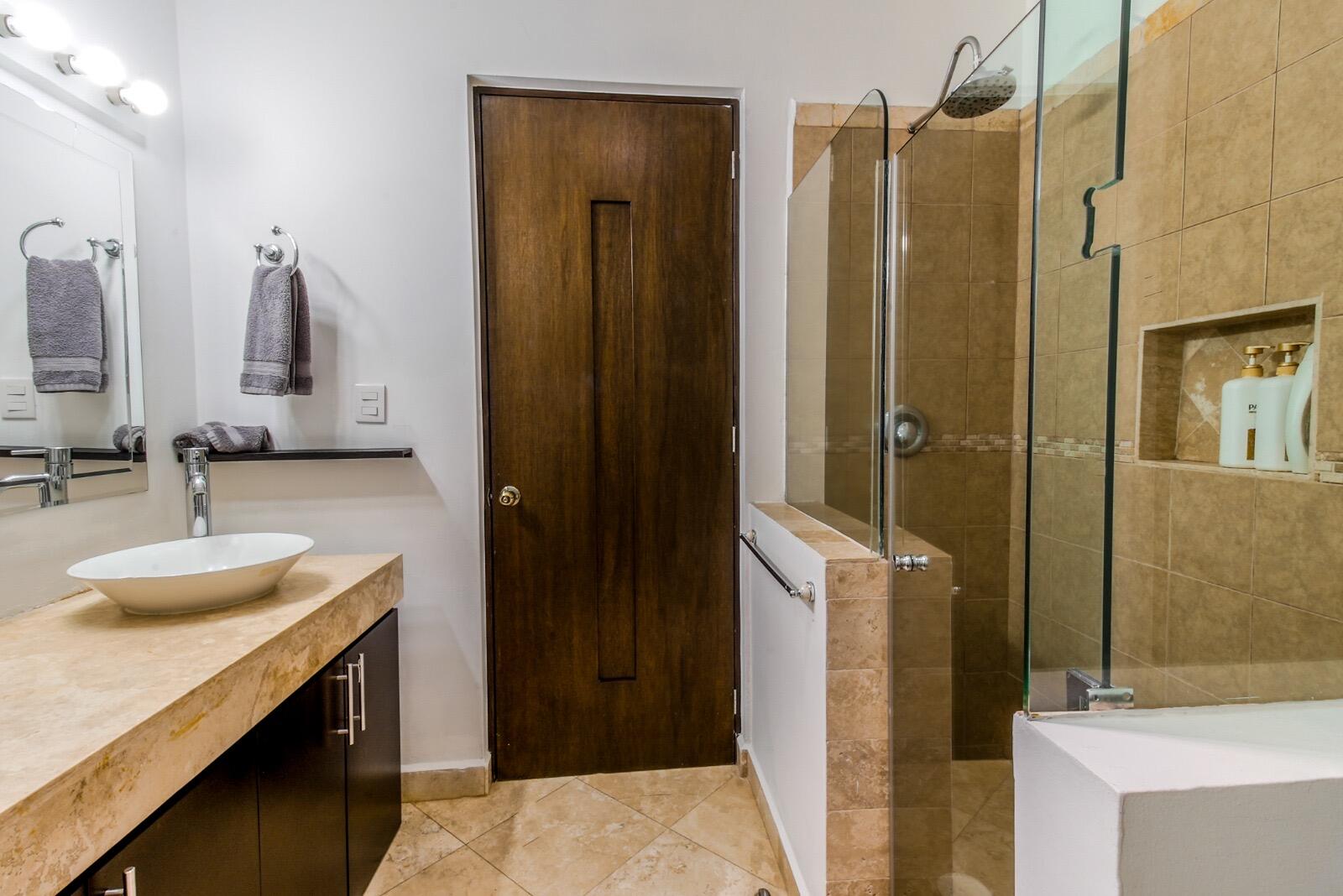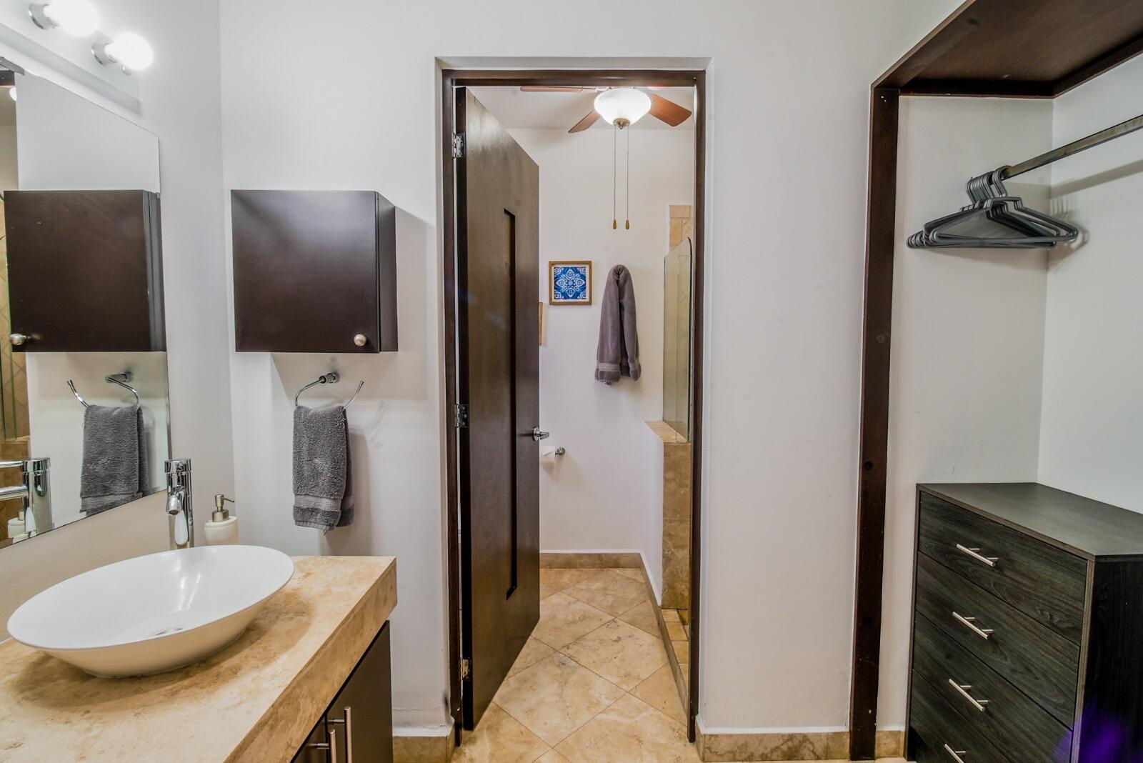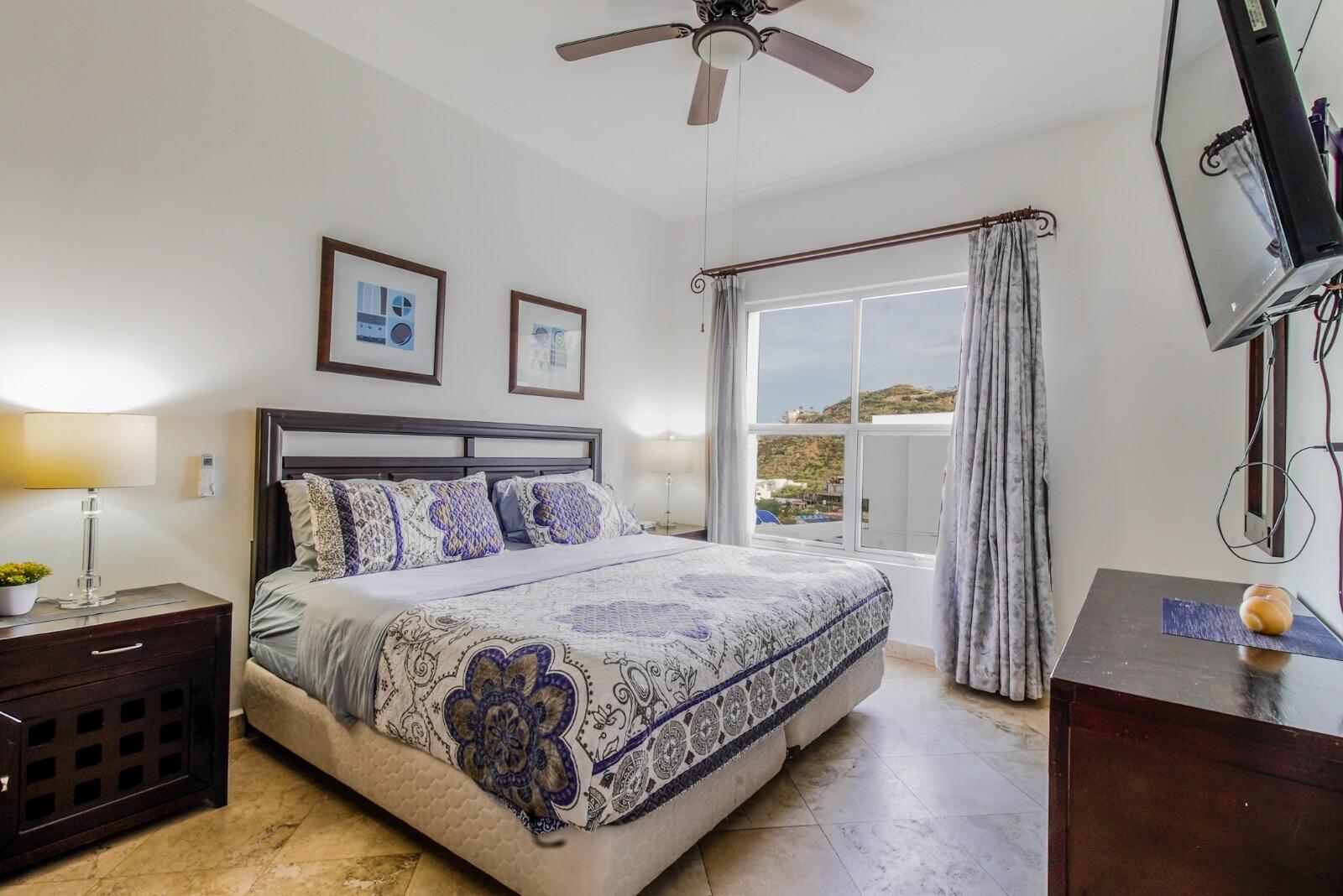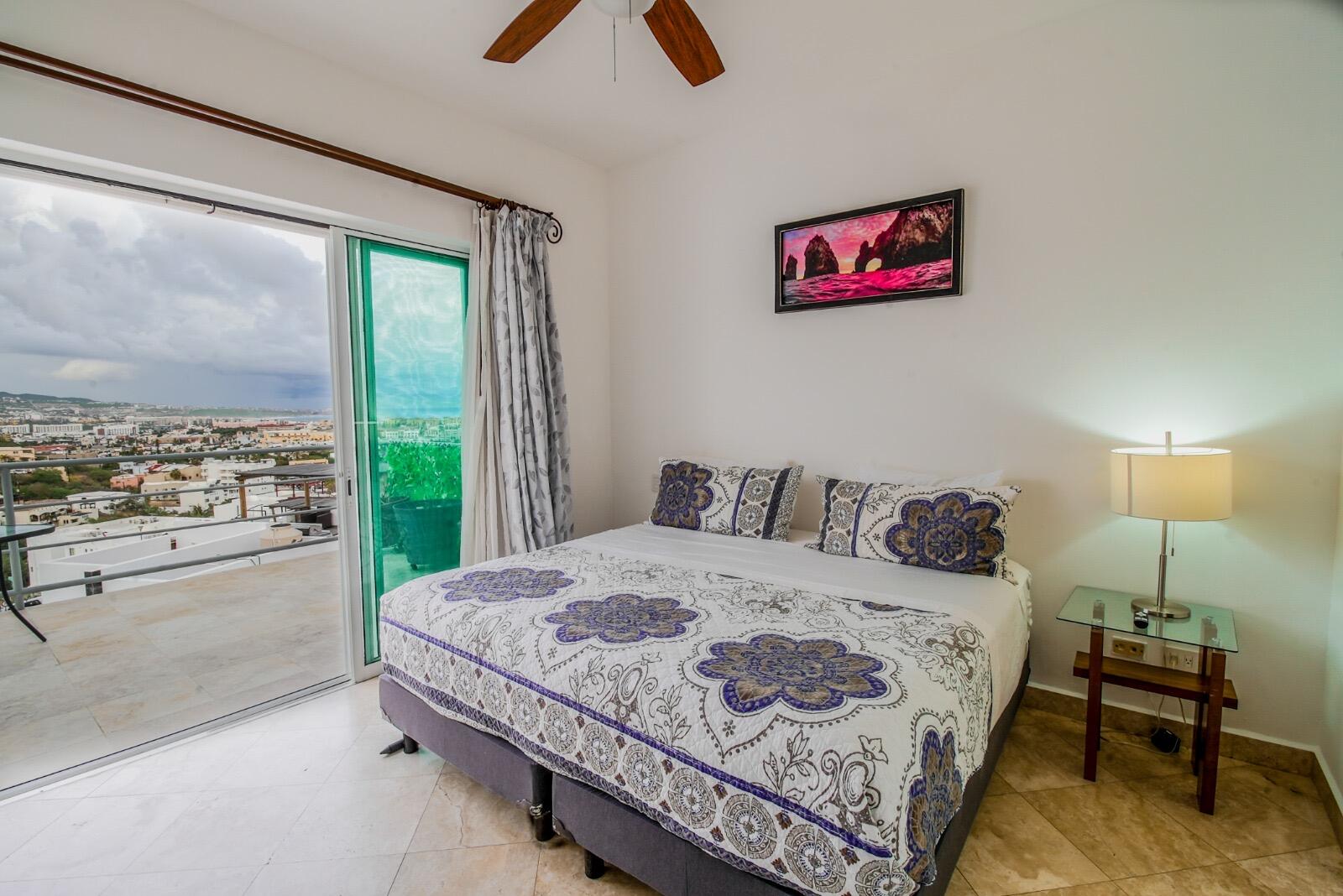 Priced to sell fast!!! Oceanview two bedroom two bathroom condo at San Charbel Cabo San Lucas. The condo is located on the second floor of the complex southern building, giving great panoramic ocean and city views from both bedrooms and from the ample terrace. The condo has beautiful marble floors throughout the condo, wooden cabinets, closets and doors, AC mini splits and fans in each room. Primary bedroom with direct access to terrace, king size bed, tv, enclosed bathroom with closet and marble tiles finishes; the spacious living/kitchen area with access to terrace through sliding window doors, living with tv and couch, the L shape kitchen is equipped with granite countertops, marble splash tiles, 4 seat dine table, buffet with mirror plus, fridge, range, hood, microwave...