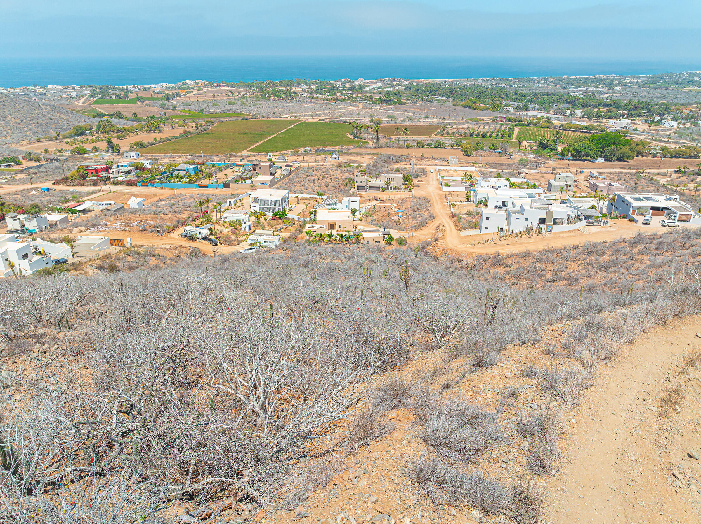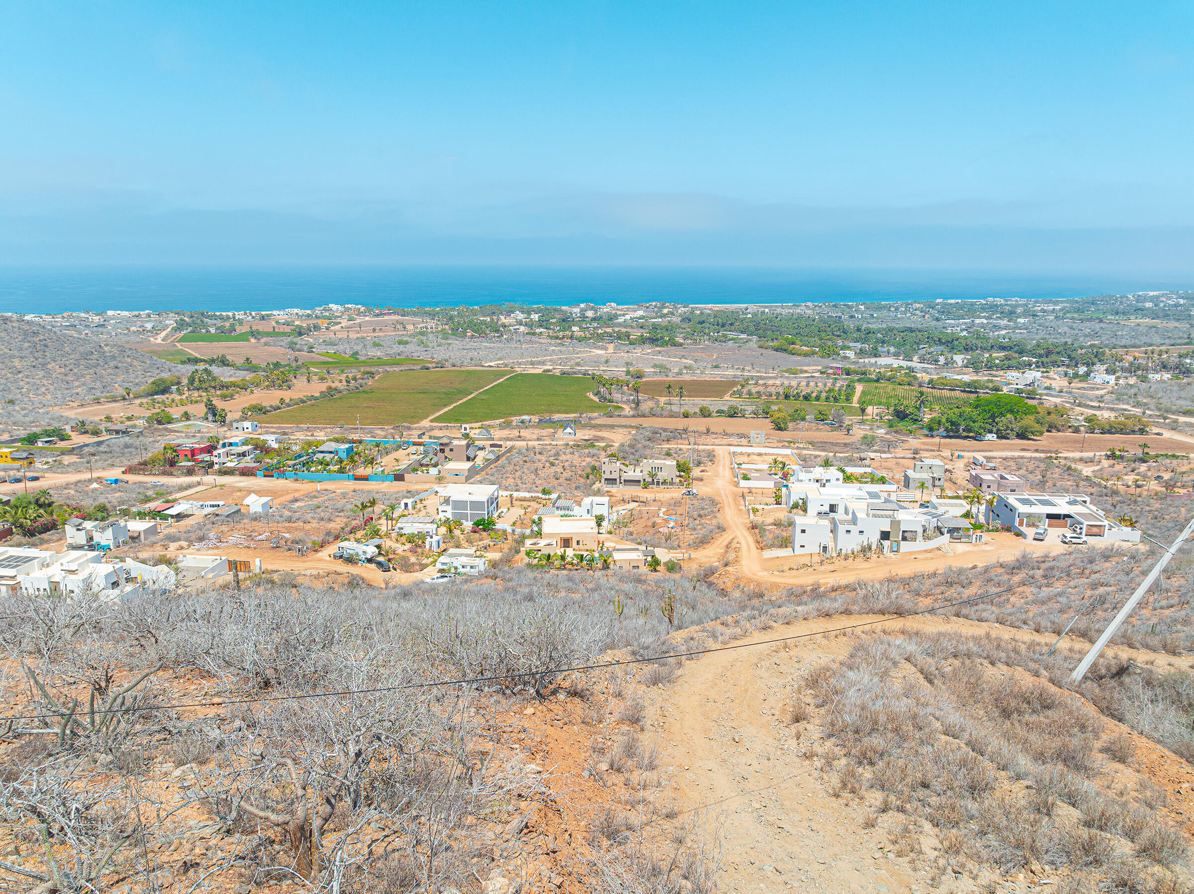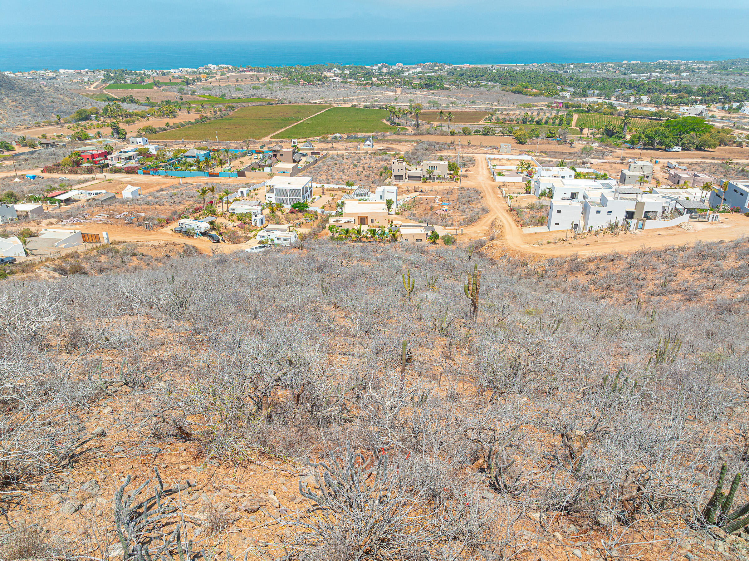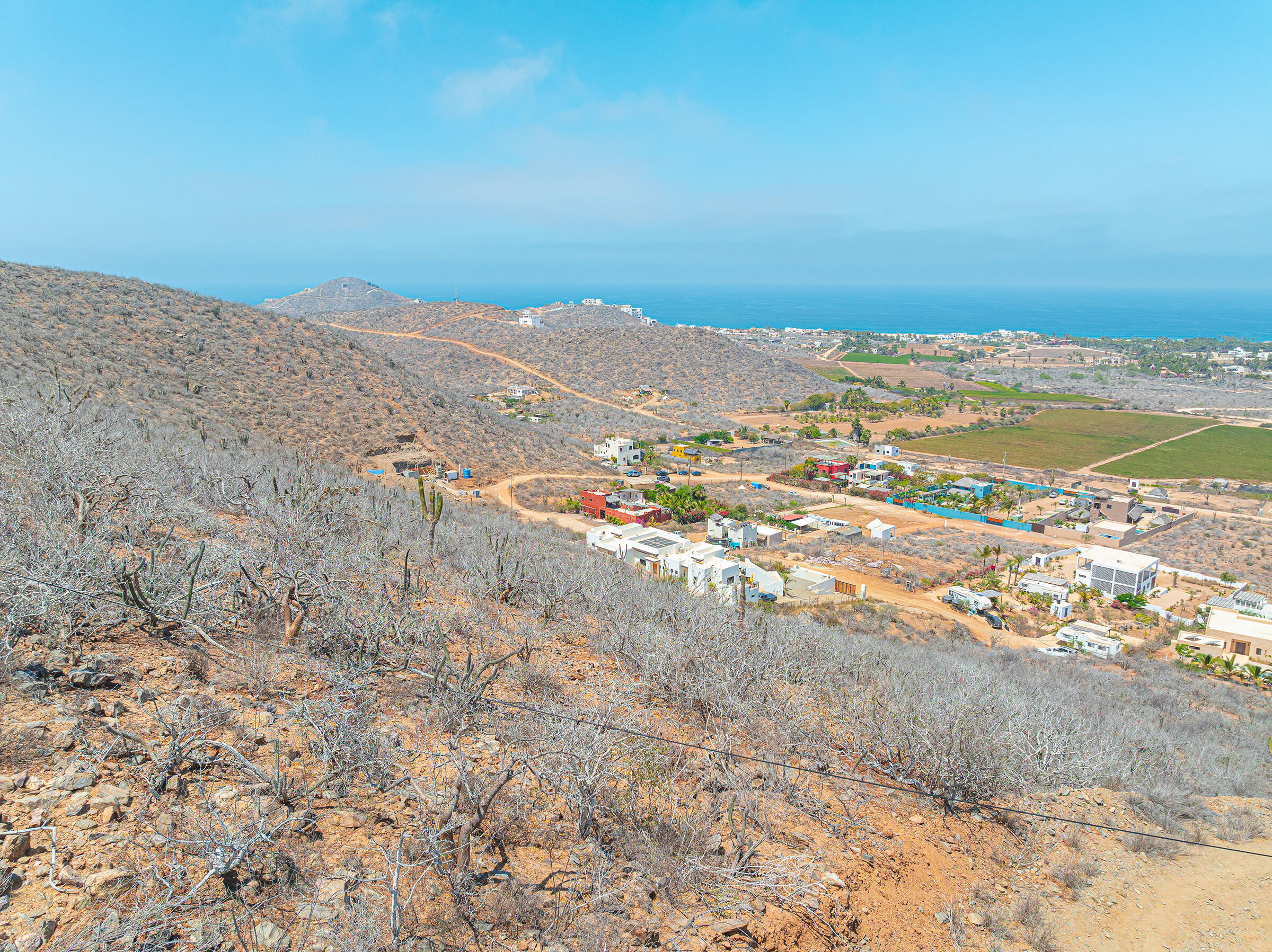 Set at the highest point of the mountain above Pescadero, this 1,830-square-meter homesite commands expansive views over the valley's huertas and along the Pacific coastline from Pescadero Beach to San Pedrito and Cerritos Beach. Access is steep and requires careful navigation, reinforcing the property's privacy and preserving its unobstructed sightlines.