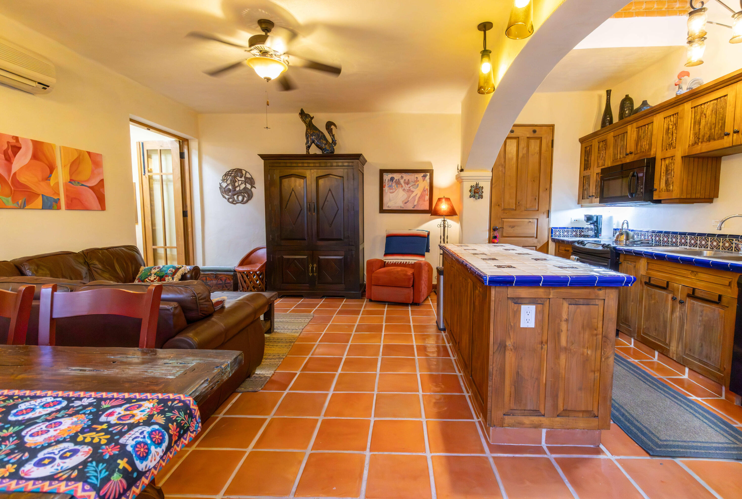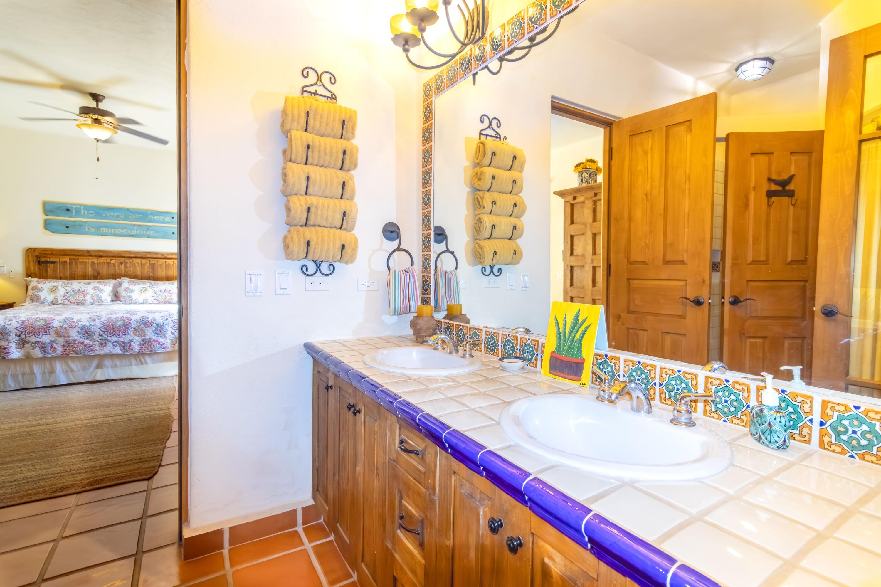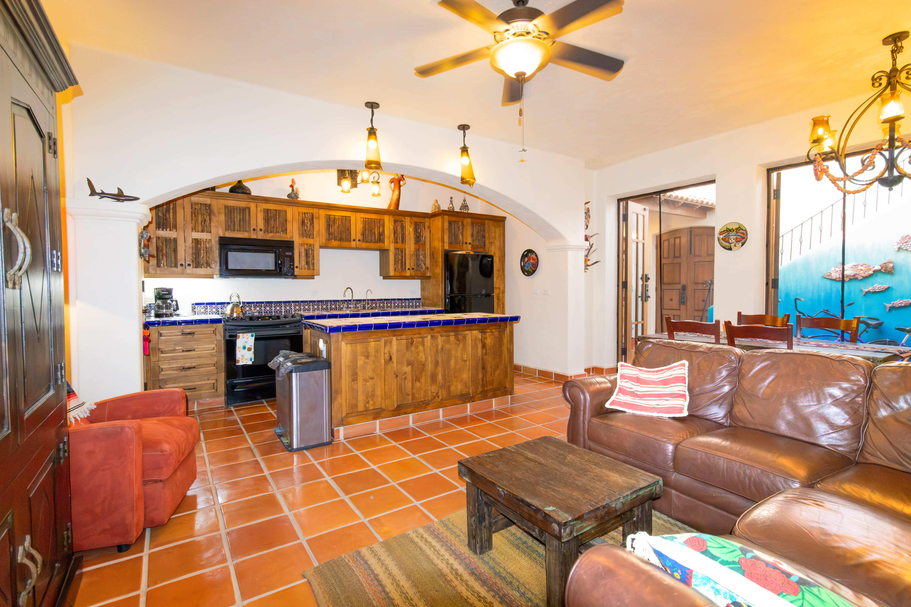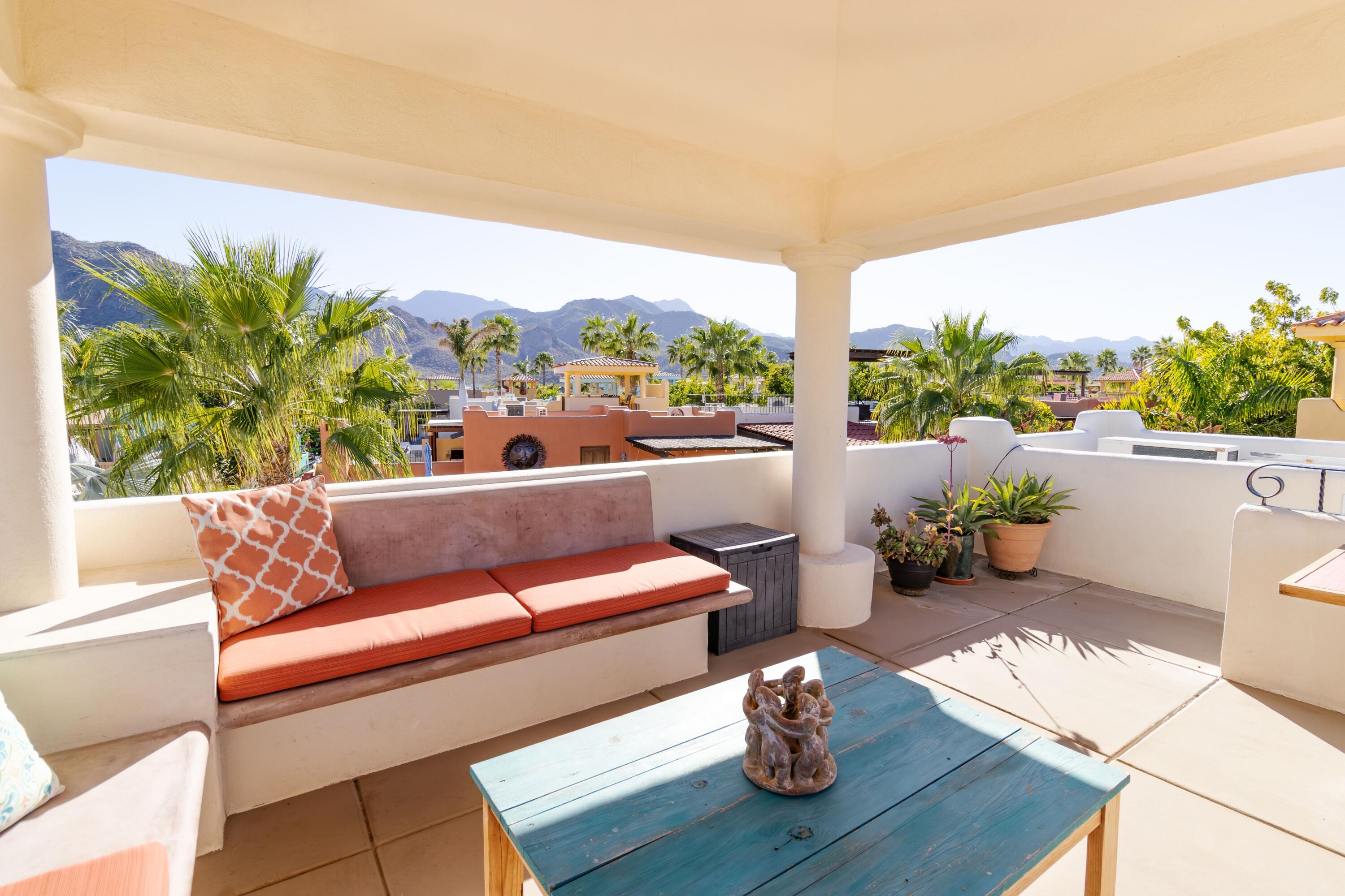 Welcome to FN 550, a vibrant Nueva Chica model ideally located on a corner lot in the beachside Founders area. Just steps from the lap pool and a short stroll to the beach, this home blends comfort with coastal charm. A covered entry, custom fishing gear cabinetry, and a bougainvillea-wrapped pergola welcome you in. The open-concept kitchen and dining area lead to a full bath and first-floor bedroom. Upstairs, enjoy a pergola-covered terrace perfect for grilling or relaxing, plus a spacious ensuite bedroom with Juliet balcony overlooking a fountain courtyard. A stone staircase leads to a tower viewing area with built-in seating and stunning sea and mountain views. Residents enjoy pools, golf, tennis, cafés, boutiques, 24/7 security, and easy access to Loreto town and the airpor