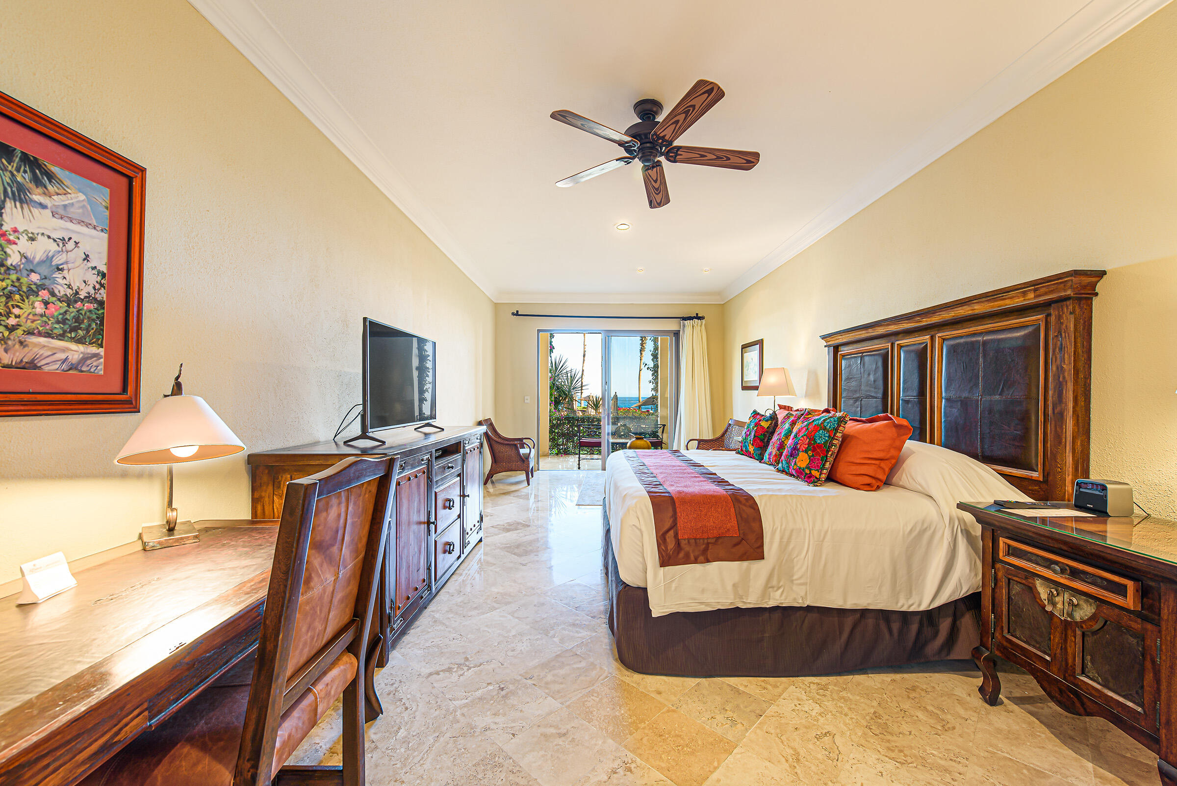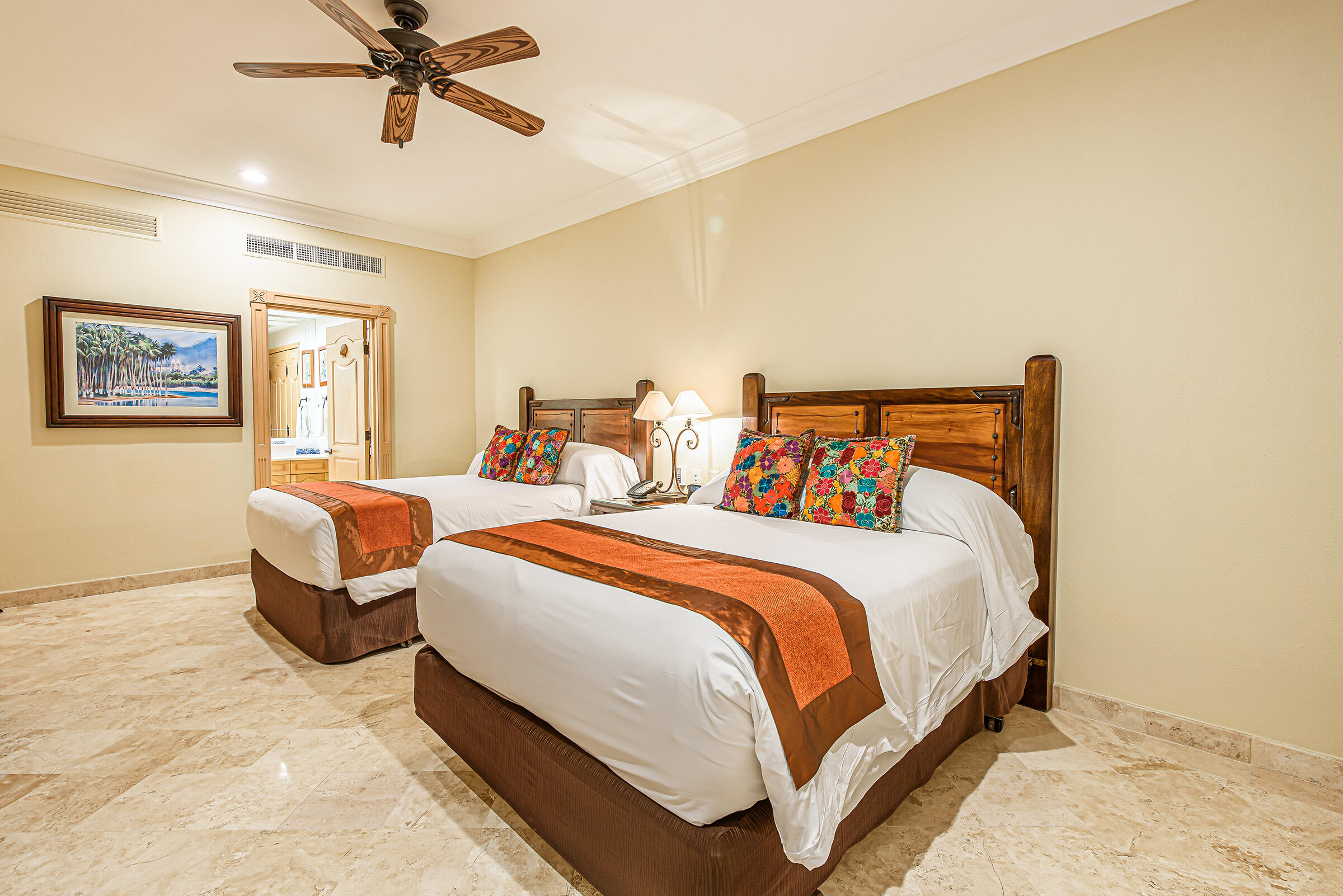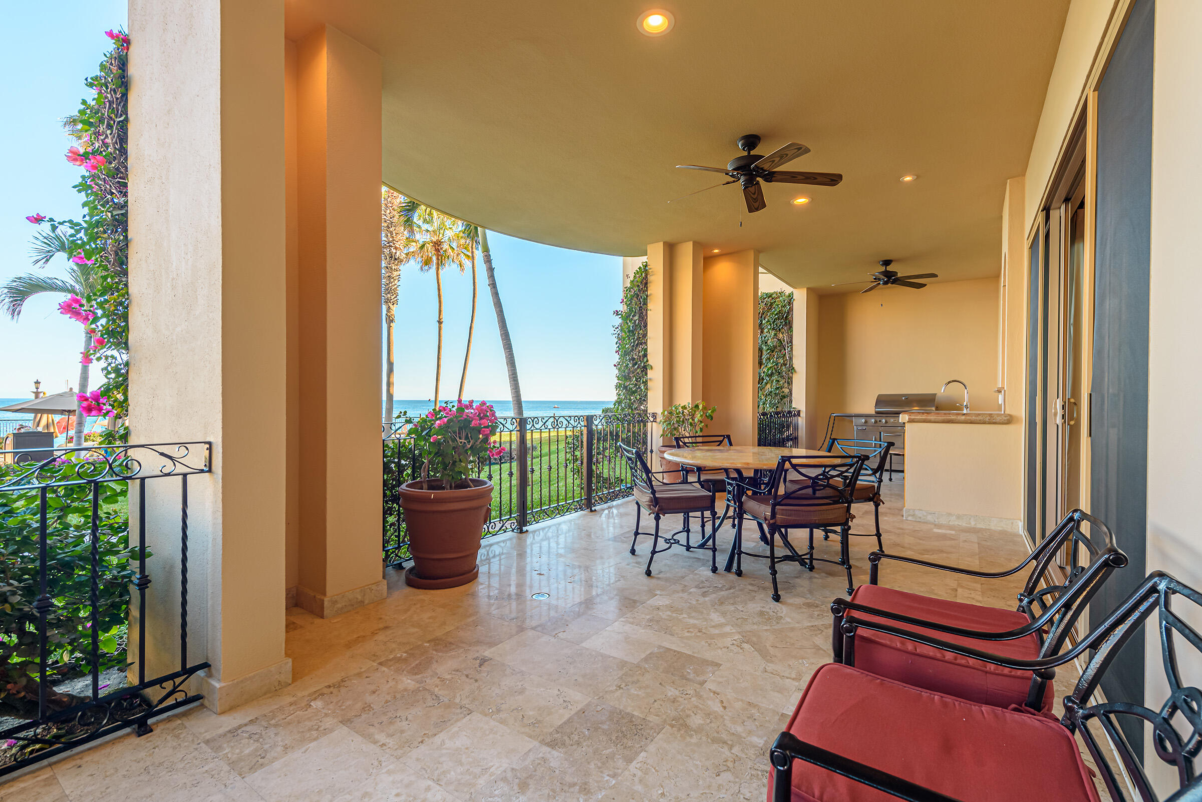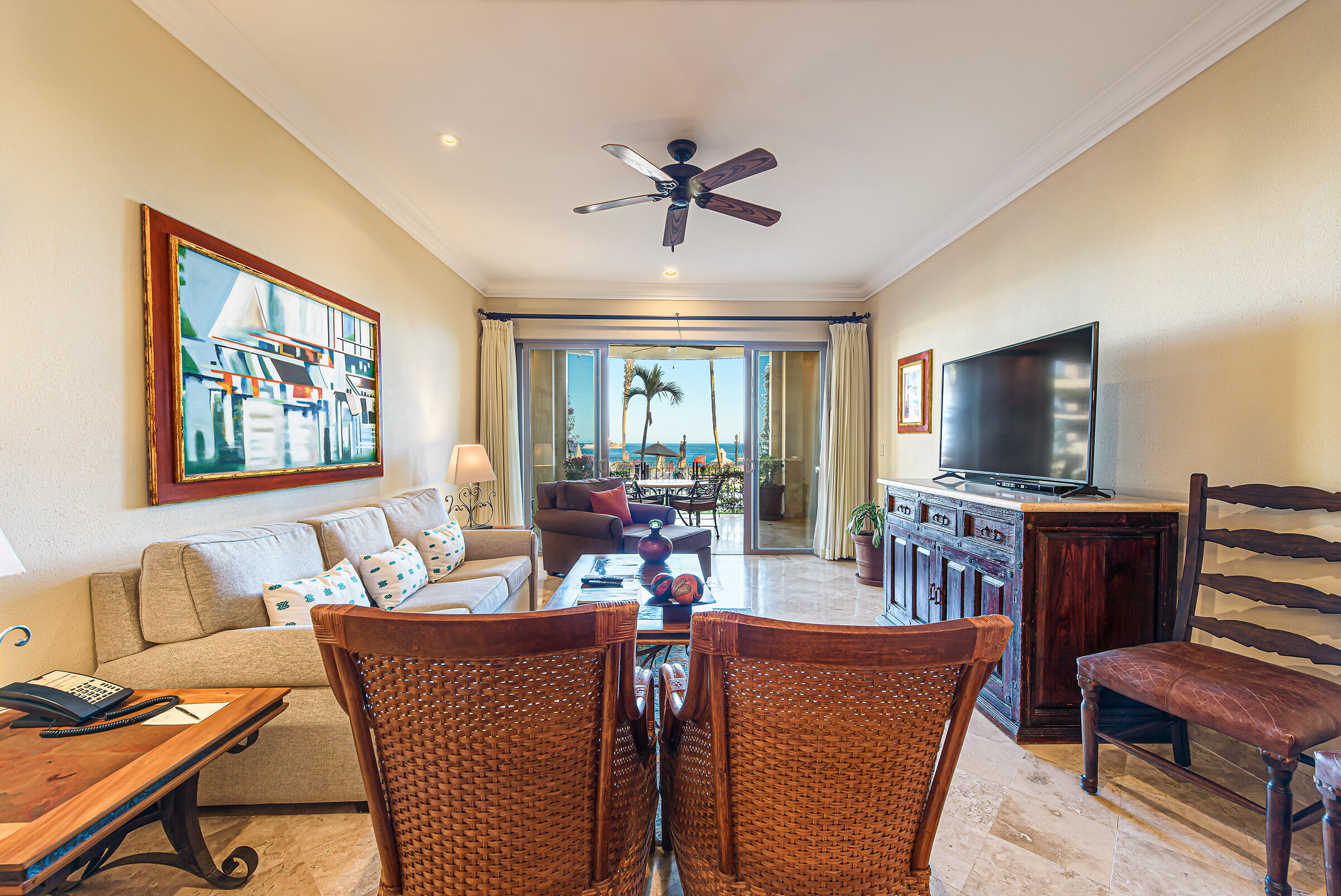 This ground floor 3BR/4BA ocean front villa has the most incredible views from the over 600 sq. ft. of terrace, with dramatic views of the Sea of Cortez. It is also just steps to the ocean, the pool, and the outdoor Jacuzzi. Including, state of the art electronics including four large TVs with satellite connection, Sony stereo system with CD and cassette player and DVD players in all bedrooms and the living room. Travertine marble flooring over 2,130.48 sq. ft. of living space with central air conditioning and ceiling fans in each room. With privilege access to tennis courts, water-slide, kids club, gym with sauna, jacuzzi, locker room, and European style spa facility, services and treatments at adjoining sister resort.