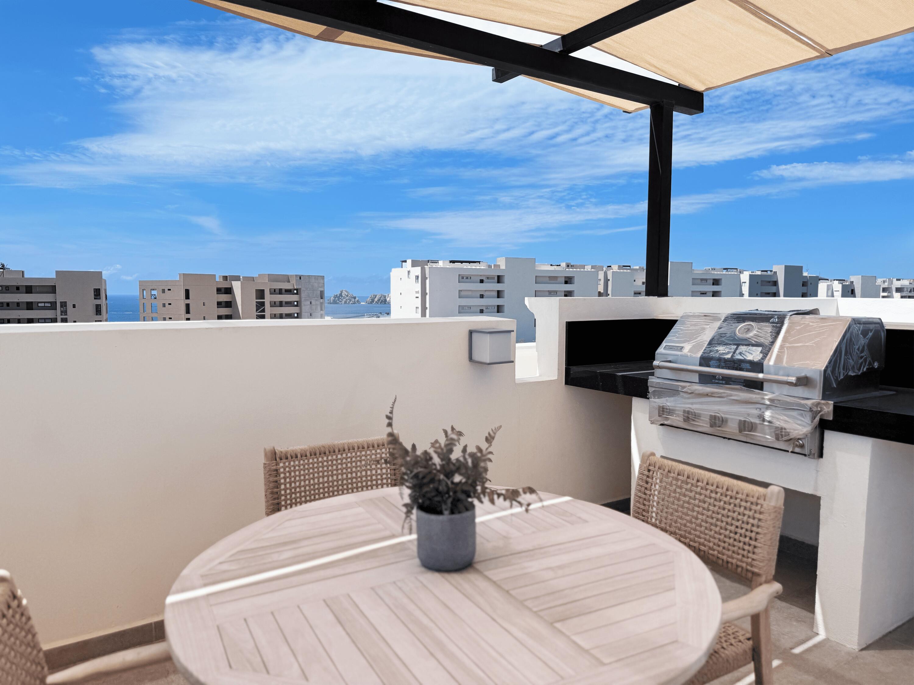 Exclusive community in El Tezal, just minutes from the beach, the Cabo Marina, and Cosco. Phase II offers only 39 homes and a clubhouse with pool, jacuzzi, gym, and social areas. The Santa Barbara model features 2 levels plus a rooftop deck: open living/dining, quartz kitchen with appliances, half bath, and spacious patio. Upstairs: 3 bedrooms, 2 baths, laundry. The primary suite includes a front terrace overlooking the community. Rooftop deck is ideal for sunsets and gatherings. Covered parking for 2, high-end finishes, closets, marble vanities, and AC mini splits included. Select homes ready for immediate delivery.