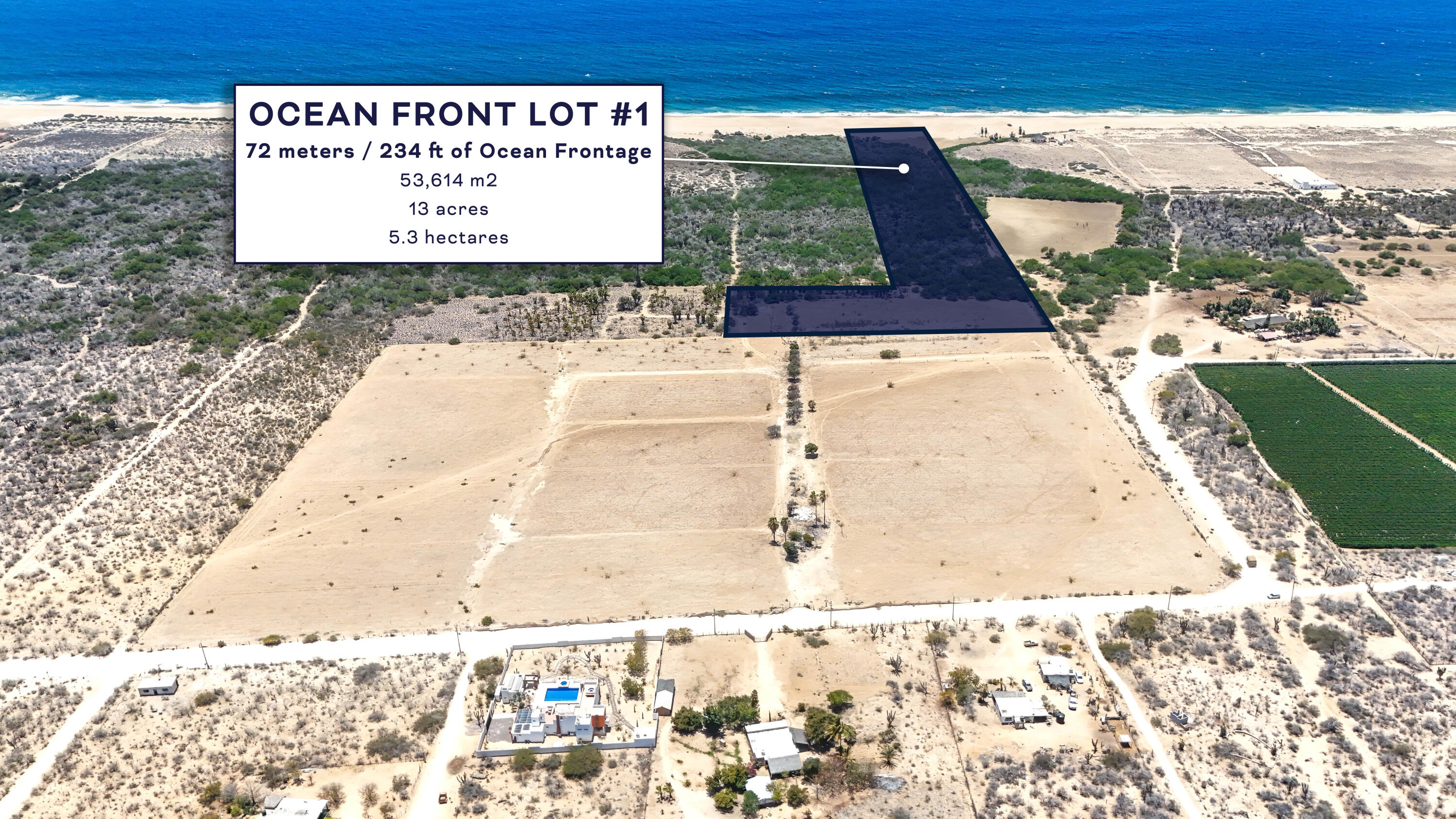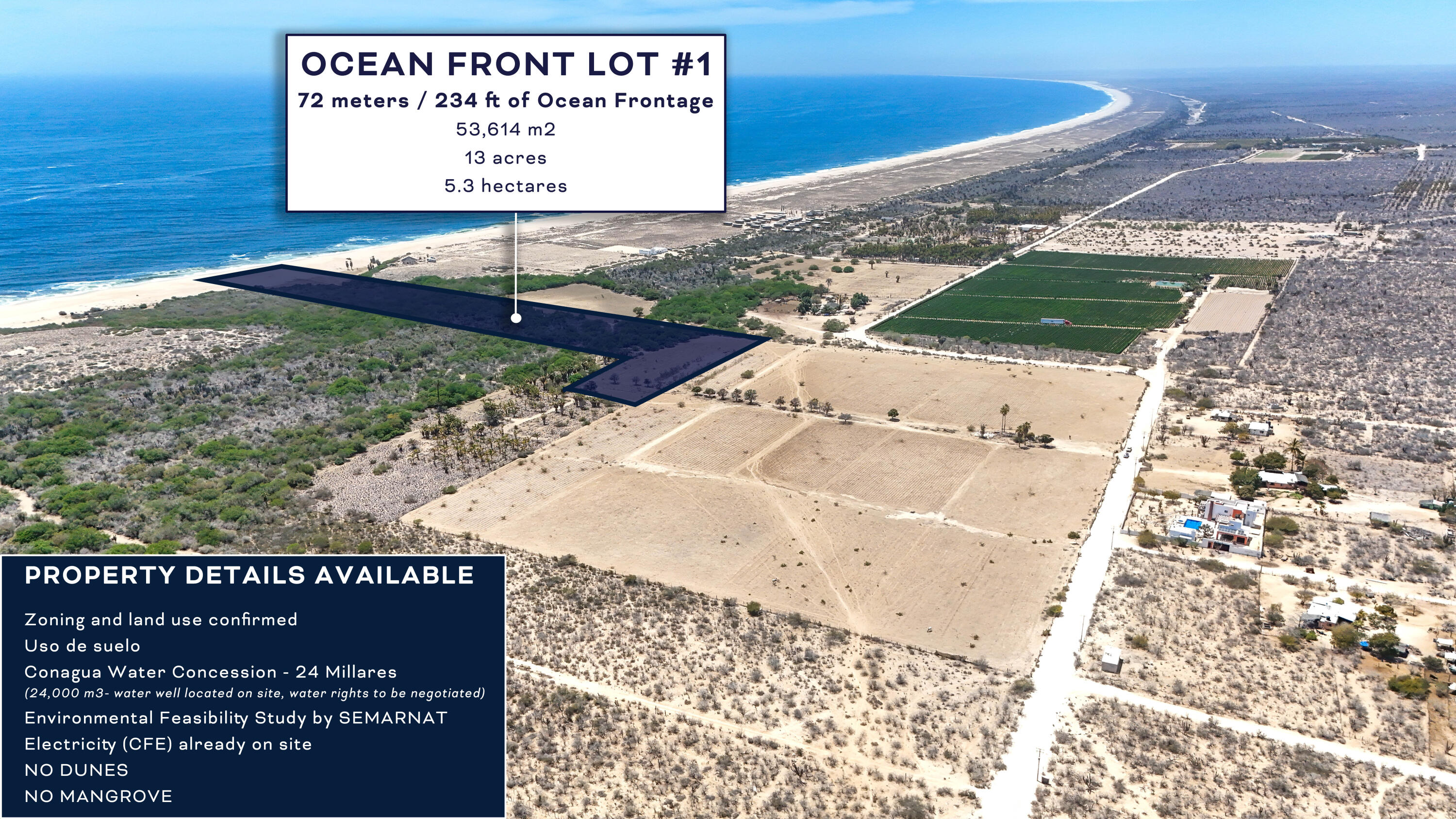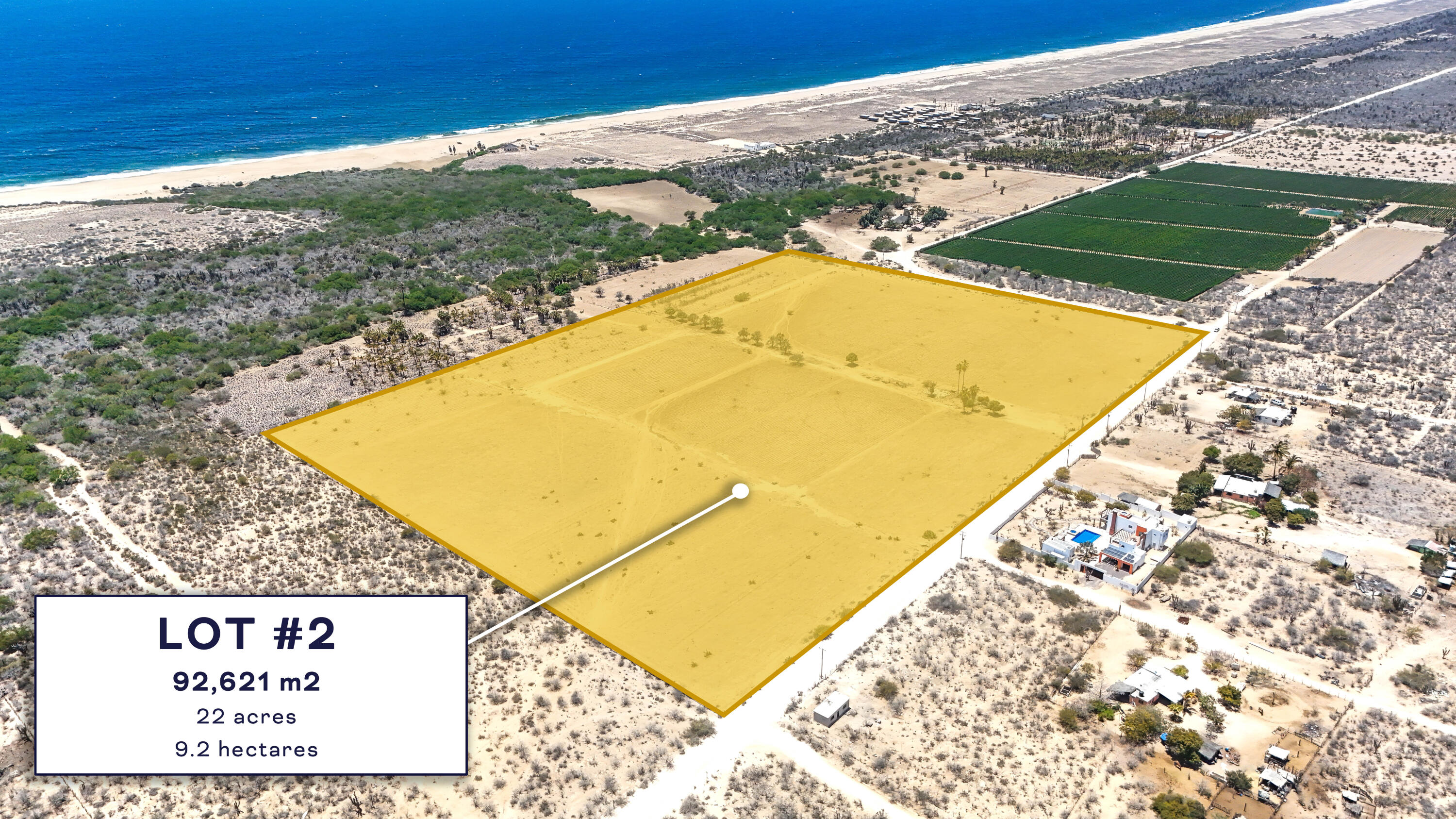 OWNER FINANCING!! Development Lot - 9.2 Hectares with Infrastructure in Todos Santos. With a total area of 92,621 m² (22 acres / 9.2 hectares), this property offers an exceptional opportunity for developers and investors looking to establish themselves in one of the fastest-growing regions of Baja California Sur. This is a rare offering--one of the few oceanfront parcels available with NO DUNES and NO MANGROVES, allowing for maximum buildable potential. The land features a gentle slope that provides excellent view opportunities, making it ideal for development or agricultural use such as farm-to-table or boutique farming concepts.