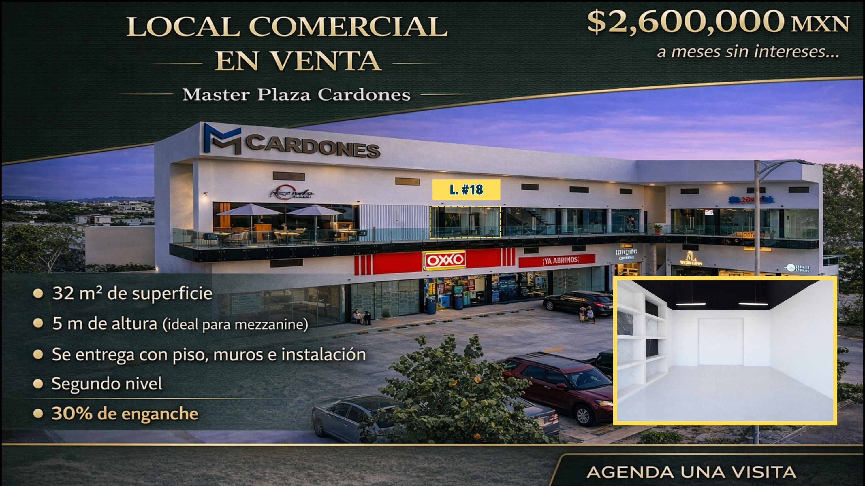 Commercial unit for sale located in Master Plaza Cardones - Unit #18 (Second Floor, Phase 1), positioned on Avenida Jacarandas, one of the fastest-growing residential and commercial corridors in Cabo San Lucas. The plaza is located approximately 500 meters from Mavila, Quivira and Pueblo Bonito, areas with strong residential development and consistent local and tourist traffic. • 30% down payment • Balance payable in interest-free installments