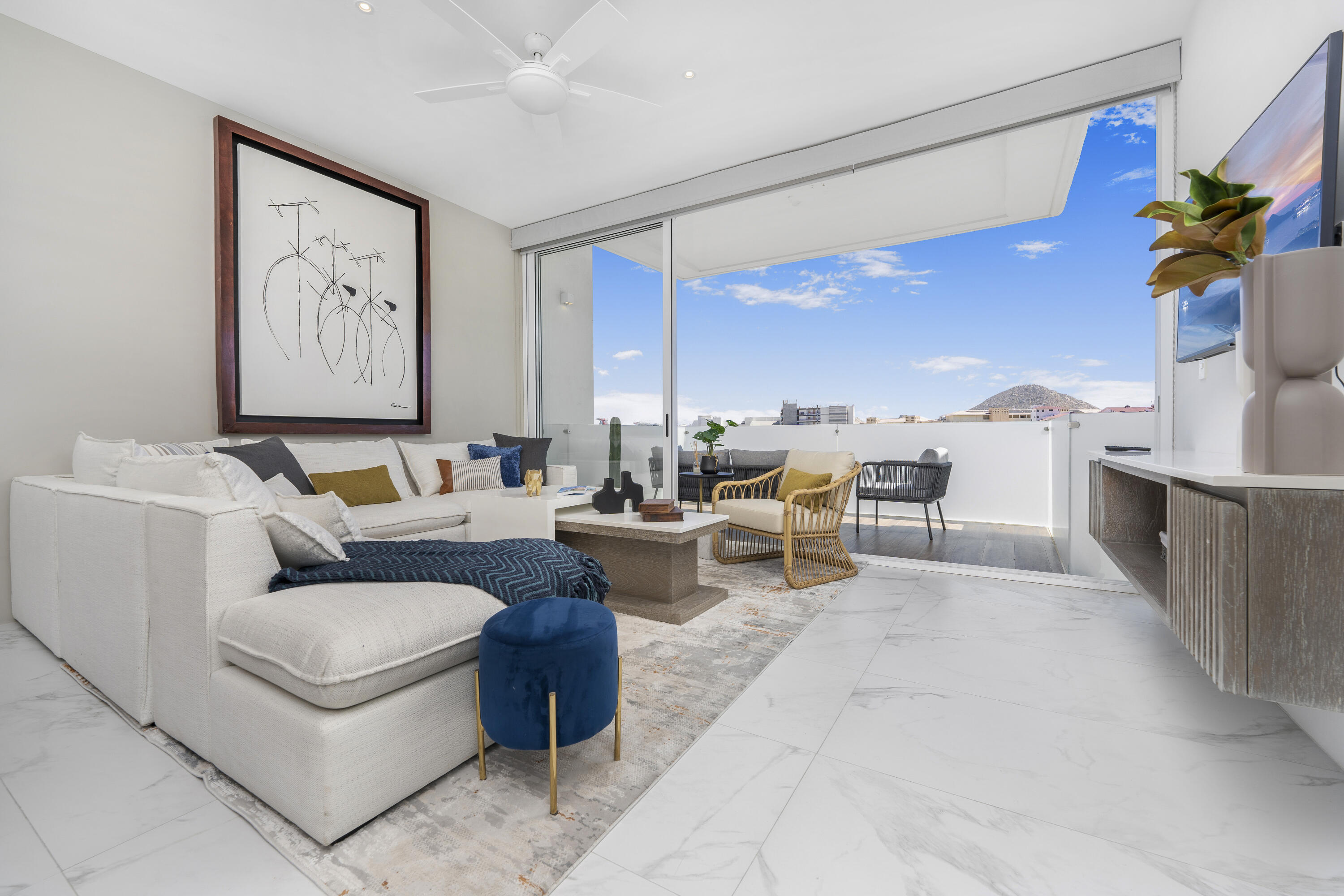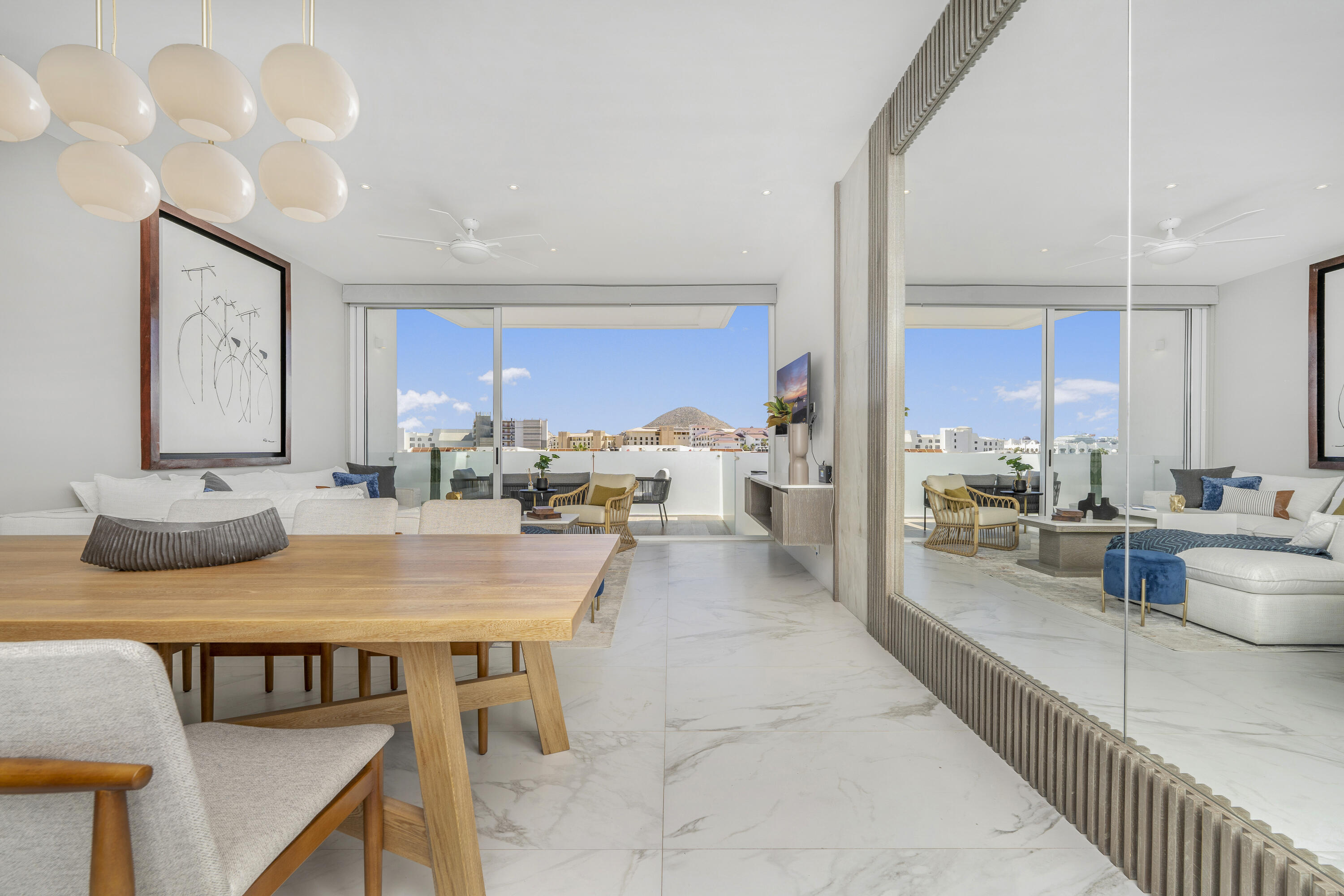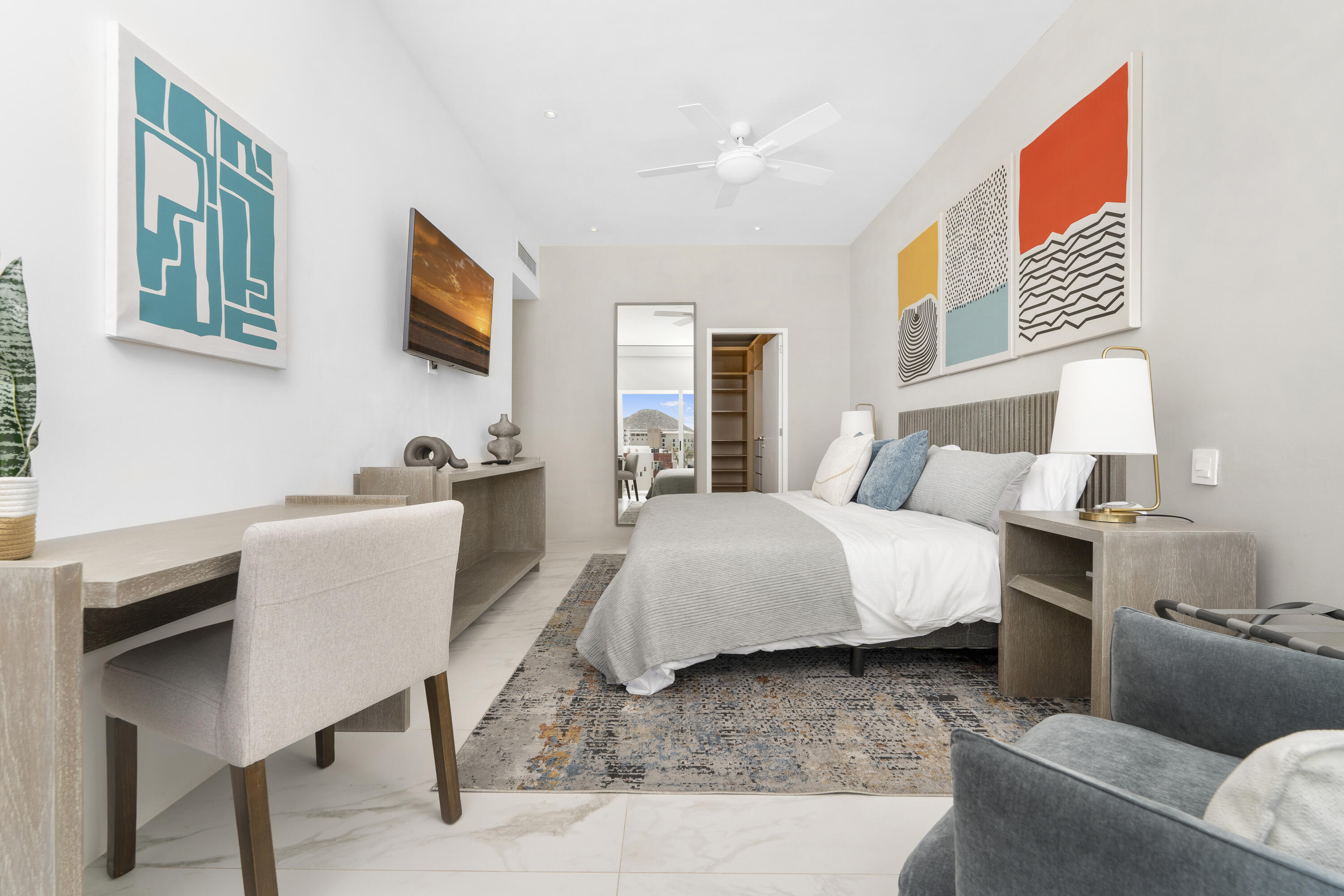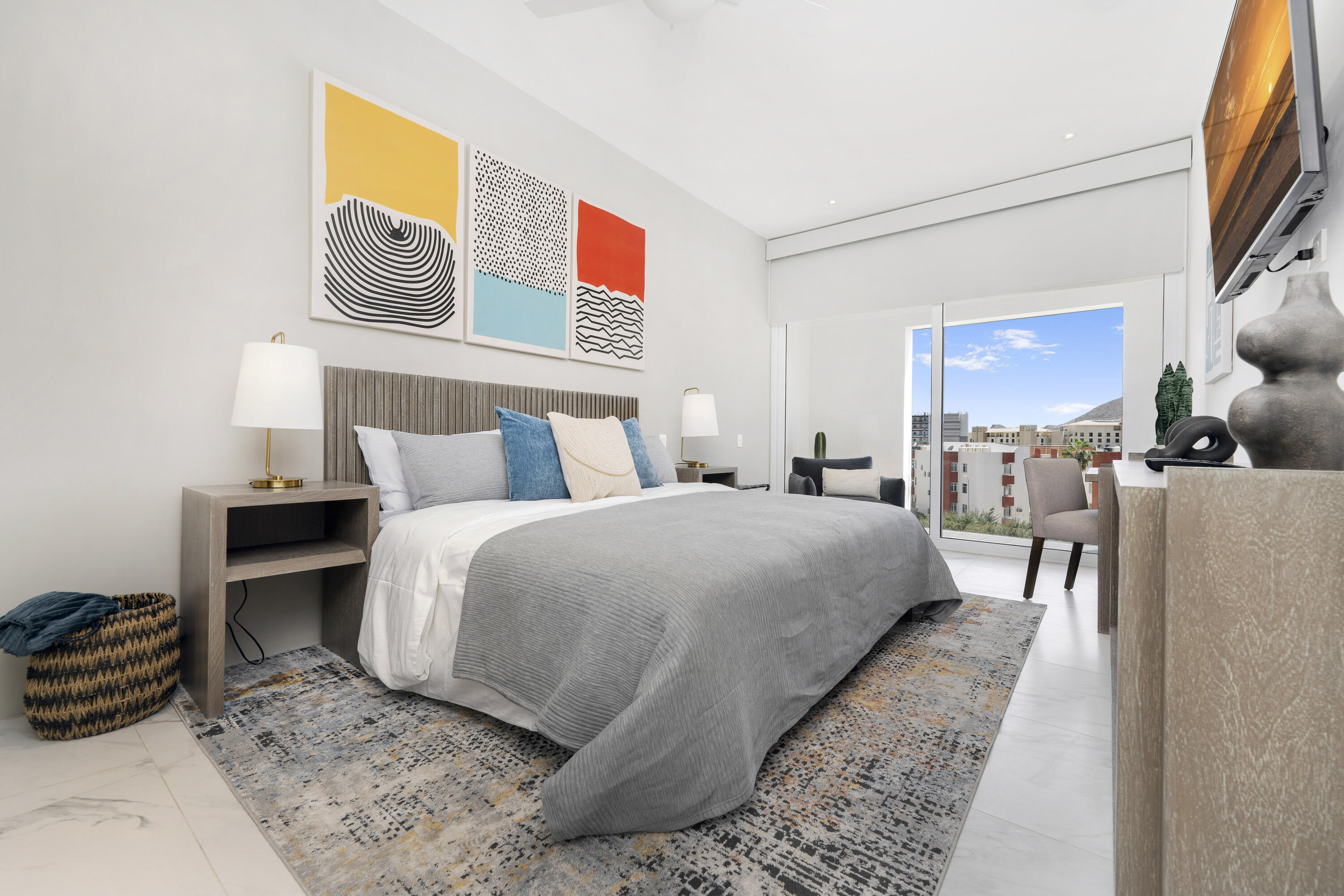This contemporary condo in Marea, Cabo San Lucas, offers 1480 sq. ft. of sophisticated living space. The open-concept design seamlessly integrates the living, dining, and kitchen areas, adorned with sleek white cabinetry and modern appliances. Floor-to-ceiling windows flood the space with natural light and showcase stunning city views. The bedrooms feature plush furnishings and ample storage, while the bathrooms boast elegant fixtures and glass-enclosed showers. A private balcony provides an ideal outdoor relaxation spot. Additional amenities include a walk-in closet and stylish accent walls, creating a perfect blend of comfort and luxury in this coastal paradise.