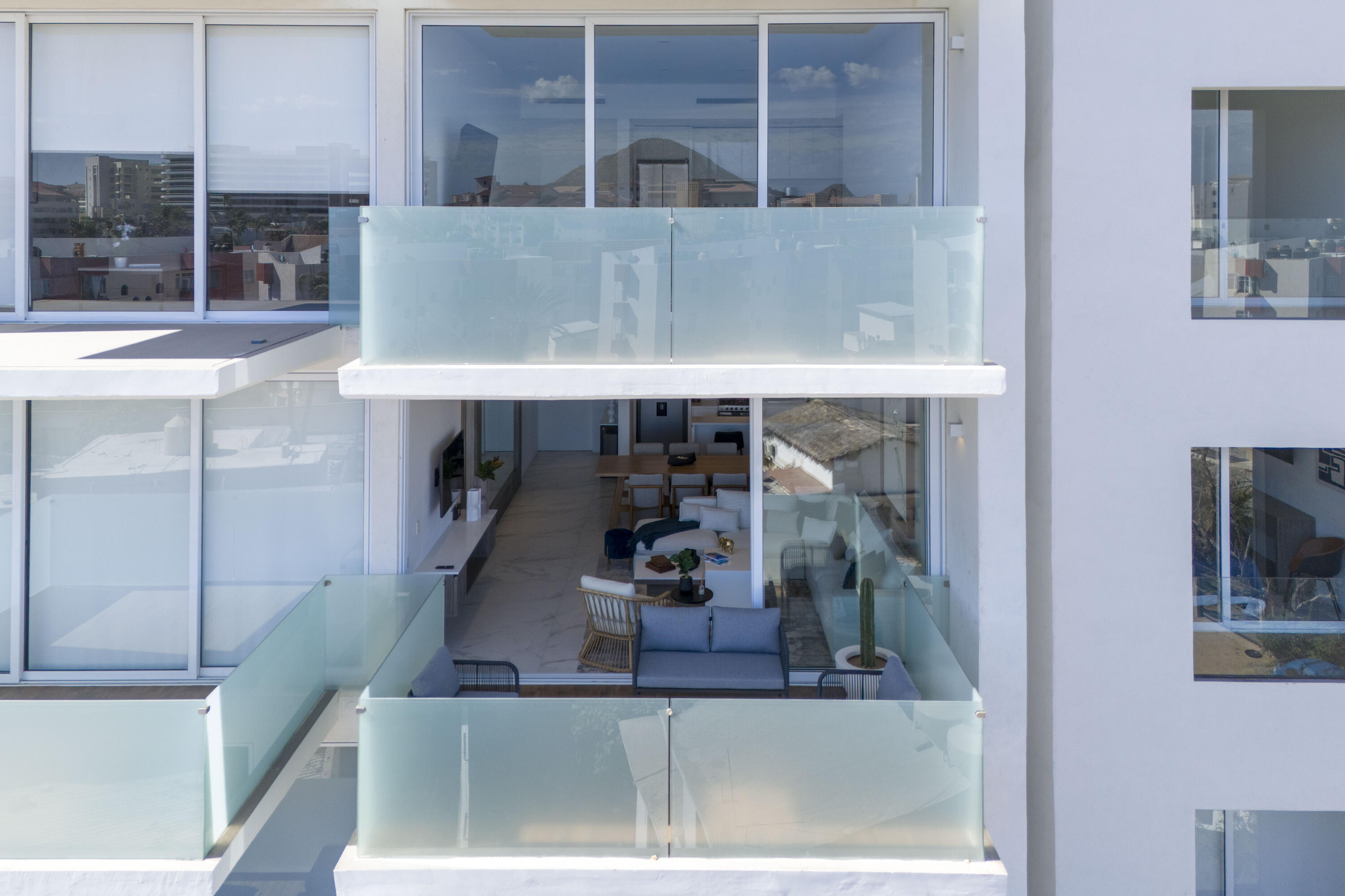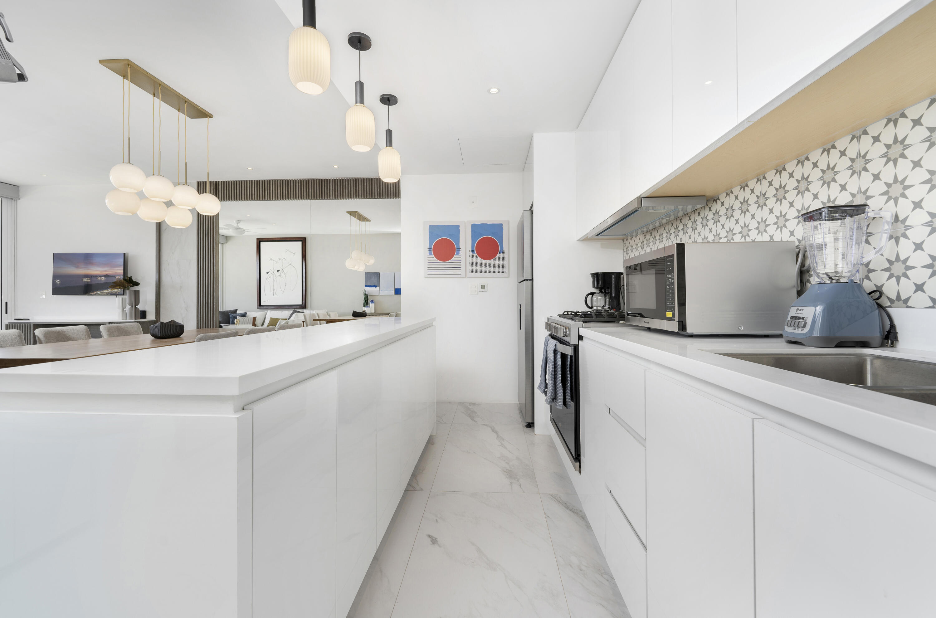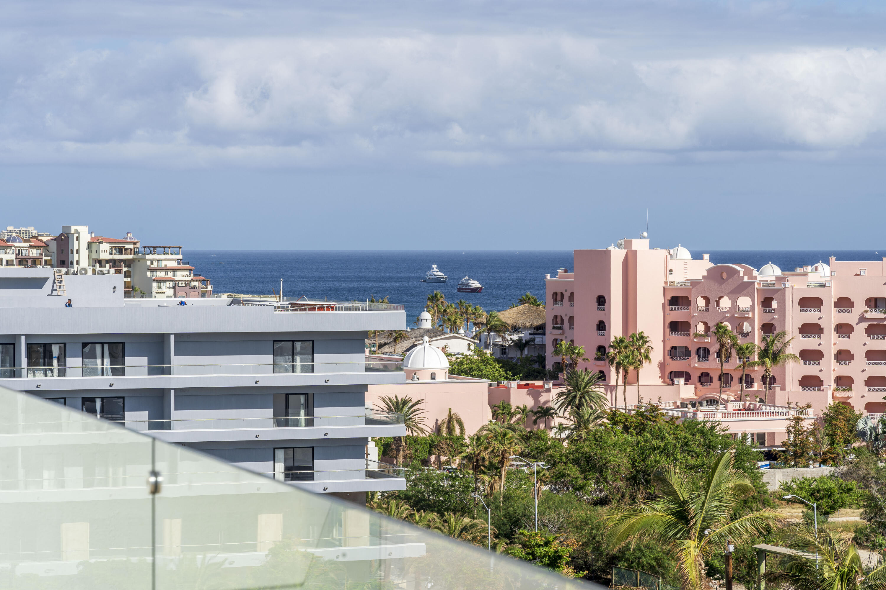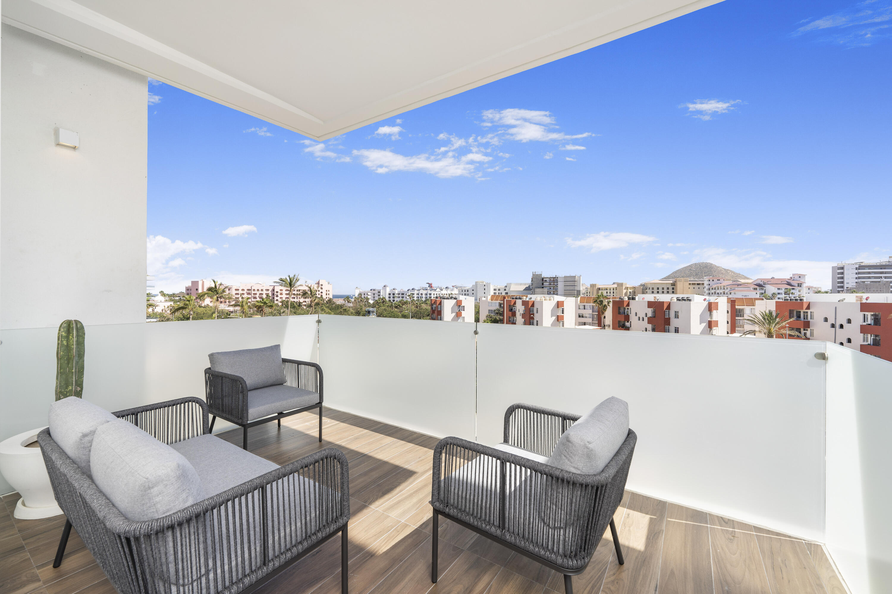 This contemporary condo in Marea, Cabo San Lucas, offers 1480 sq. ft. of sophisticated living space. The open-concept design seamlessly integrates the living, dining, and kitchen areas, adorned with sleek white cabinetry and modern appliances. Floor-to-ceiling windows flood the space with natural light and showcase stunning city views. The bedrooms feature plush furnishings and ample storage, while the bathrooms boast elegant fixtures and glass-enclosed showers. A private balcony provides an ideal outdoor relaxation spot. Additional amenities include a walk-in closet and stylish accent walls, creating a perfect blend of comfort and luxury in this coastal paradise.
