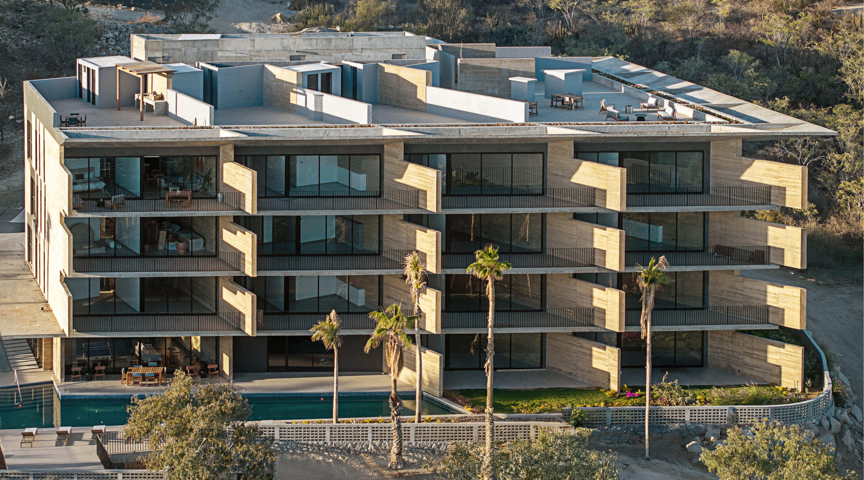 2 bedroom unit with private rooftop. OR is an award-winning, architect-designed residential project in the Cabo Corridor by Jacobo Micha (Archetonic), recipient of the BLT Built Design Award (2025). With only 25 residences, it offers a rare boutique living experience defined by privacy, quiet luxury, and architectural distinction. The fan-inspired design maximizes orientation, natural light, and views of the desert and sea, using pigmented concrete and natural materials that echo the Baja landscape. Interiors feature generous ceiling heights, elongated living areas, seamless indoor-outdoor flow, and fully equipped modern kitchens. Amenities include a semi-Olympic pool, gym and yoga area with views, games room, fire pits, storages, gated security, and a common rooftop with iconic Arch view