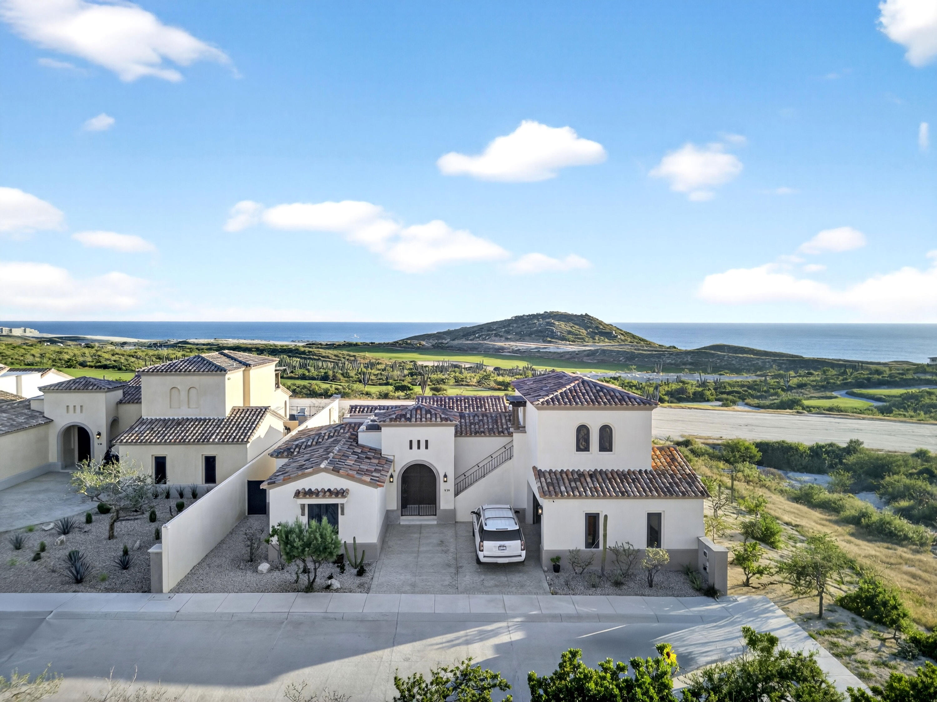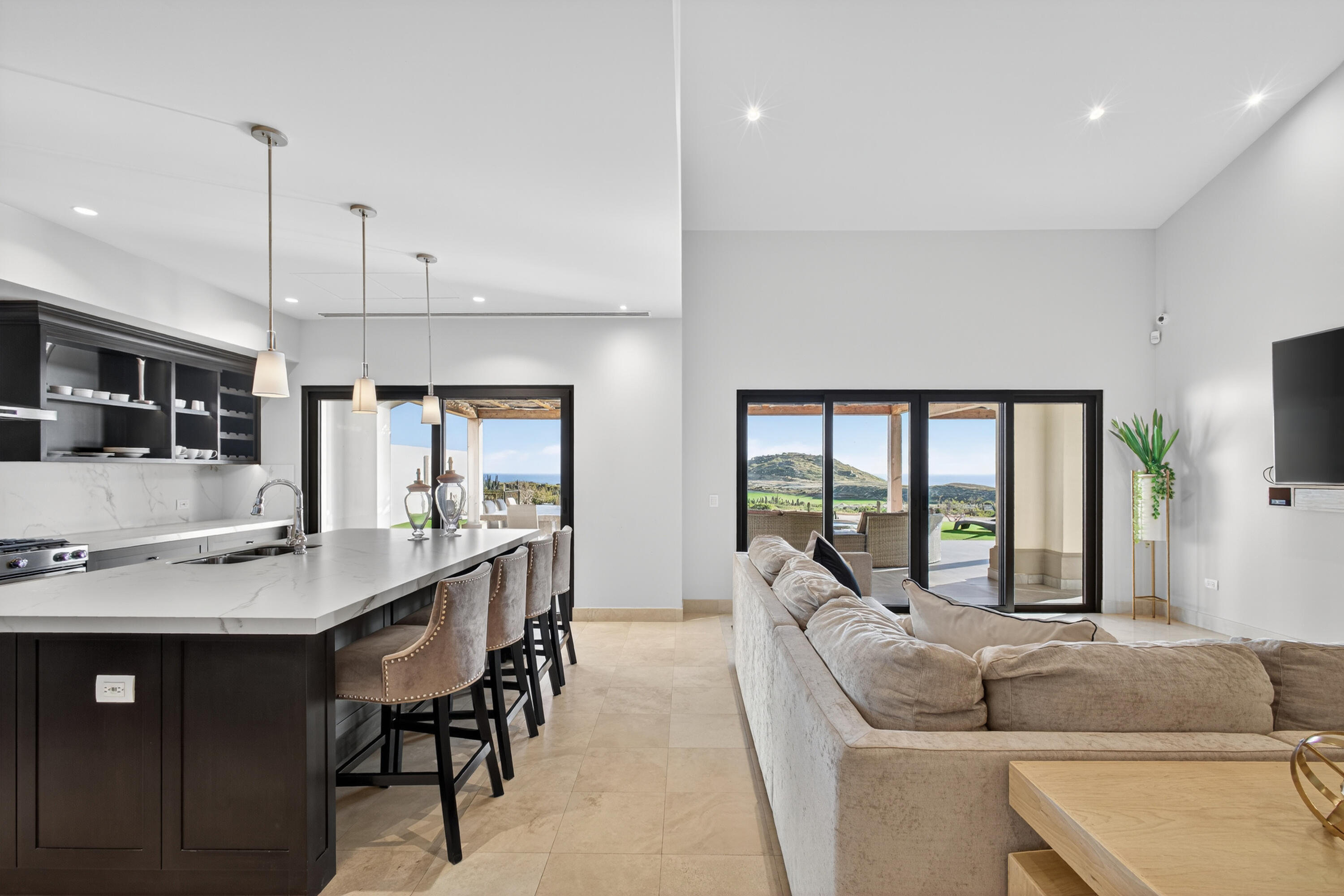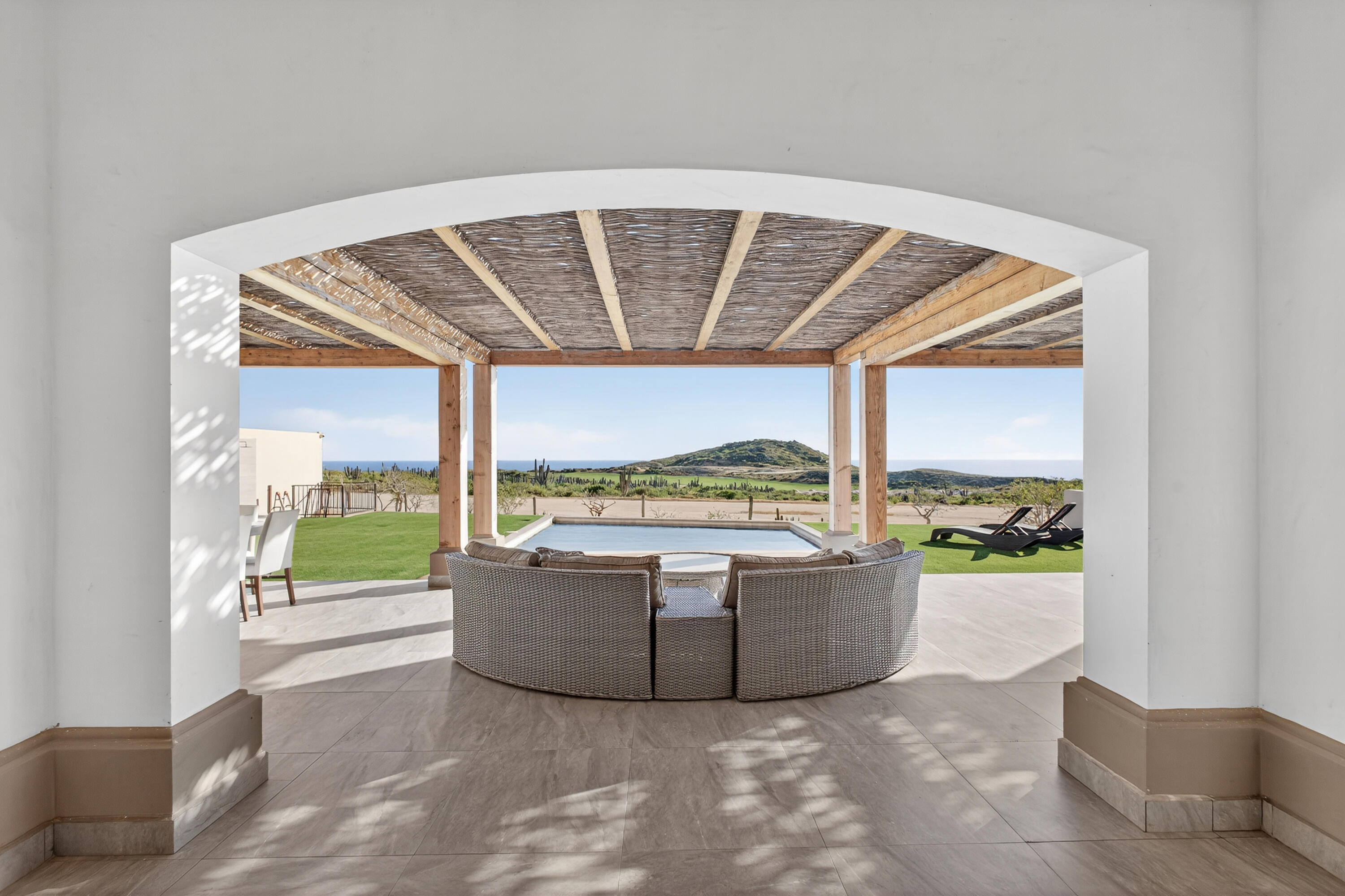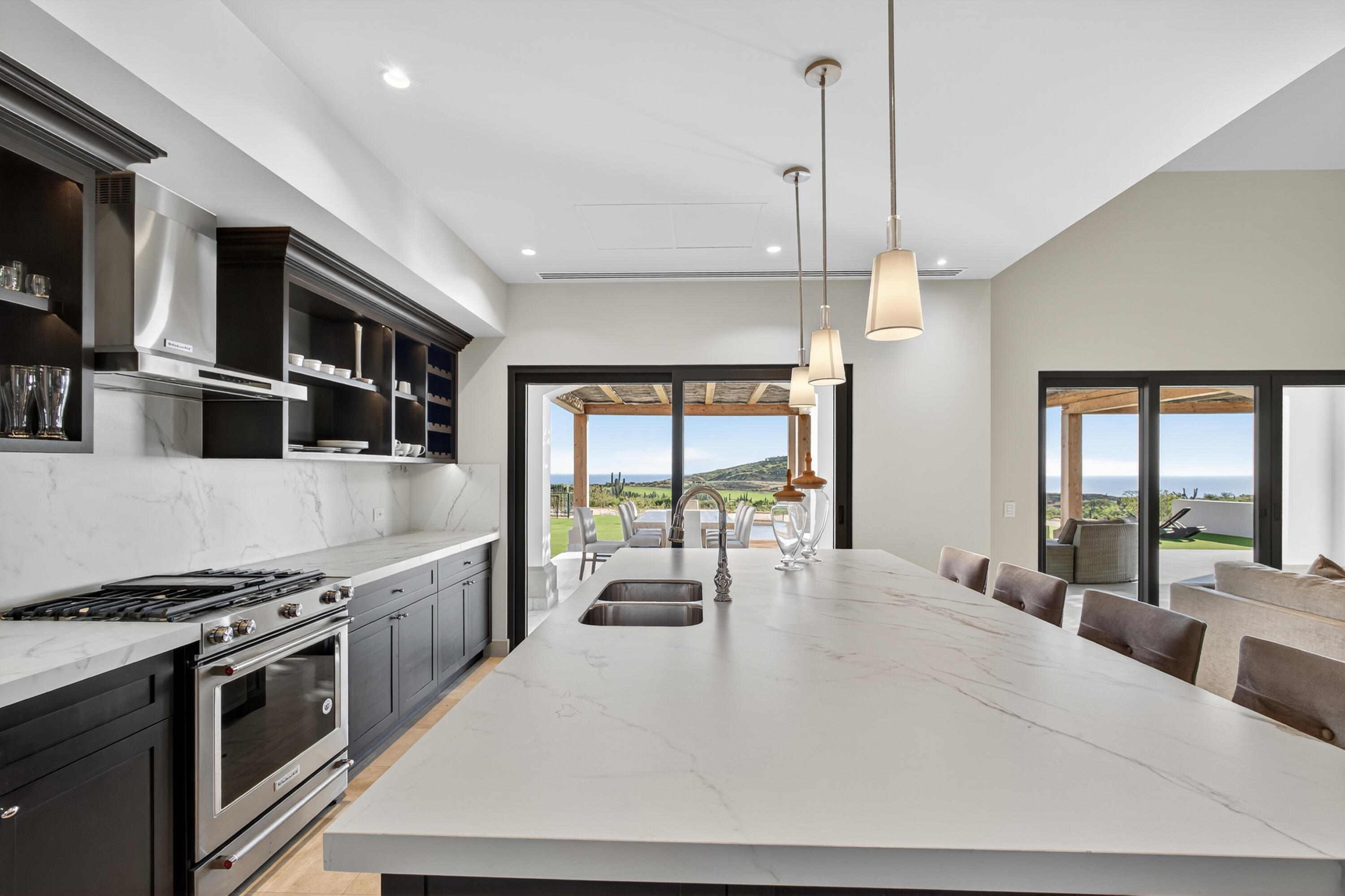 Villa #38 offers the largest lot in the community, measuring 8,046 square feet, with only one neighbor on one side. This allows you to enjoy spacious gardens and the tranquility of your surroundings. Experience luxury coastal living at its finest in this fully furnished, single-level residence located in the exclusive community of Rancho San Lucas. With panoramic views of the Pacific Ocean and Greg Norman's world-class golf course, Villa #38 combines timeless elegance with modern convenience. It features upgraded high ceilings, custom beams, designer lighting, granite countertops, and exquisite tile work throughout the fully equipped kitchen, which is enhanced with a stylish backsplash and exceptional custom cabinetry, along with ample island storage.