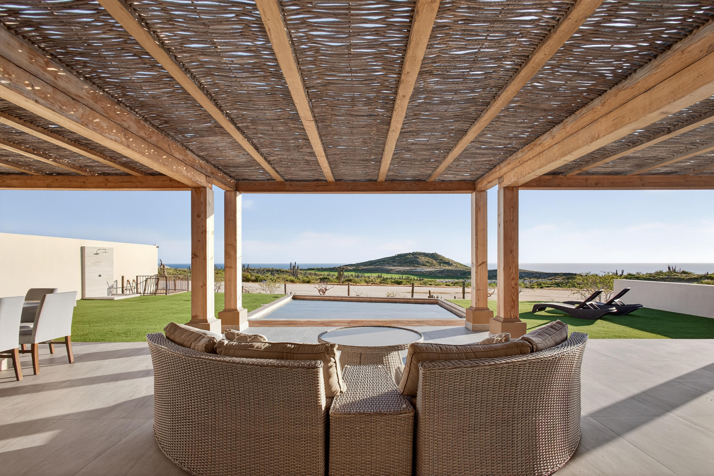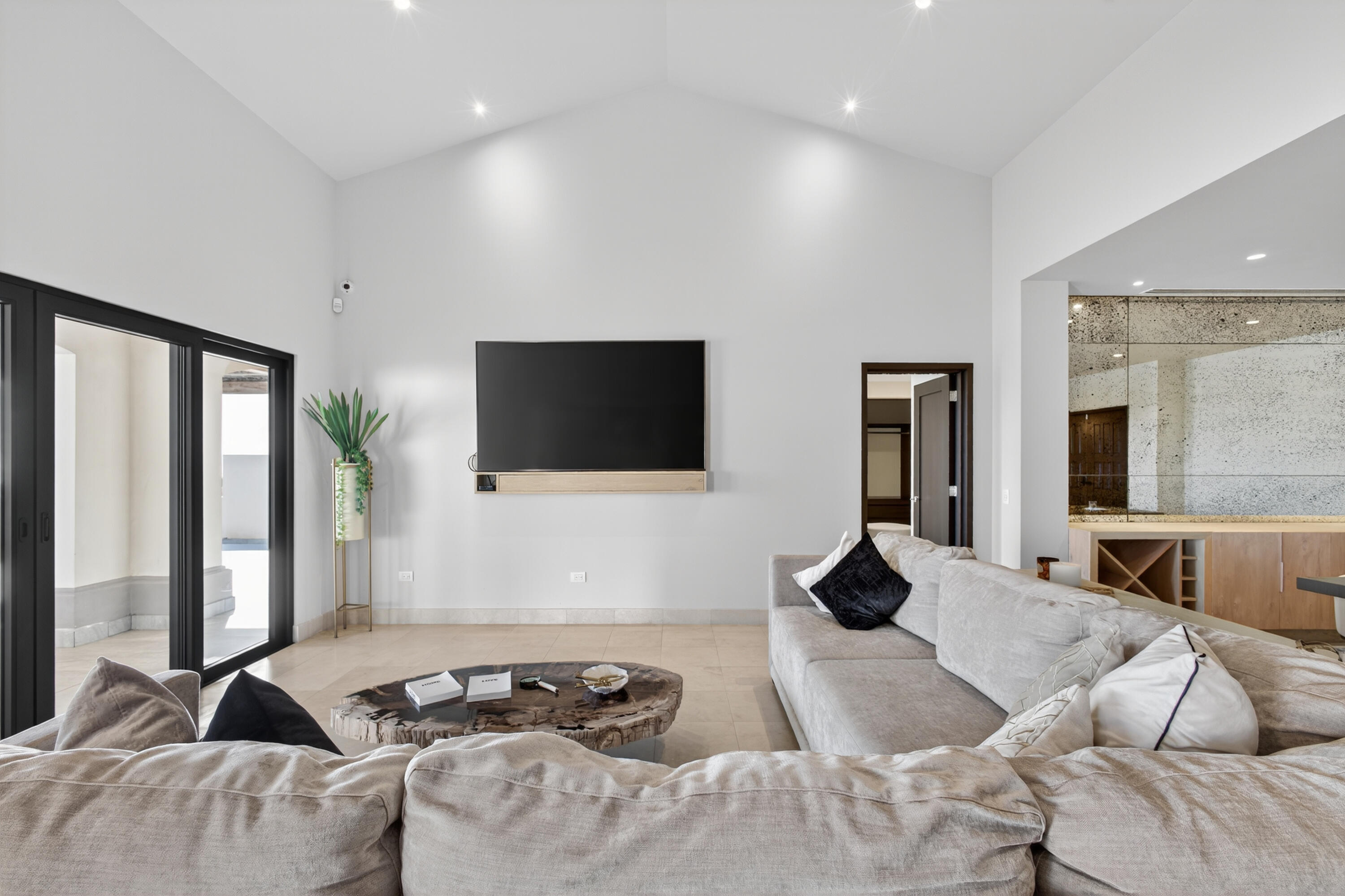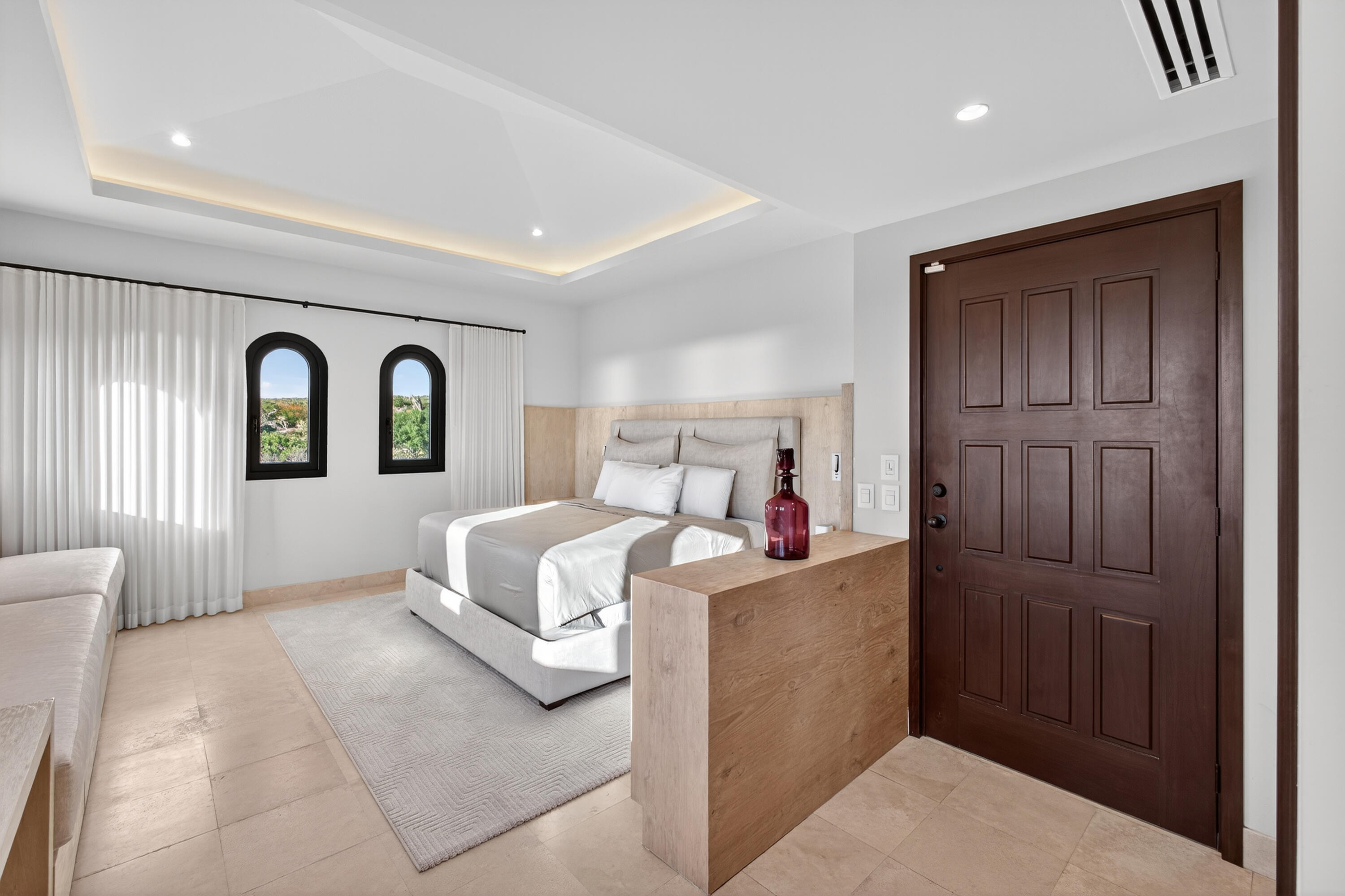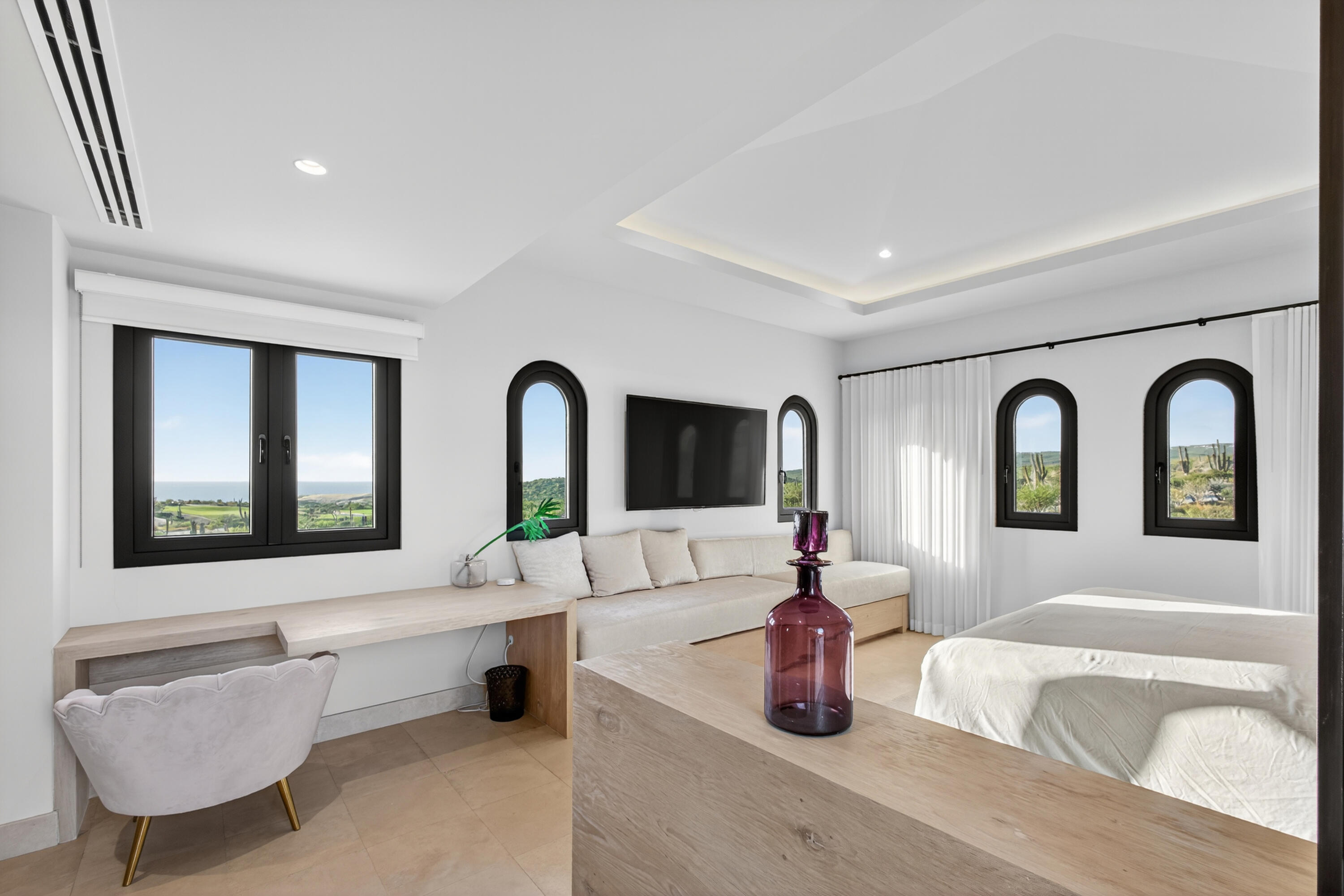 Villa #38 offers the largest lot in the community, measuring 8,046 square feet, with only one neighbor on one side. This allows you to enjoy spacious gardens and the tranquility of your surroundings. Experience luxury coastal living at its finest in this fully furnished, single-level residence located in the exclusive community of Rancho San Lucas. With panoramic views of the Pacific Ocean and Greg Norman's world-class golf course, Villa #38 combines timeless elegance with modern convenience. It features upgraded high ceilings, custom beams, designer lighting, granite countertops, and exquisite tile work throughout the fully equipped kitchen, which is enhanced with a stylish backsplash and exceptional custom cabinetry, along with ample island storage.