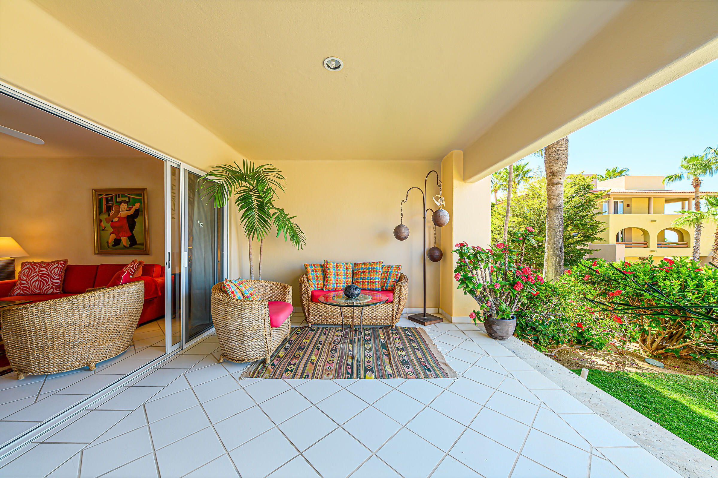 Discover this charming two-bedroom, one-bath ground floor unit offering panoramic ocean and golf views. Paloma 103 is located in Las Gardenias, Cabo Real. The Cabo Real master-planned development is situated in a desirable area along Cabo's ''Golden Corridor,'' which offers beach access, a Robert Trent Jones II golf course, hiking and biking areas. This residence provides a serene, private space with easy access to beautifully landscaped common areas and amenities, including a gym, heated pool, jetted spa, and tennis courts. The development also features an expansive palapa entertaining center with a grill and cook area—perfect for social gatherings.