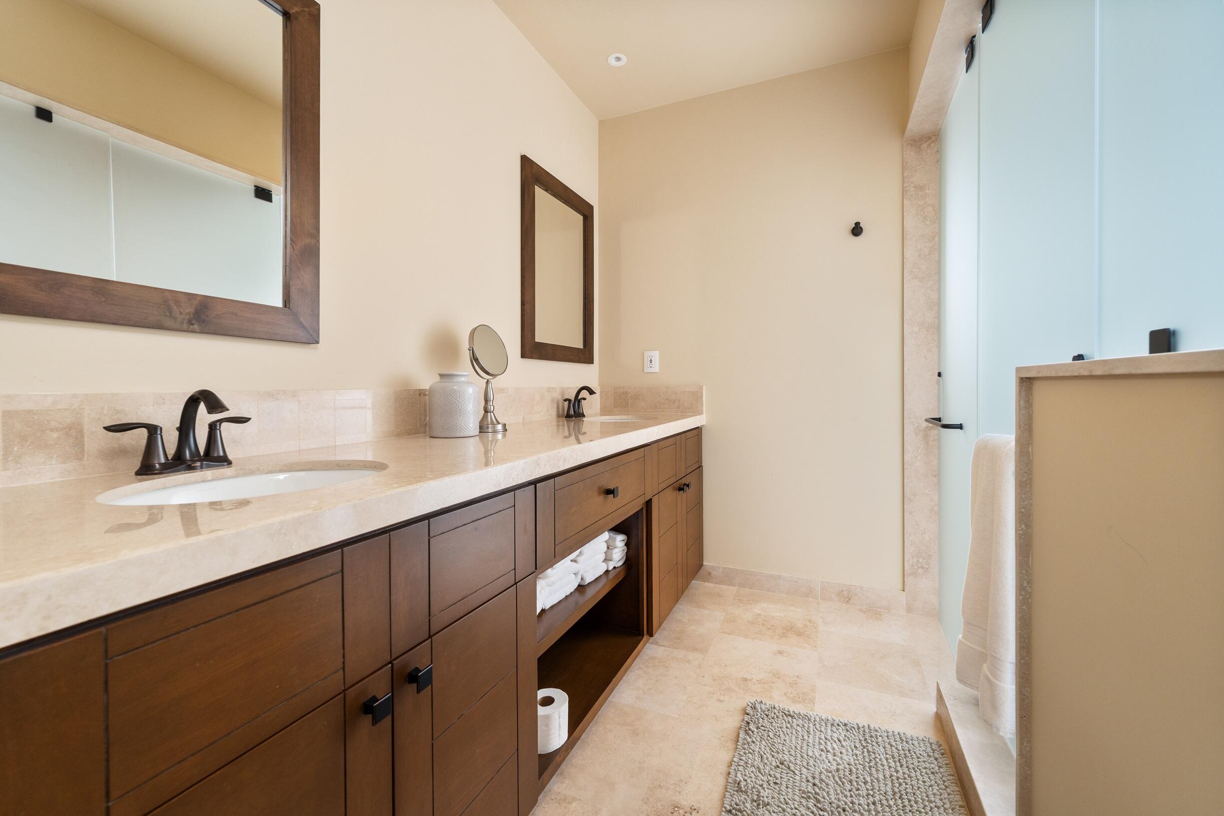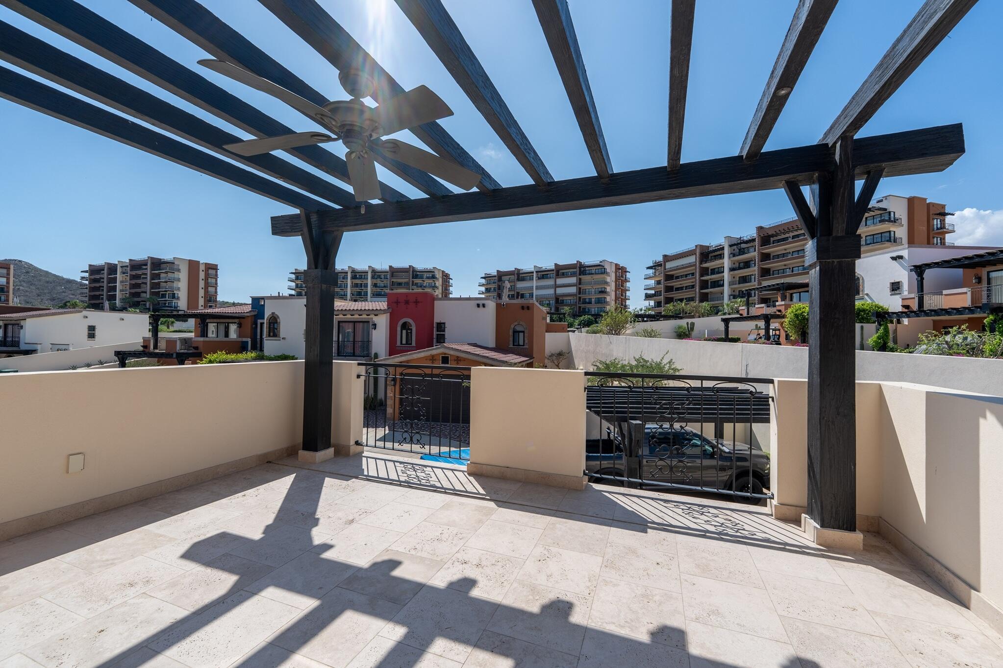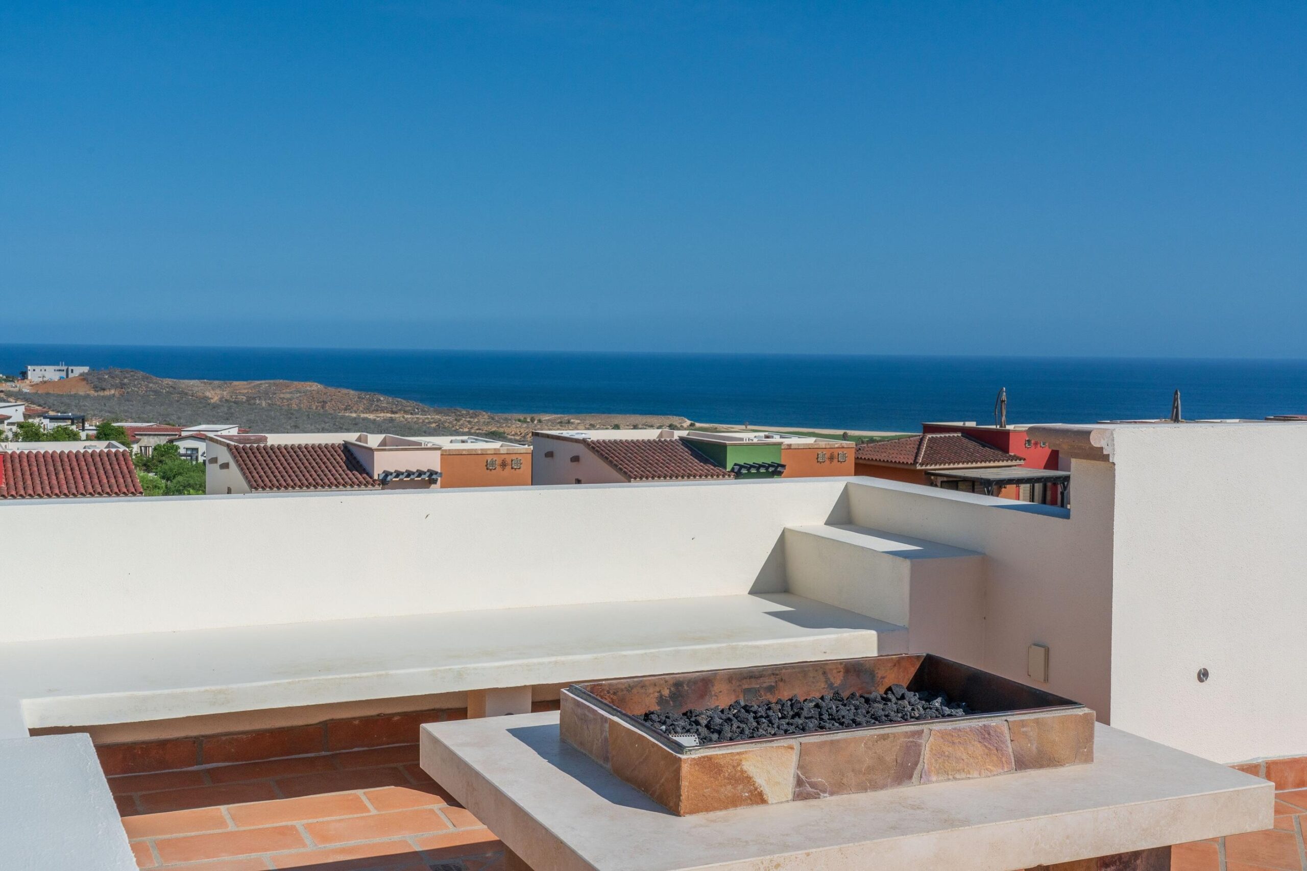 3-Bedroom Home with Rooftop Firepit, Sauna, and Ocean Views in Copala at Quivira. Discover refined living in this stunning 3-bedroom, 2.5-bathroom home offering 488.88 m² of thoughtfully designed space in the prestigious community of Copala at Quivira Los Cabos. Blending modern comfort with timeless details, this residence is in immaculate condition and move-in ready. The primary suite serves as a private retreat with a luxurious ensuite bathroom featuring a double vanity and an oversized walk-in closet, while the two additional bedrooms each offer spacious closets and share a well-appointed full bathroom.