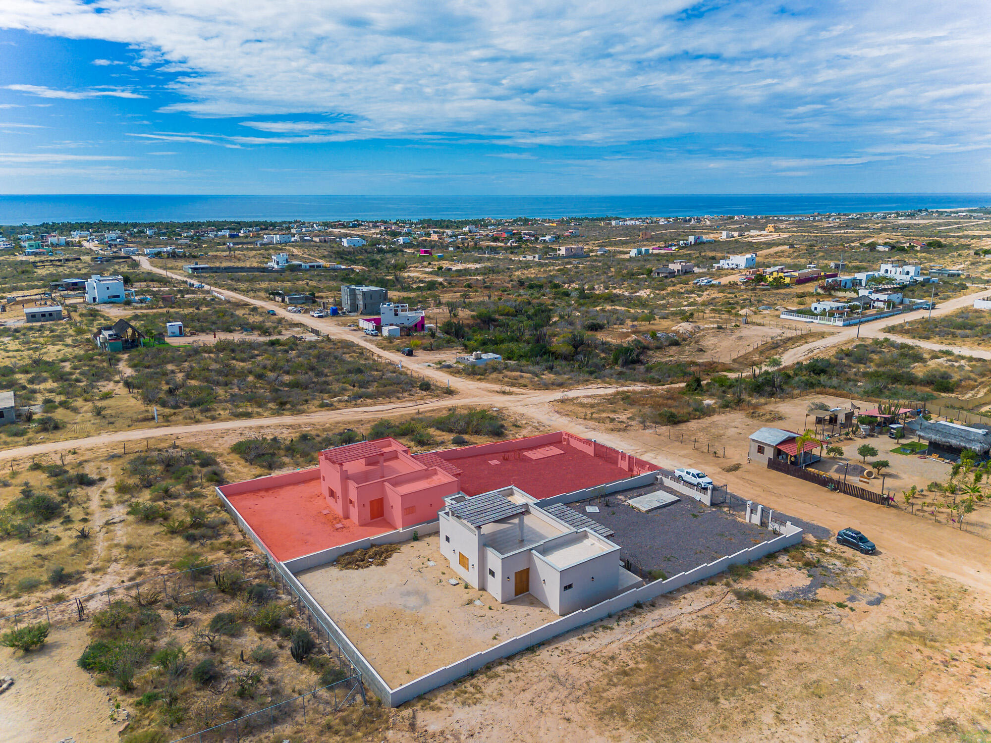 A contemporary two-bedroom, two-and-a-half-bathroom residence located at the end of Calle Telmex in La Ahorcadita, Todos Santos. Designed with a comfortable single-level layout, the home features an open kitchen, generous living spaces, and a seamless indoor-outdoor flow suited for relaxed coastal living. Set on a quarter-acre lot, the property captures panoramic views of the Pacific Ocean, surrounding mountains, and the natural Baja desert landscape. The setting offers privacy and tranquility while remaining just minutes from town and local beaches. Ideal for walking, biking, or enjoying the peaceful rhythm of the area, this property presents a compelling opportunity for a full-time residence or investment in one of Todos Santos' emerging enclaves.