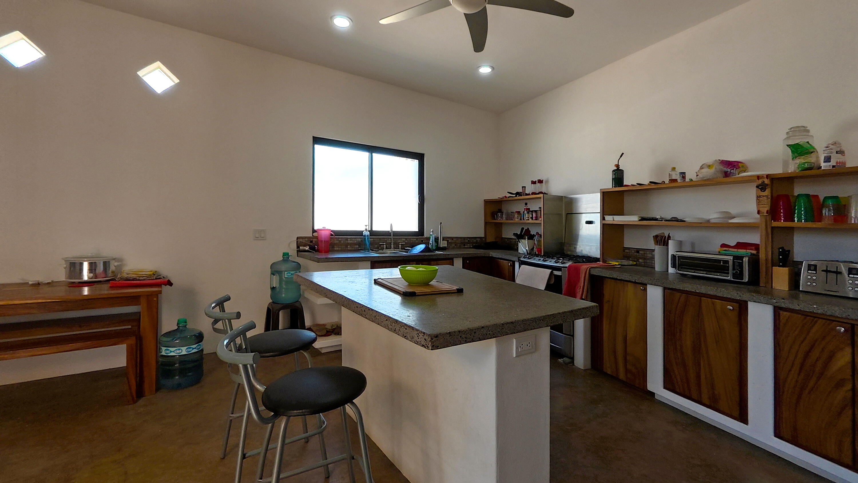 The Singing Kitchen is 1,022 M2 Beach Front next to Accesso 9. This versatile beach front is currently set up for communal use and can easily transition into a private residence, rental compound, or an expanded build project. Included is a garage, 3 individual bodegas, communal kitchen, communal shower room, toilet room and laundry room. Is on city water and has CFE Account.