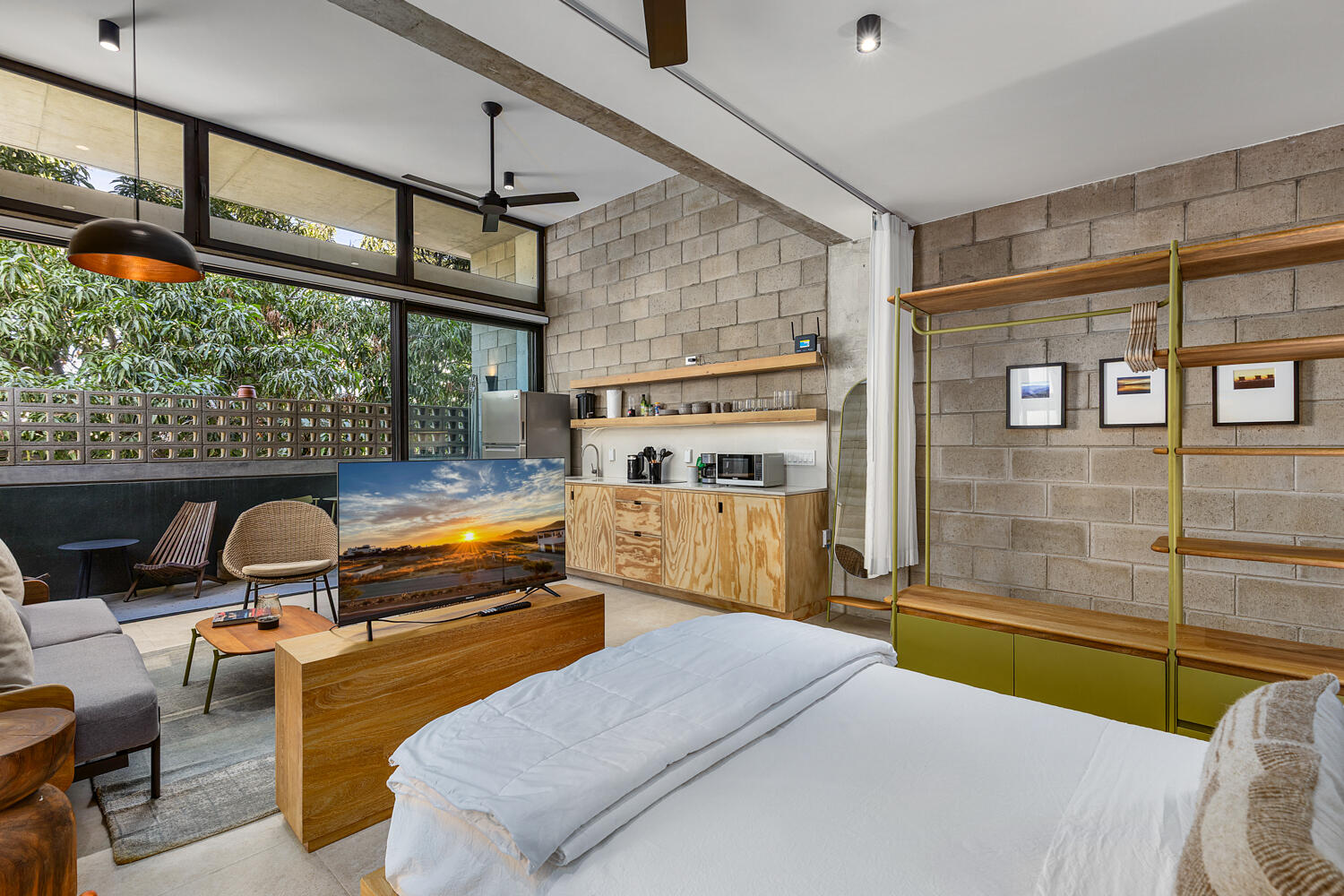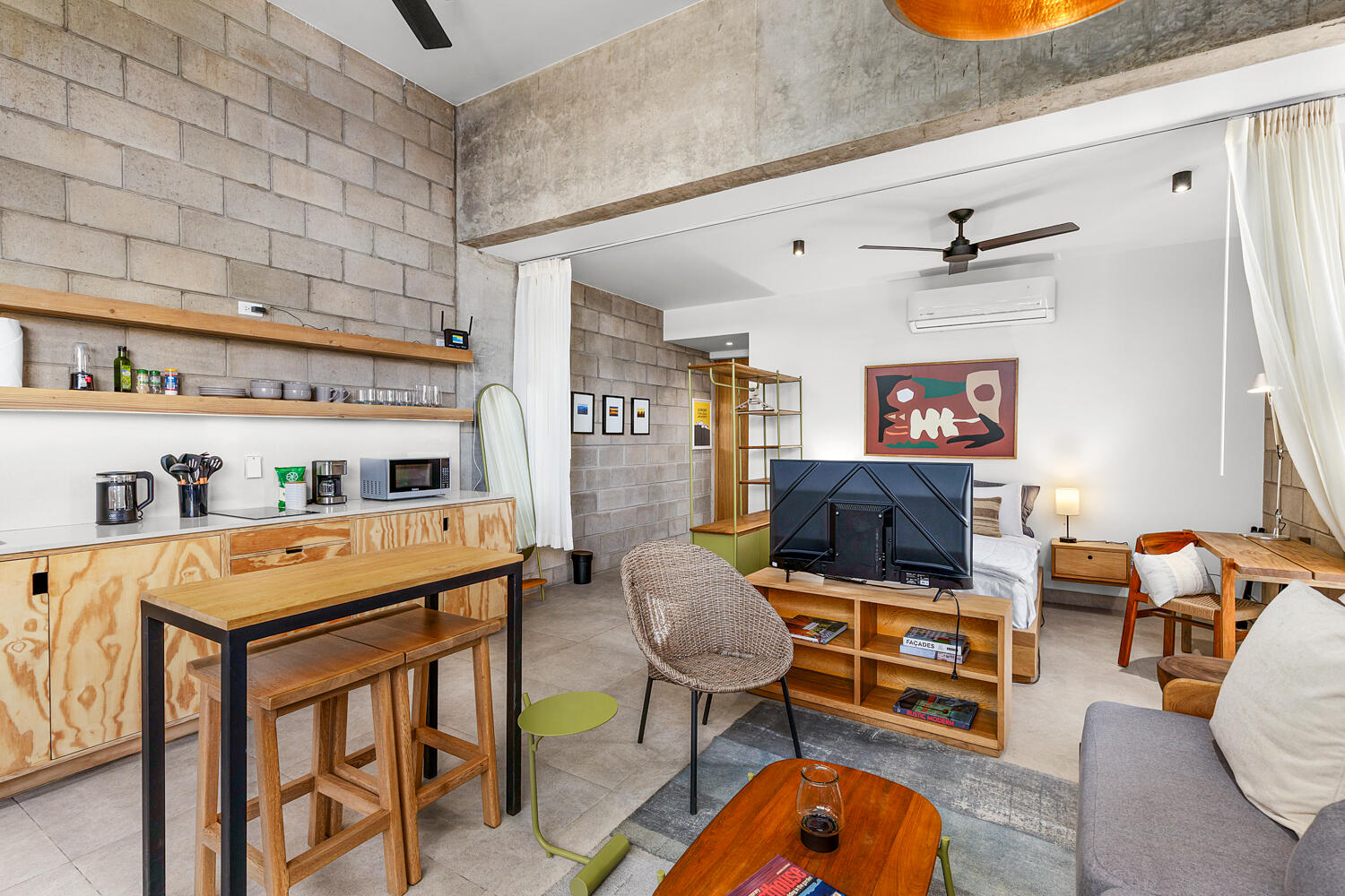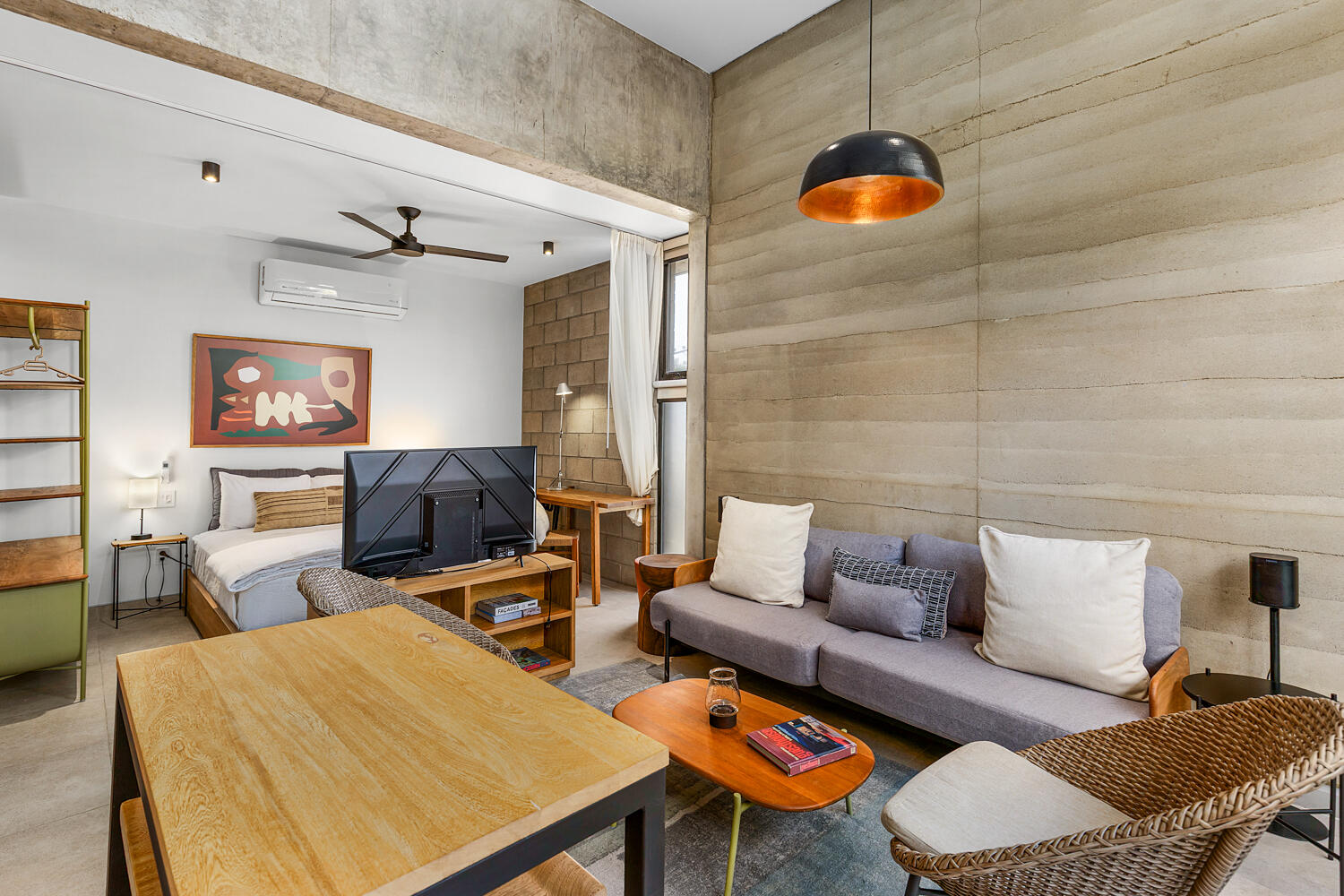 VAGO Loft 4 offers a modern living space with clean architectural lines and a thoughtful mix of concrete, steel, and wood finishes. The open layout is complemented by a private outdoor terrace, creating a comfortable balance between indoor and outdoor living. Located in a boutique seven-unit building, this loft provides a more private, low-density environment. Just steps from the San José del Cabo Arts District, you're surrounded by galleries, cafés, bars, and local boutiques that give the neighborhood its vibrant yet relaxed character.